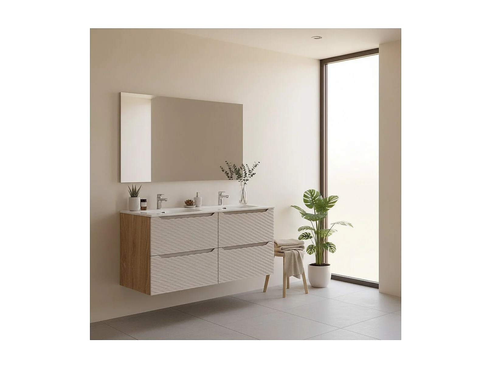 Ensemble de salle de bain YOKA beige : 2 meubles sous vasque 60cm à tiroirs + vasque à encastrer