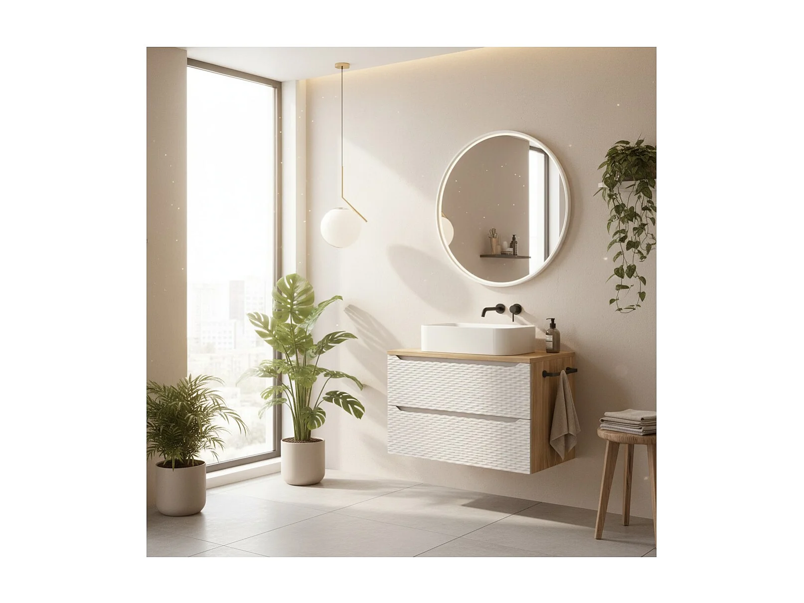 Ensemble de salle de bain YOKA beige : meuble sous vasque à tiroirs 90 cm + plan pour vasque + vasque à poser