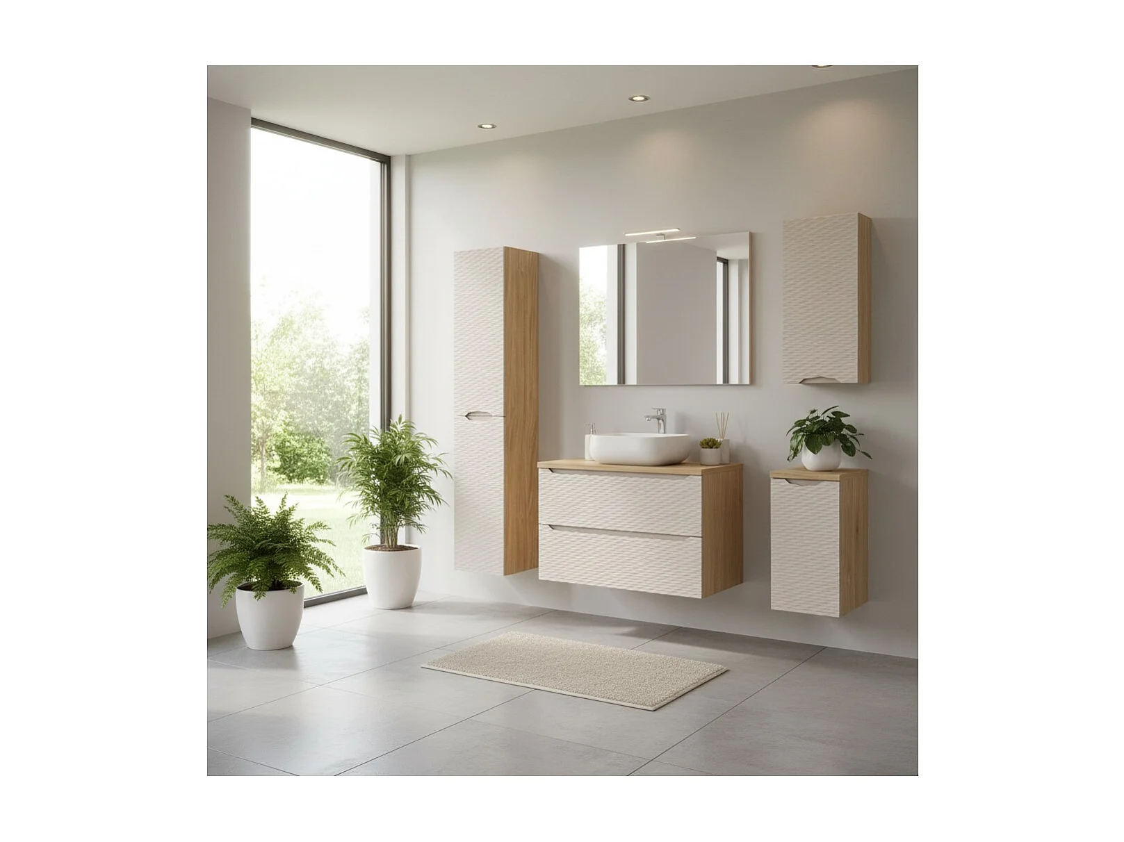 Ensemble de salle de bain YOKA beige : meuble sous vasque + plan vasque + vasque à poser + colonne de rangement + 2 meubles de r