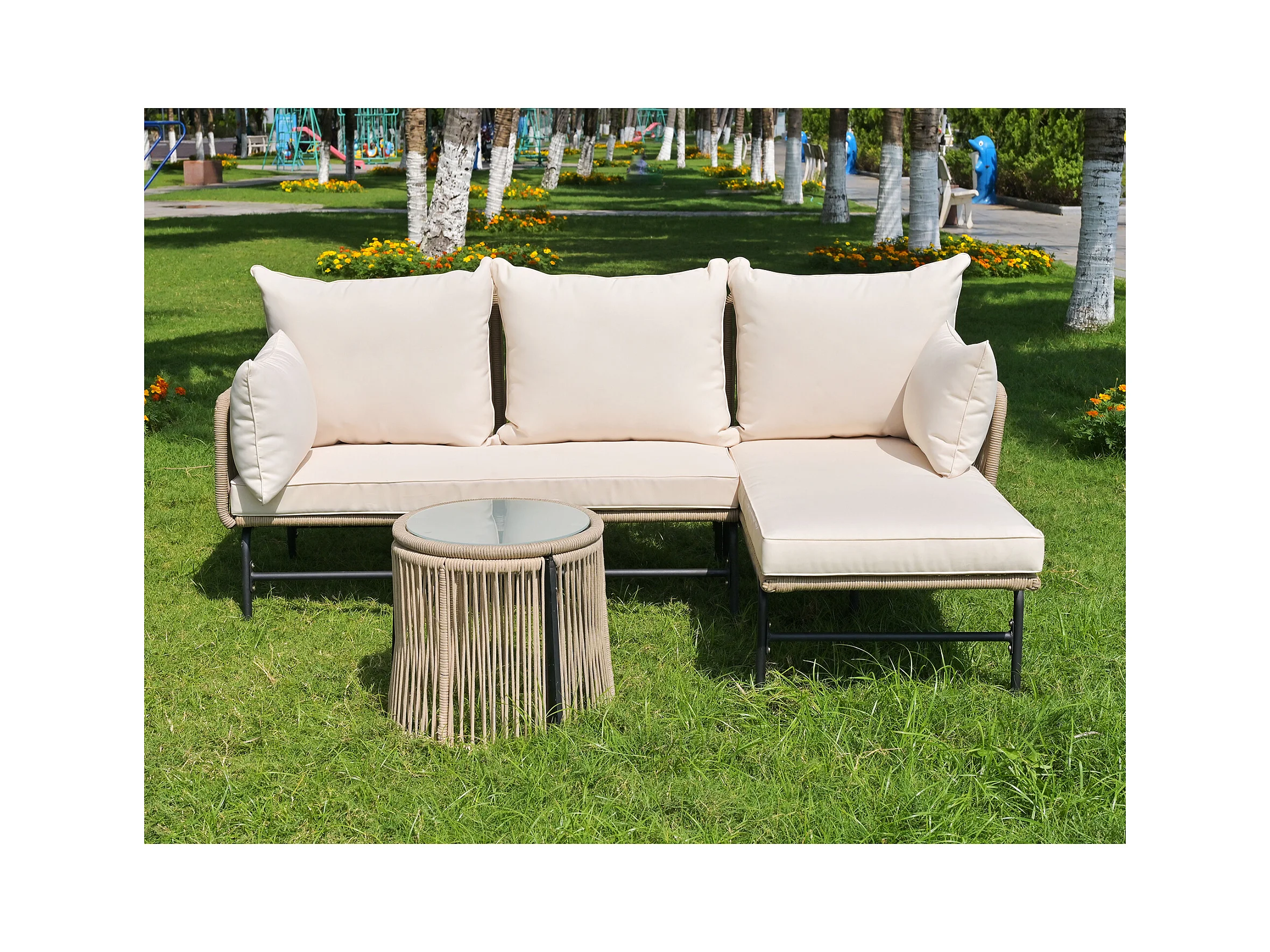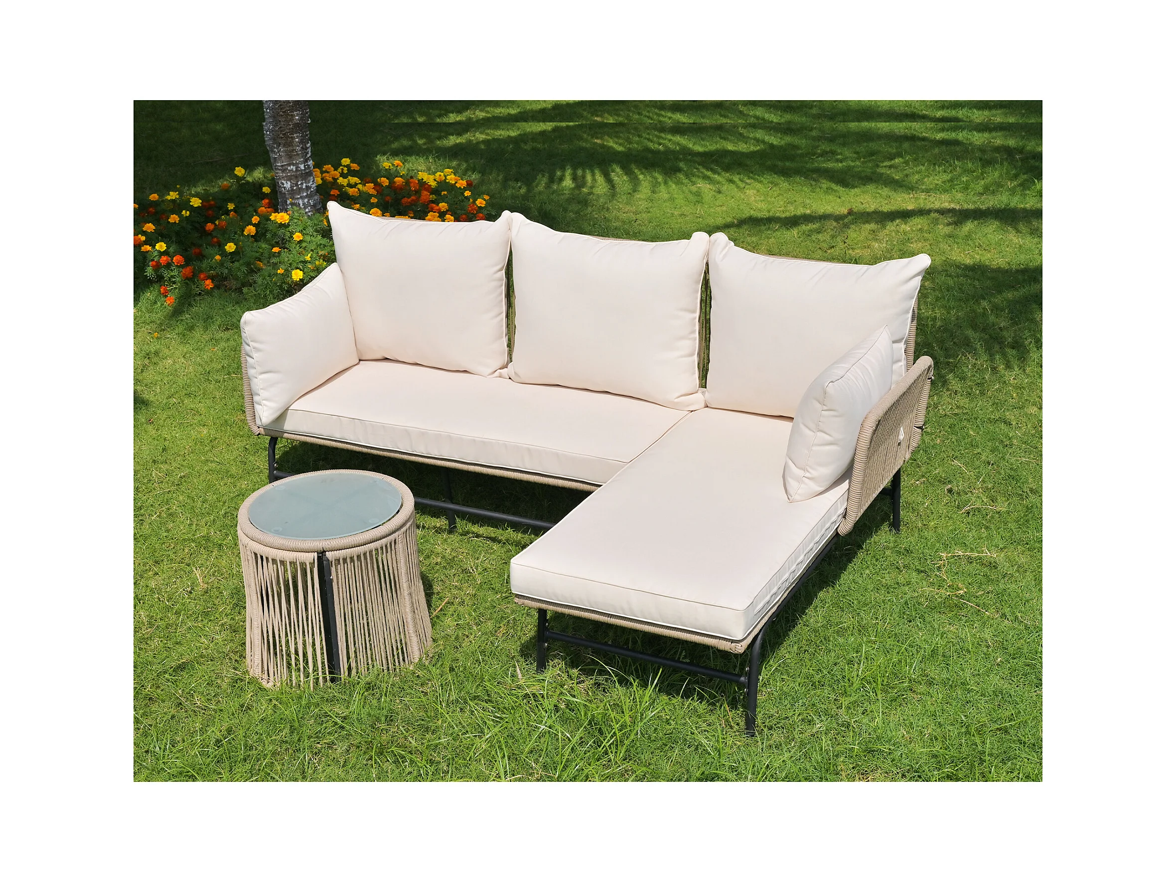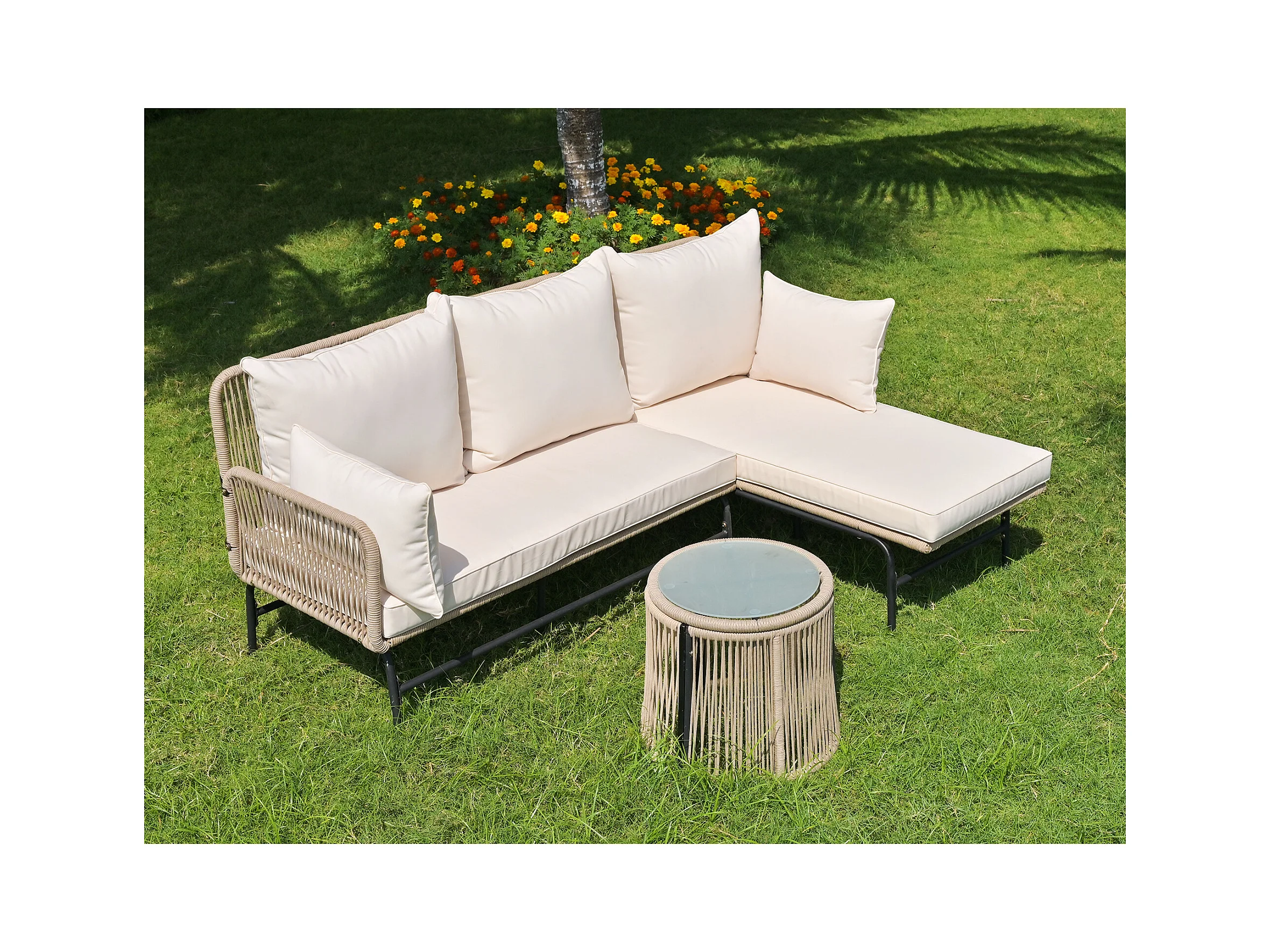 Ensemble de salon de jardin, 4 pièces, canapé L en corde beige avec cadre en fer, table en verre, coussins amovibles, pieds réglables