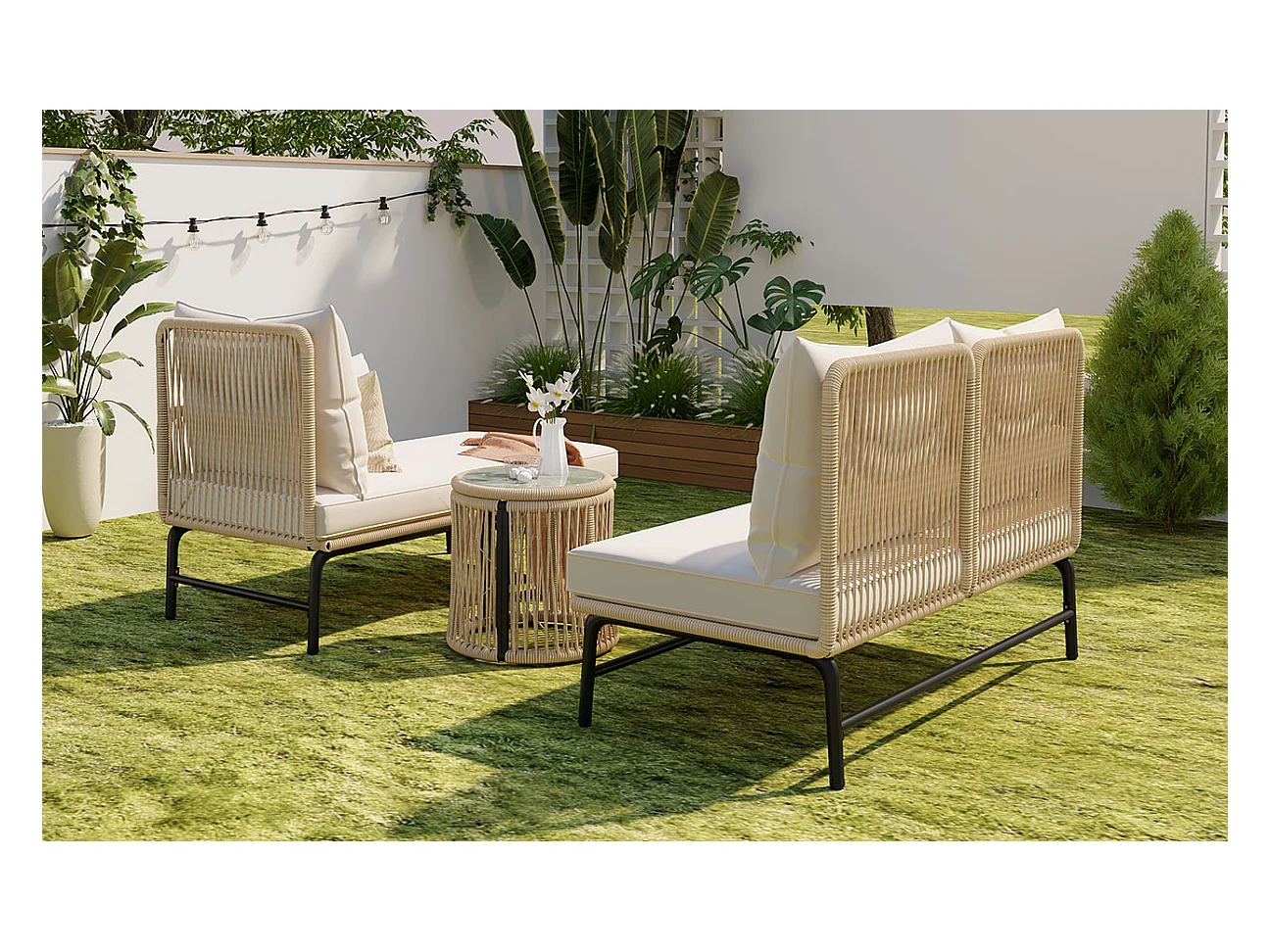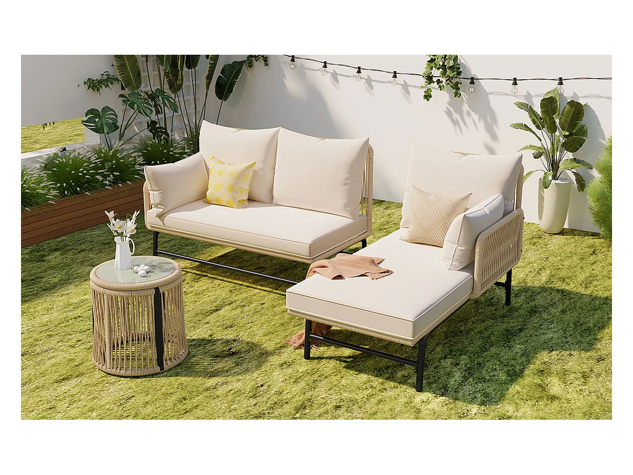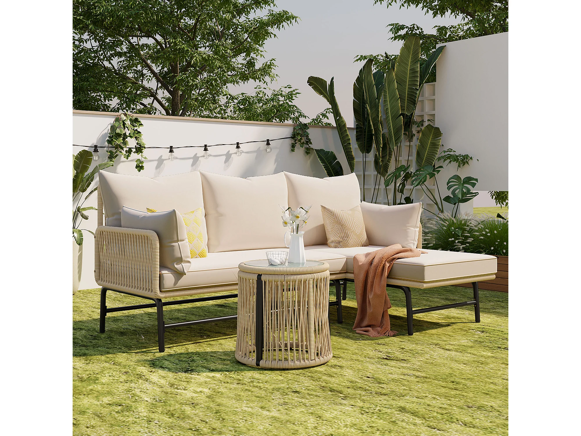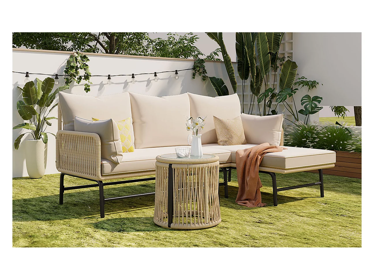 Ensemble de salon de jardin, 4 pièces, canapé L en corde beige avec cadre en fer, table en verre, coussins amovibles, pieds réglables