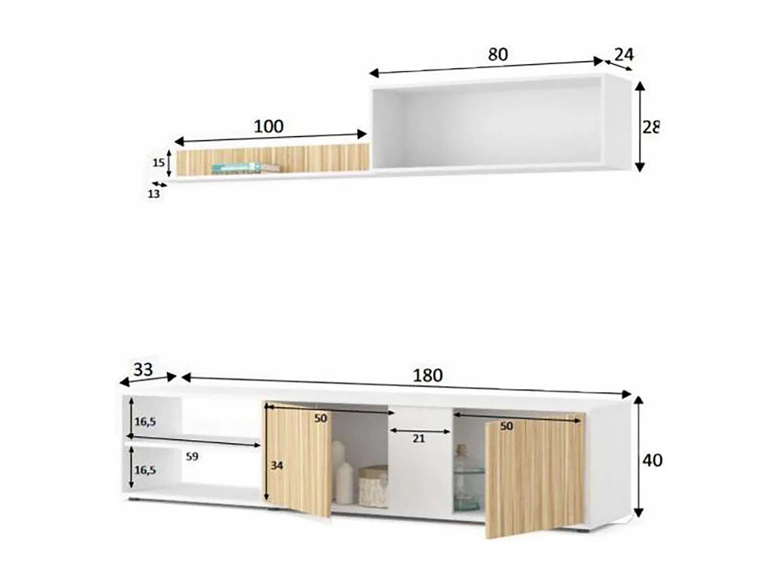 Ensemble de salon (meuble TV, 1 meubles haut, étagère murale) Meuble séjour coloris Blanc/chêne