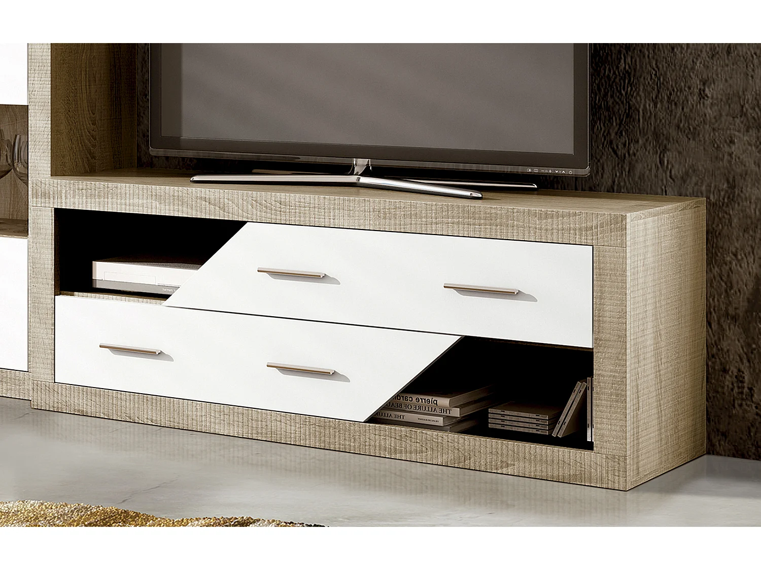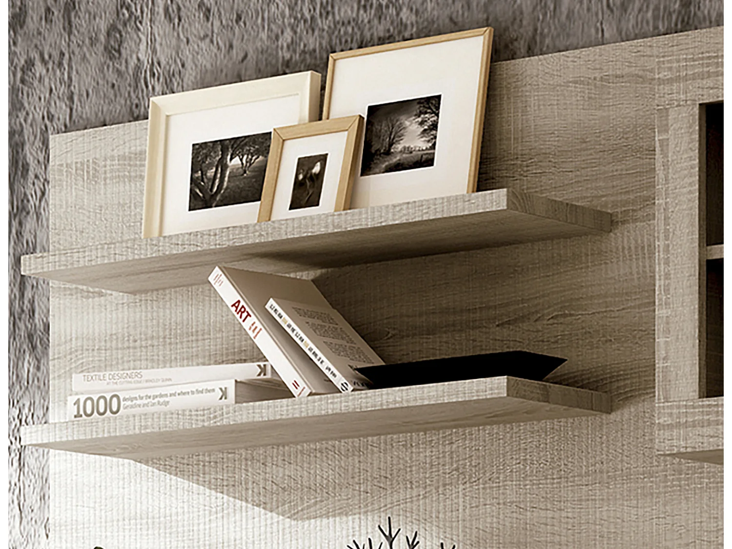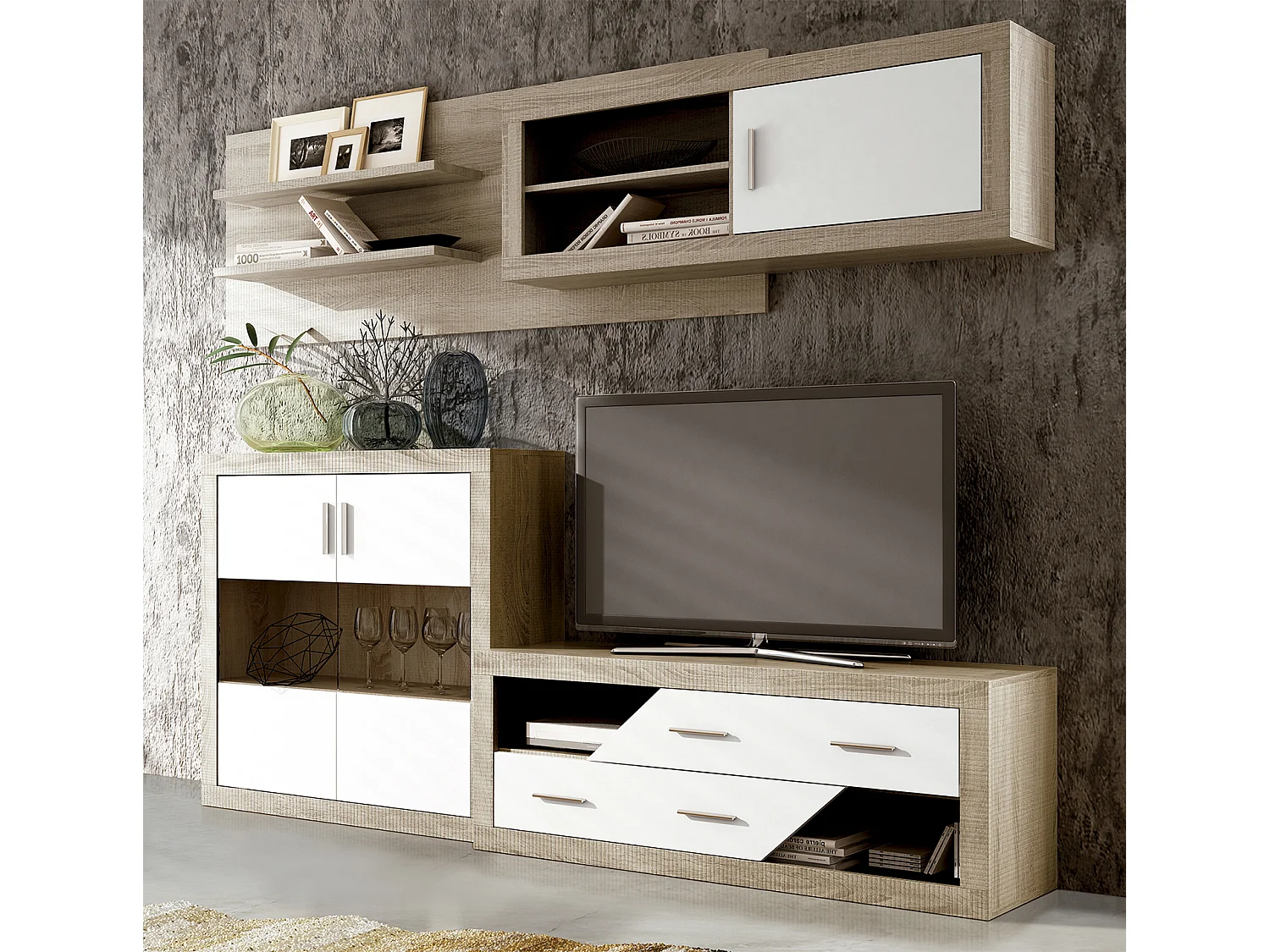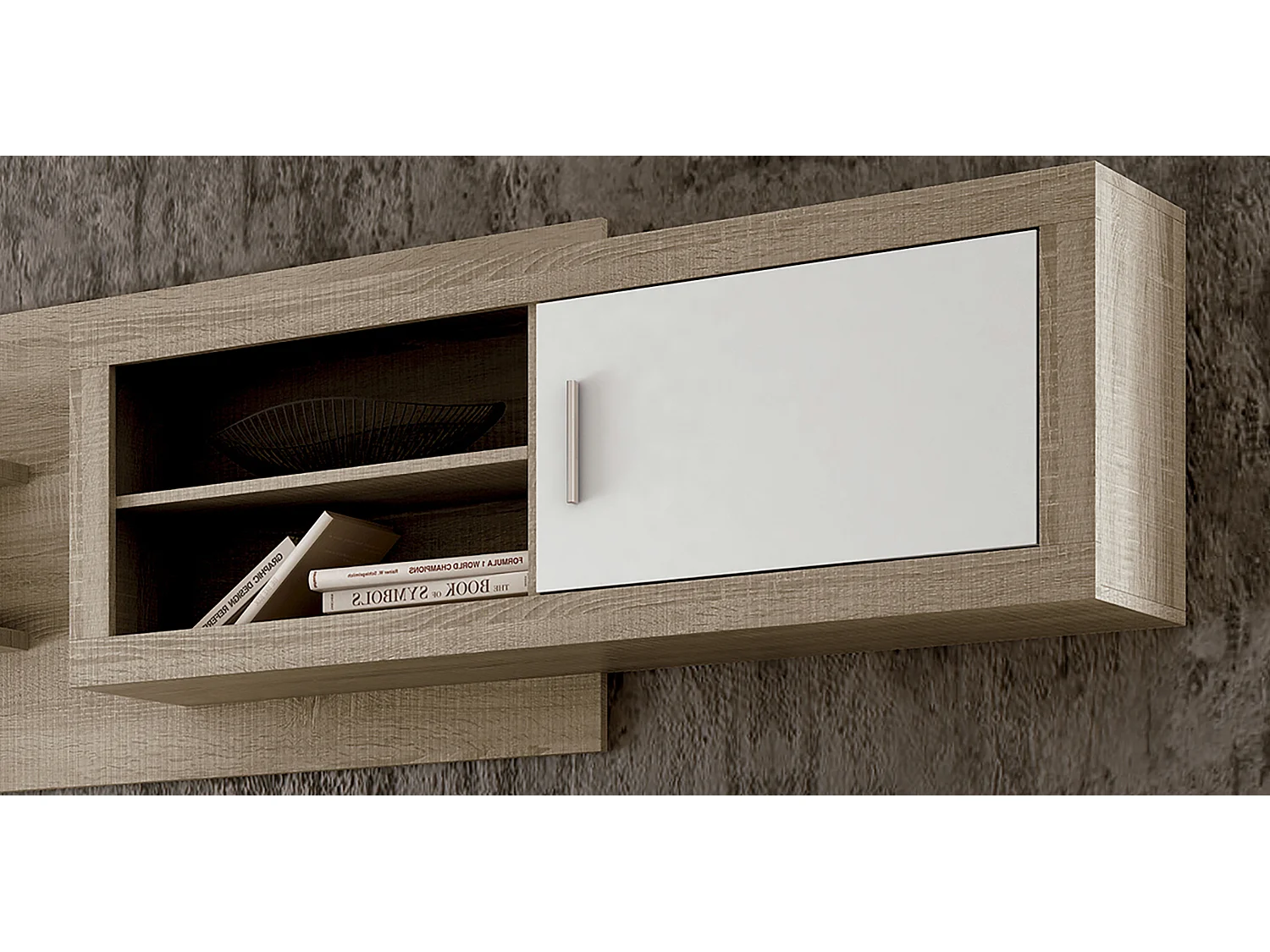 Ensemble de salon, meuble TV + set de 2 étagères murales + meuble haut + buffet coloris chêne cambrian, blanc