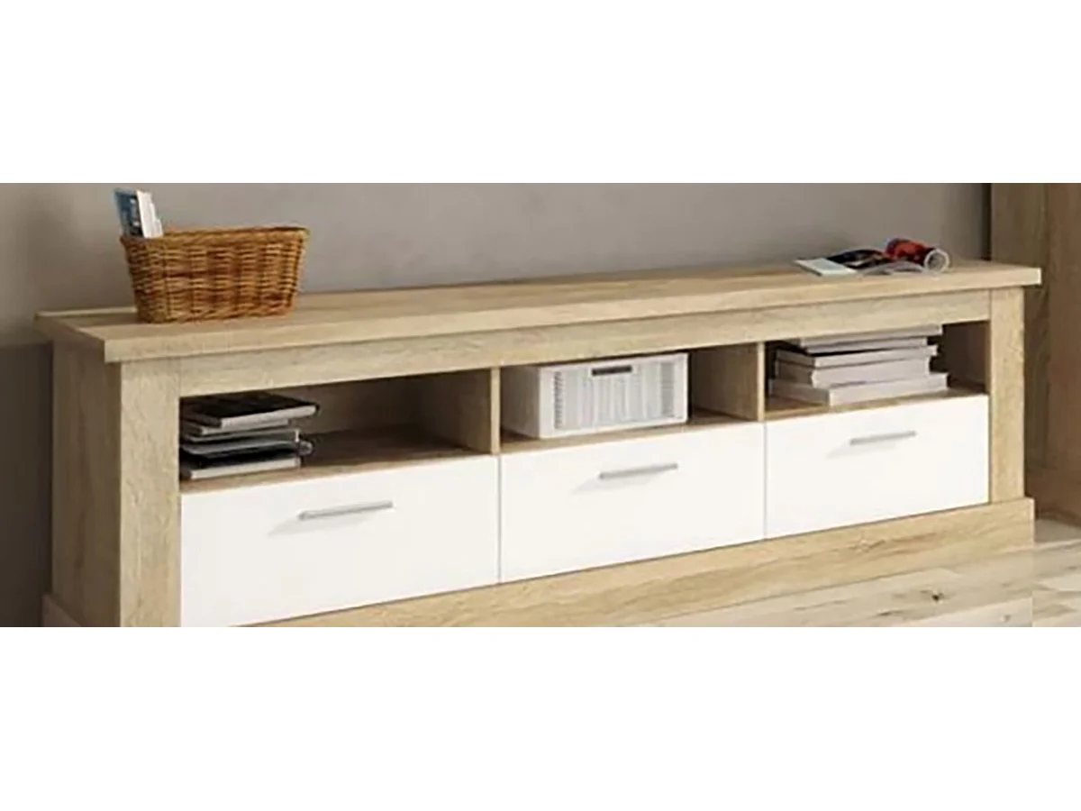 Ensemble de salon meuble TV + vitrine basse + panneau TV coloris chêne cambrian, blanc