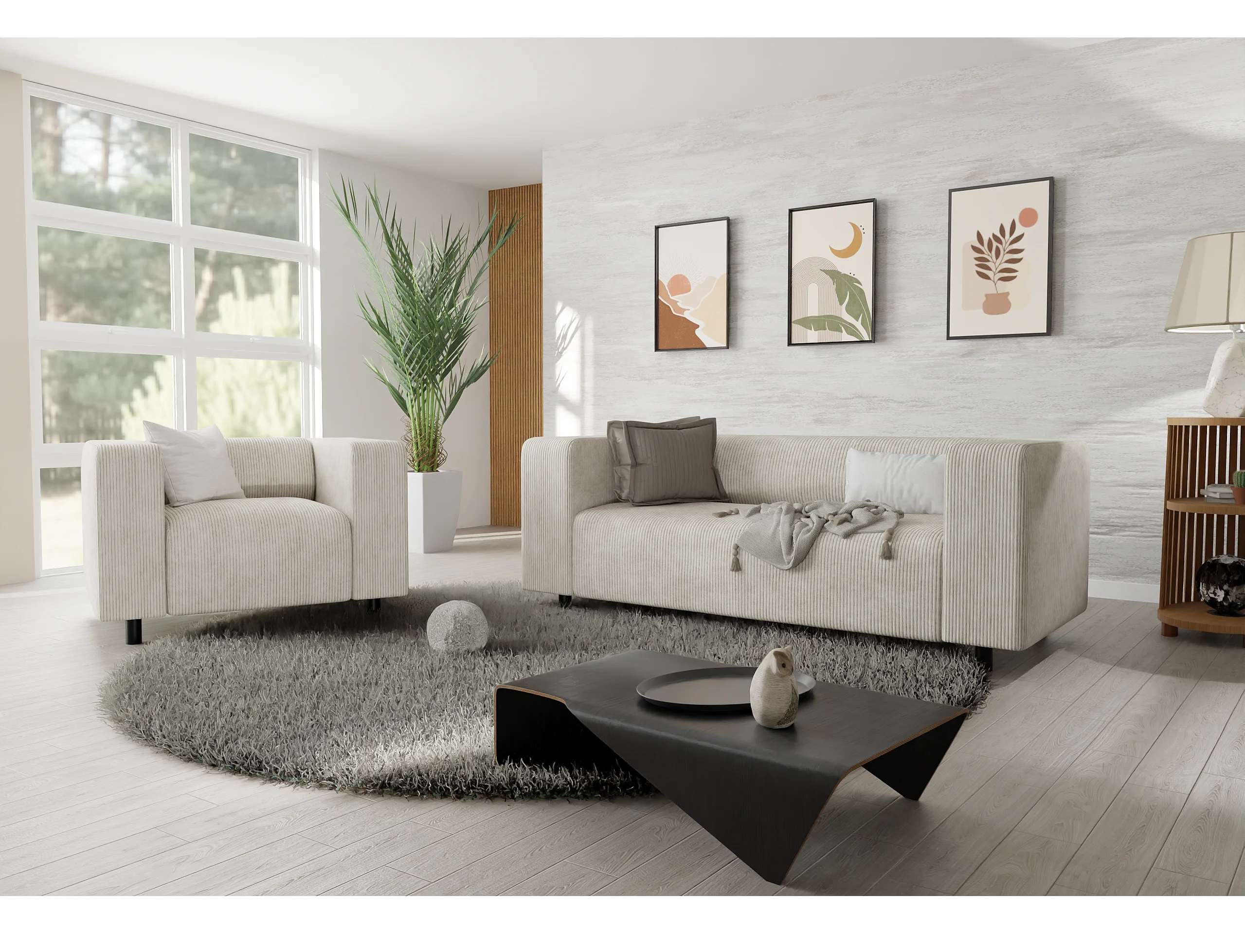 Ensemble de sièges moderne 2+1 en velours côtelé beige avec assise confortable THORA