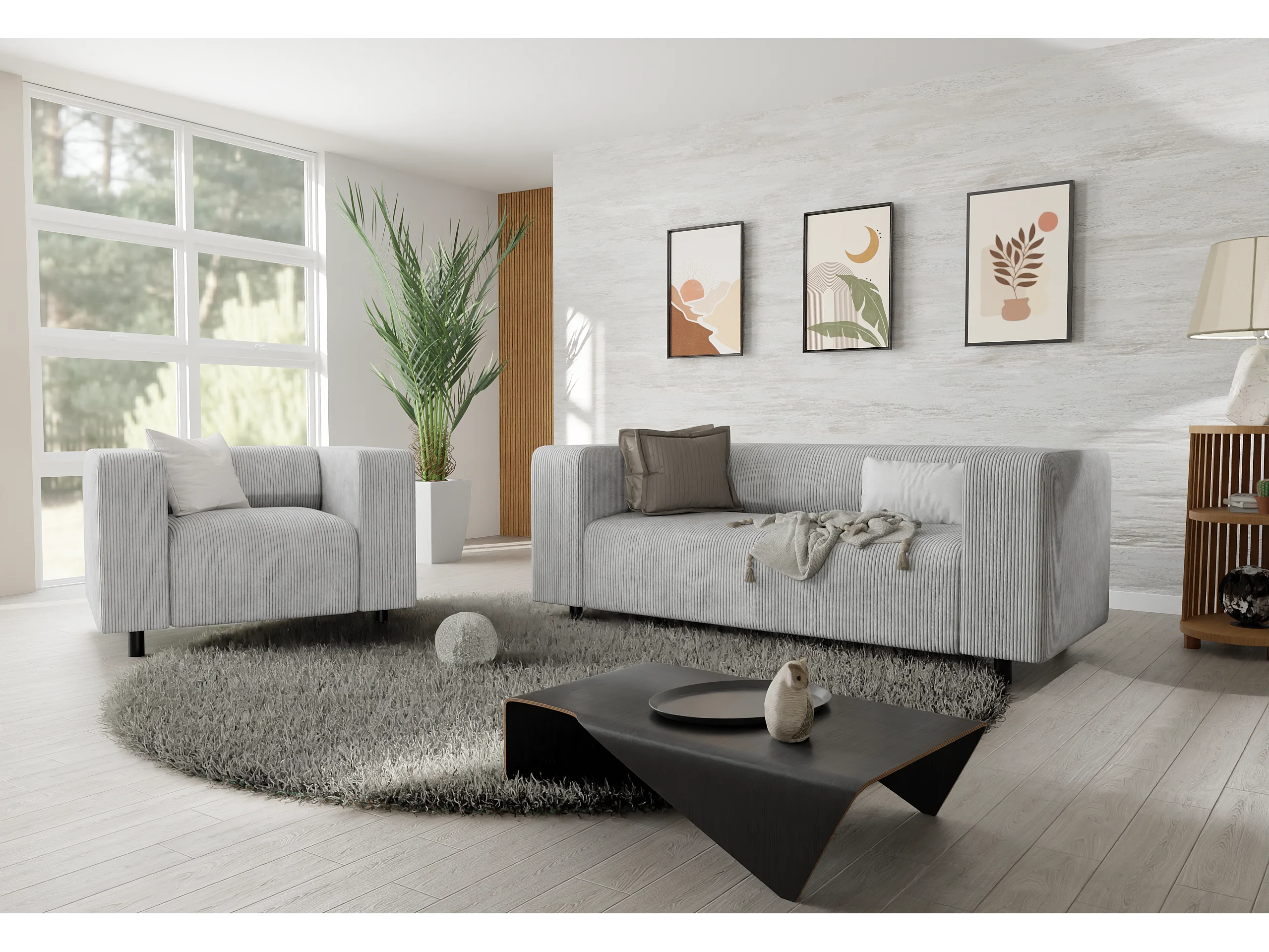 Ensemble de sièges moderne 2+1 en velours côtelé gris clair avec assise confortable THORA