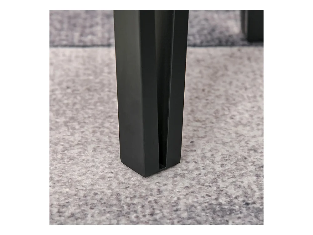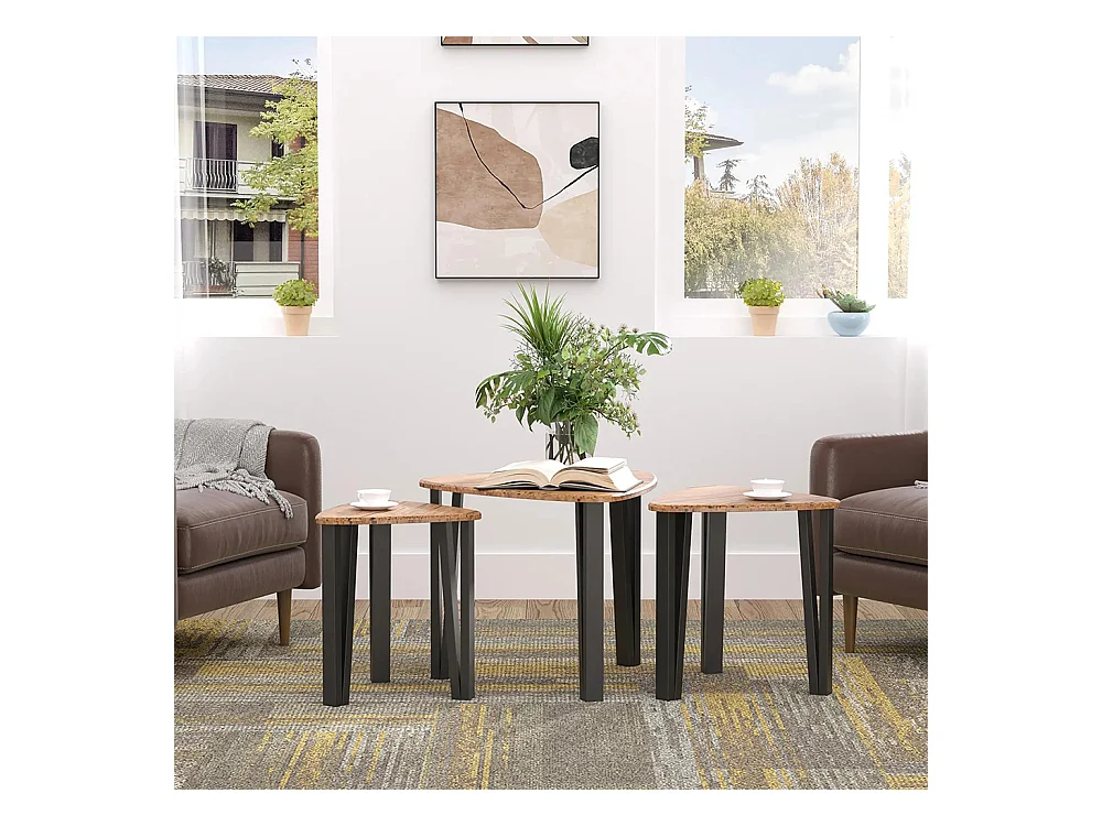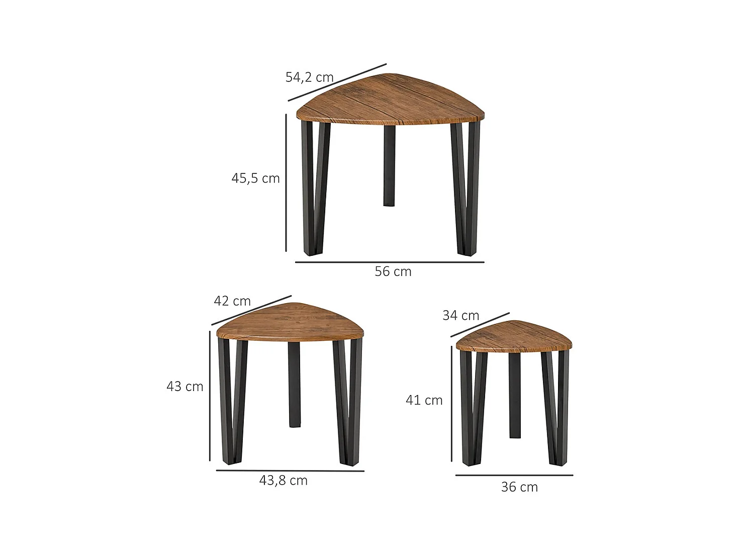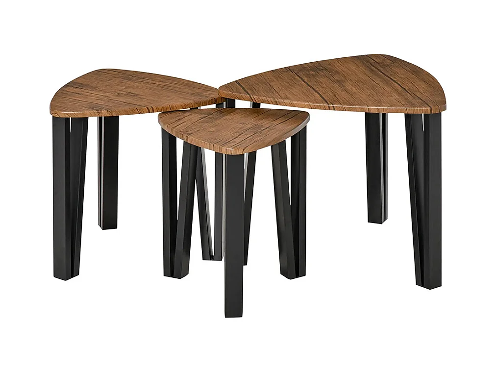 Ensemble de table basse encastrable 3 pièces, pieds métalliques noirs, design en forme de coin, plateau en bois de noyer.