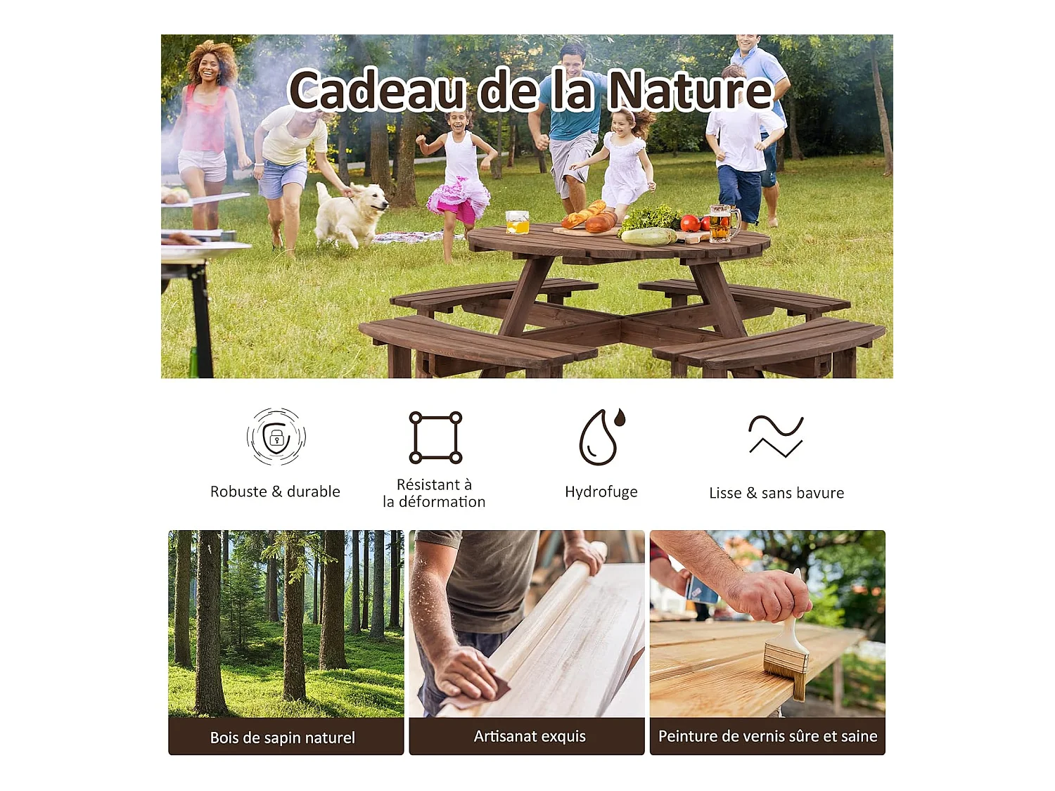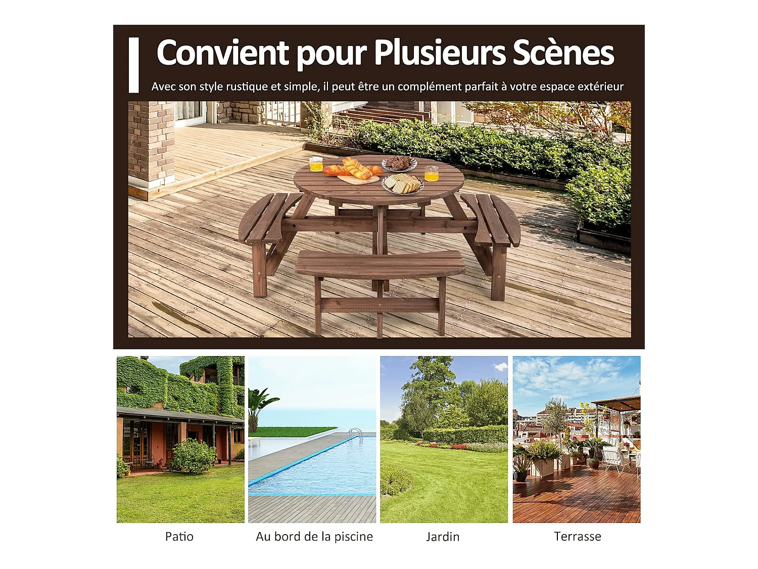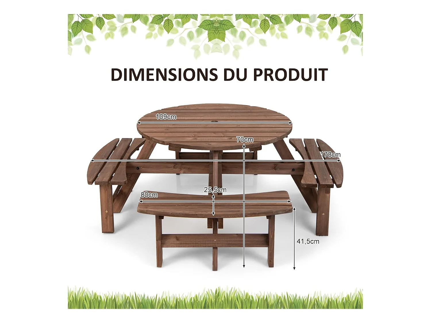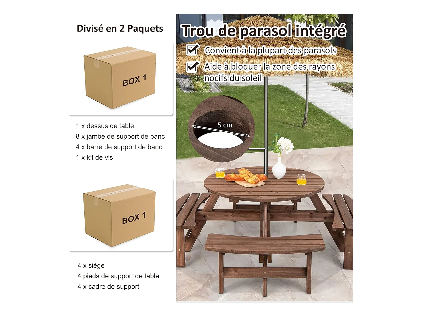 Ensemble Table de Pique-Nique en Bois avec Trou de Parasol, Set Table et Banc Jardin Résistant aux Intempéries Chaque Banc Charge 225 KG pour 8 Personnes, pour Patio Pelouse