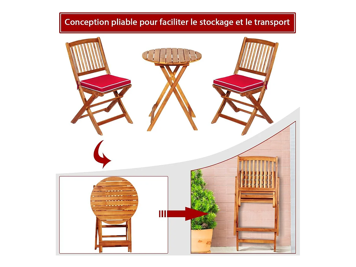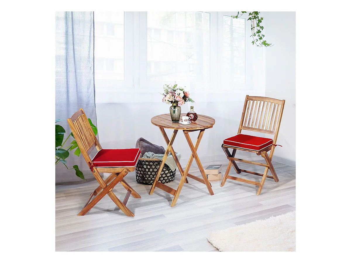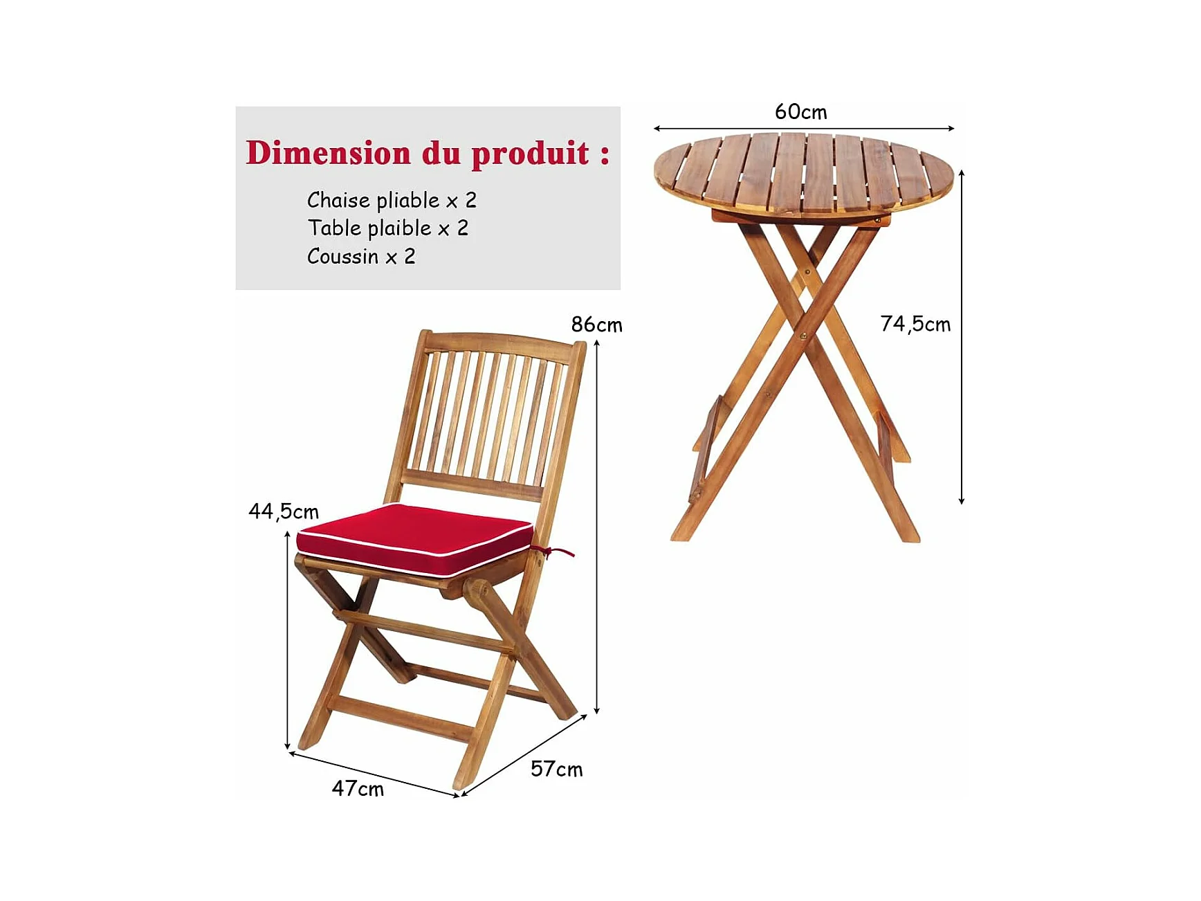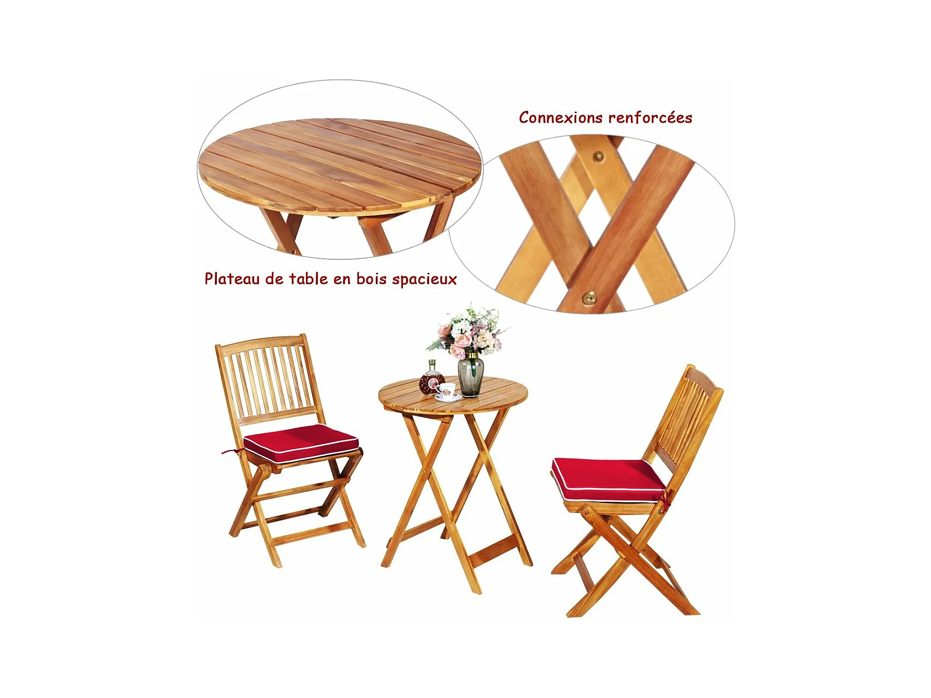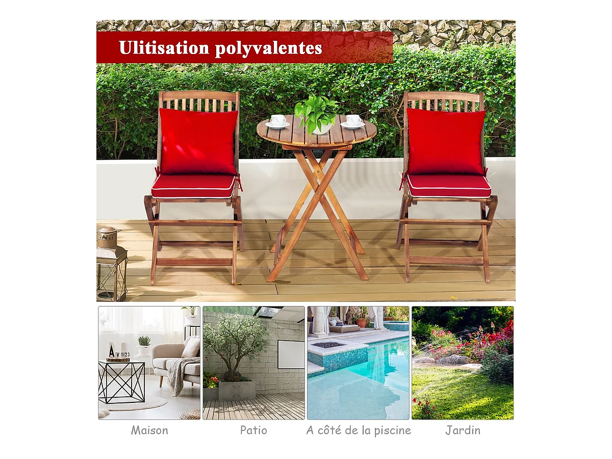 Ensemble de Table et 2 Chaises en Bois d’Acacia, Coussins Rembourrés, Ensemble de Mobilier de Jardin pour Intérieur et Extérieur (Rouge+Naturel)
