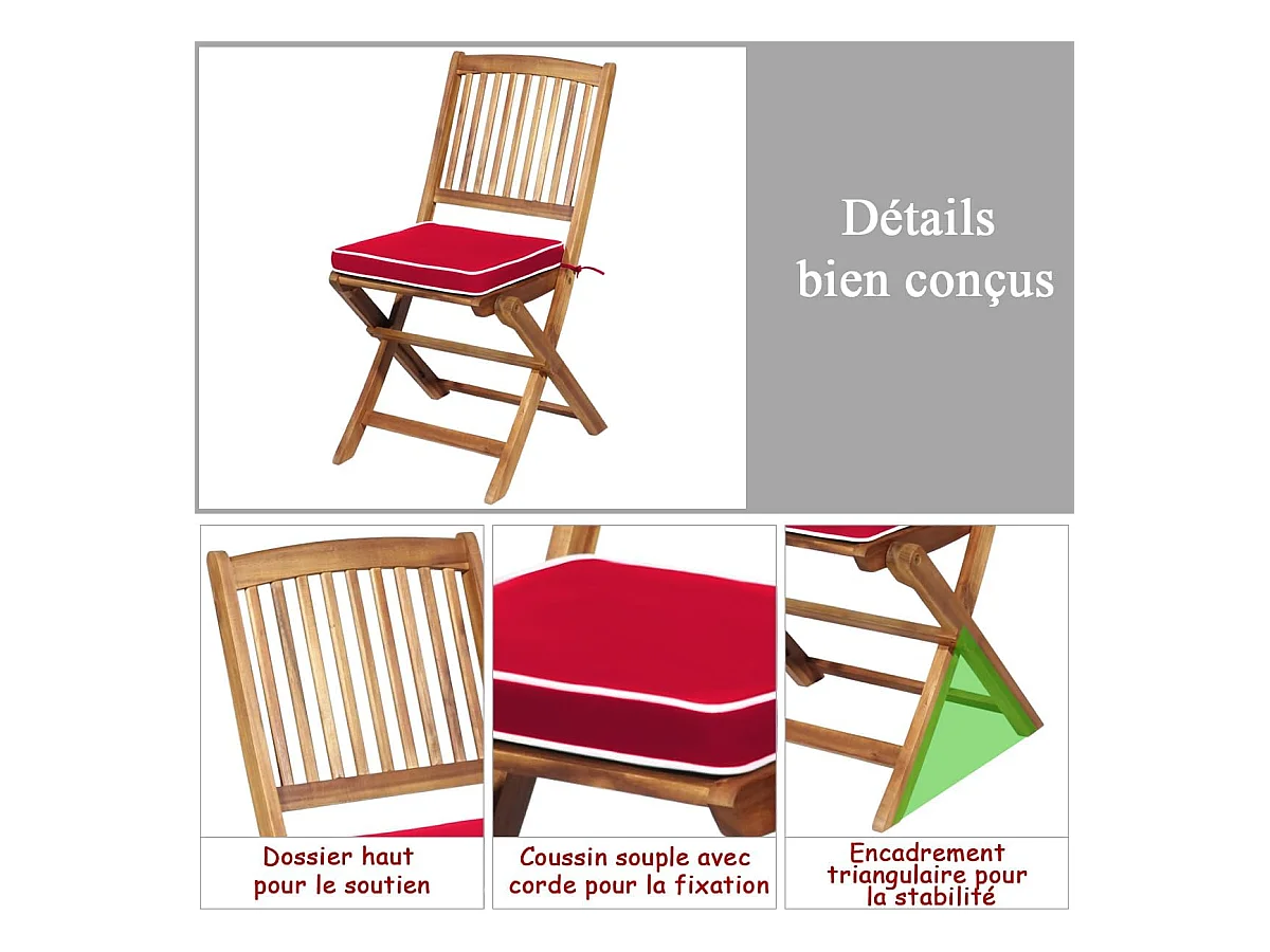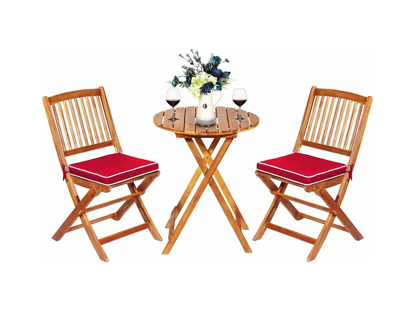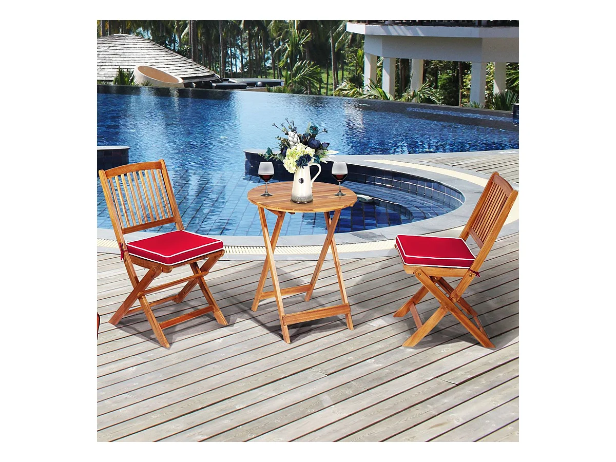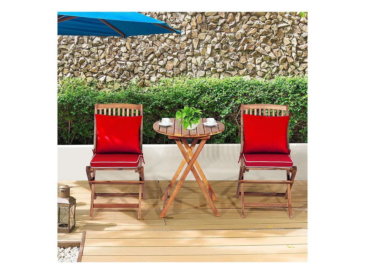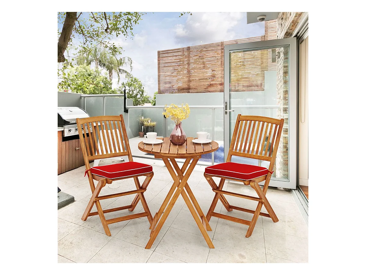 Ensemble de Table et 2 Chaises en Bois d’Acacia, Coussins Rembourrés, Ensemble de Mobilier de Jardin pour Intérieur et Extérieur (Rouge+Naturel)