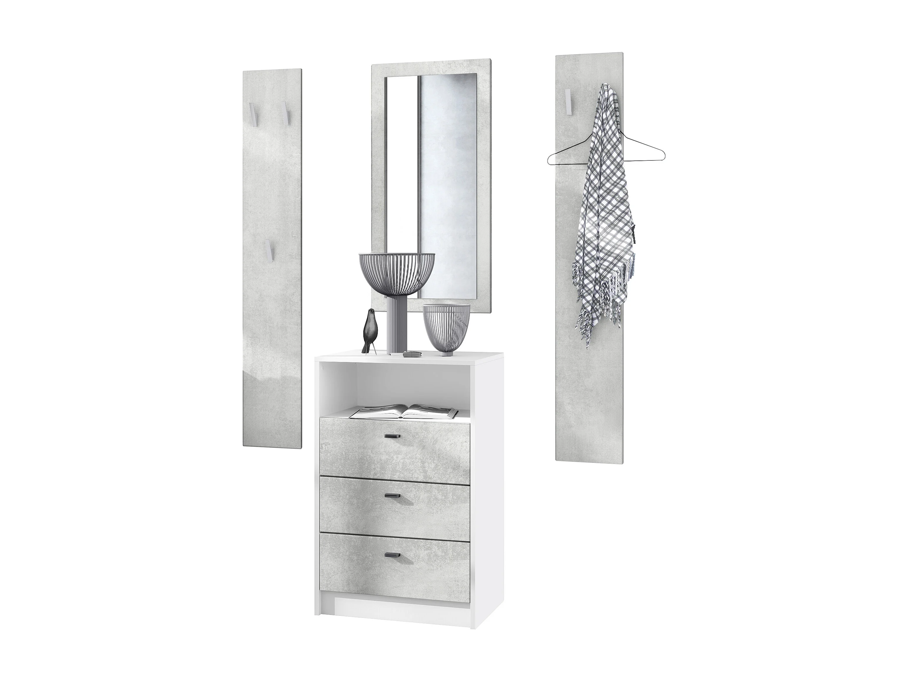 Ensemble de vestiaires Pino V2, 2 Panneaux muraux 140 cm et buffet avec 2 tiroirs & 1 compartiment ouvert, blanc mat/aspect béton oxyde (56 x 67,5 x 36 cm)