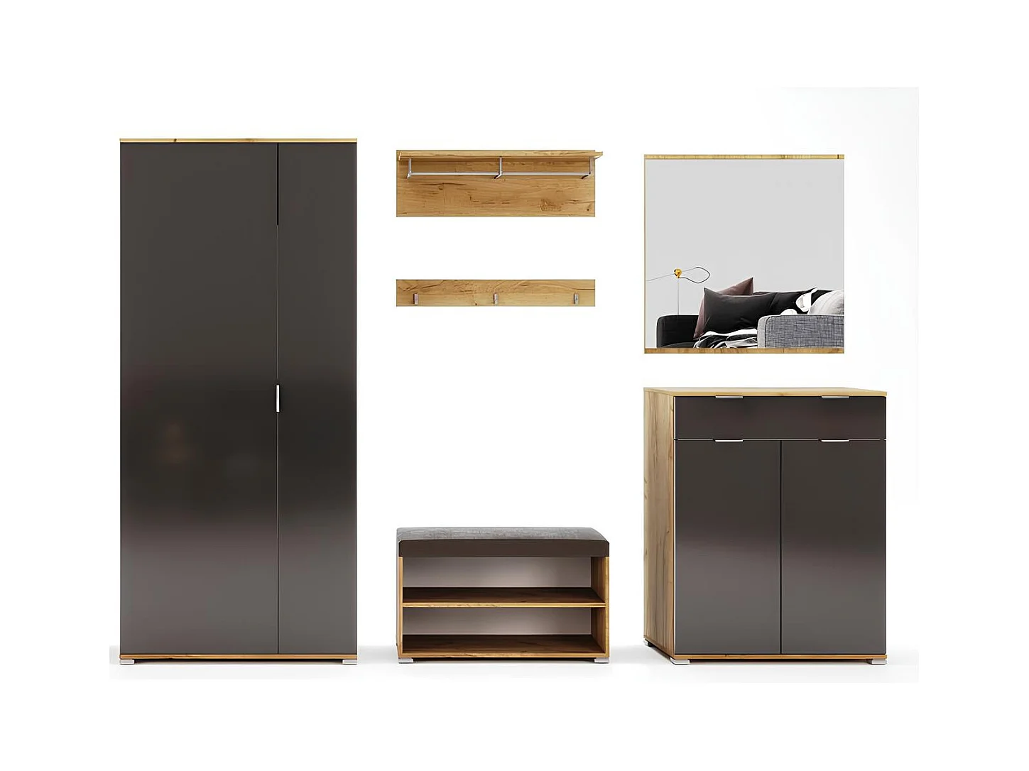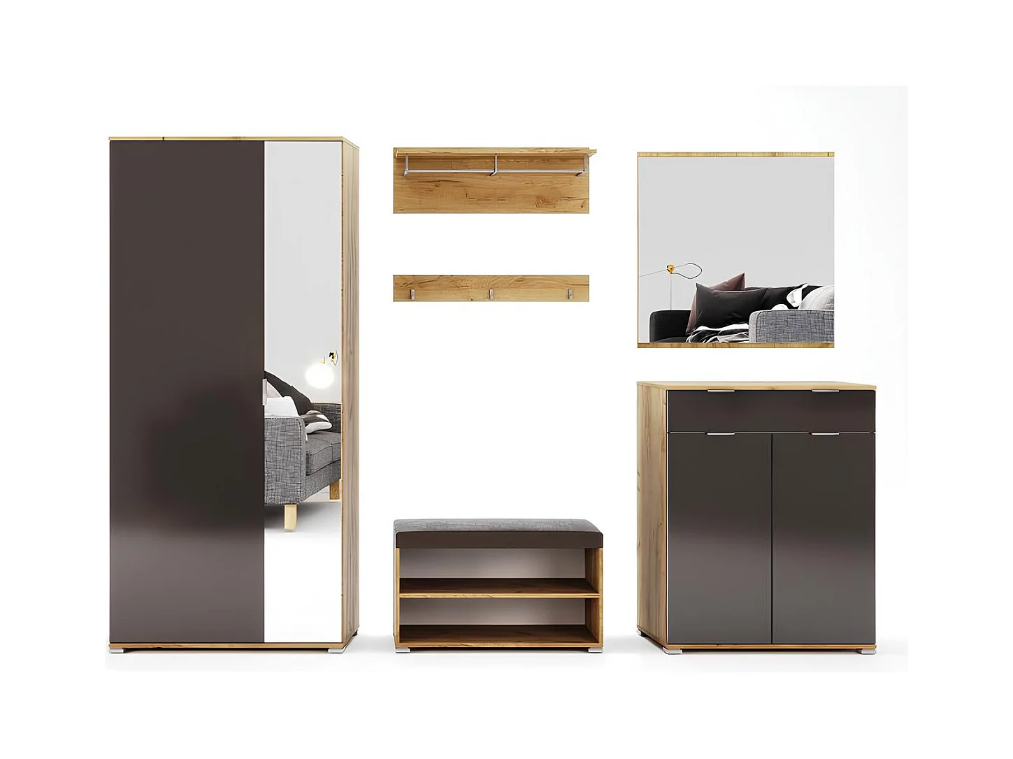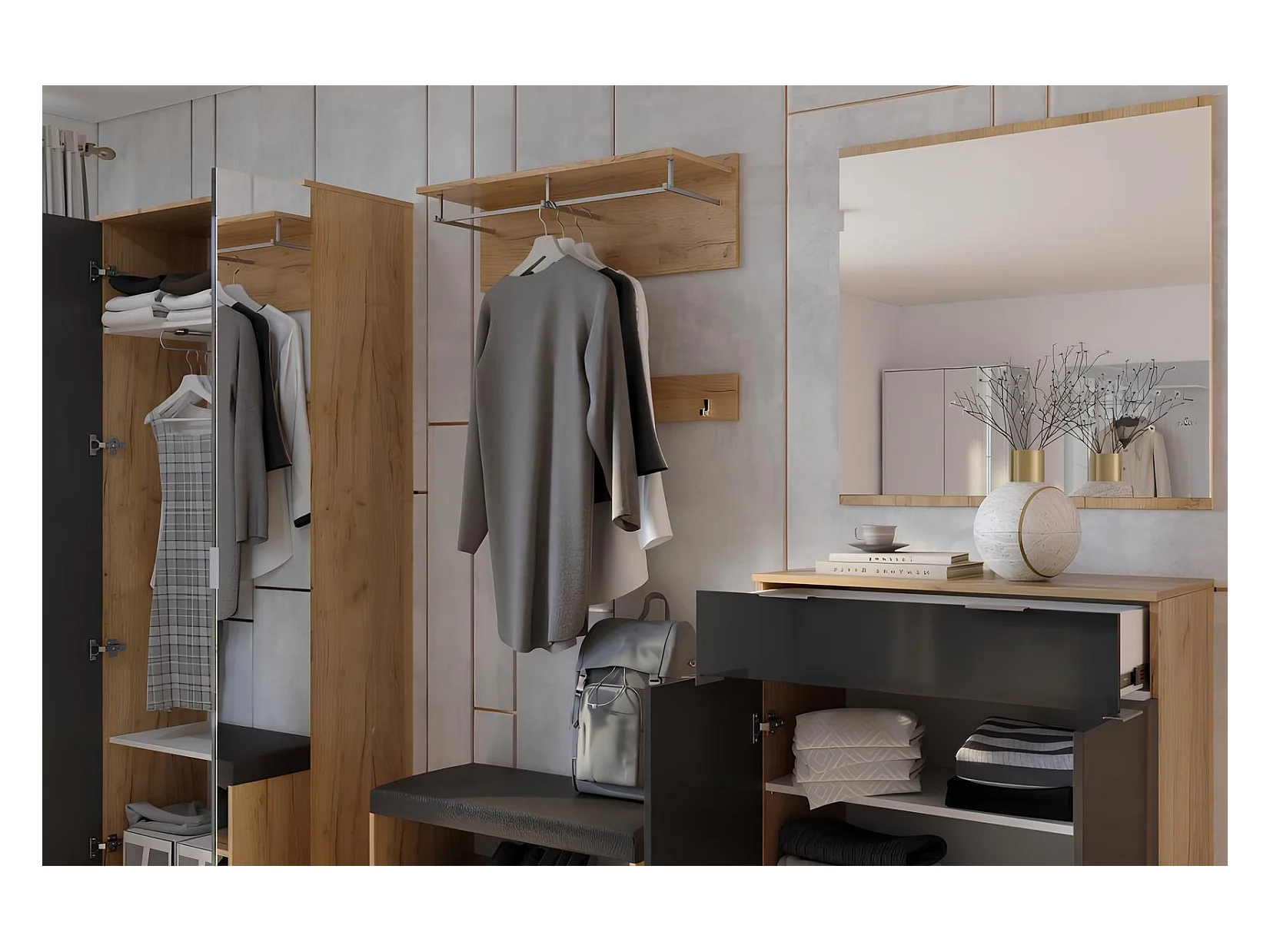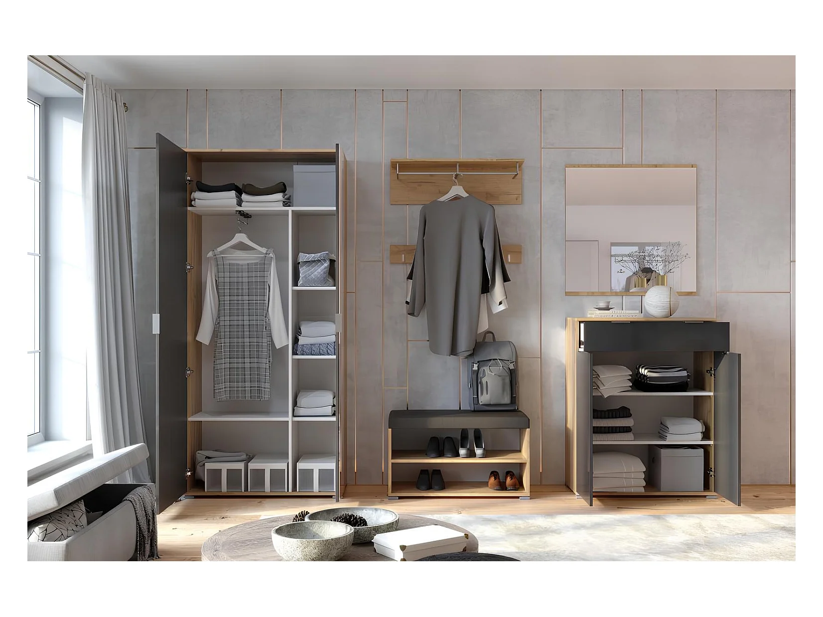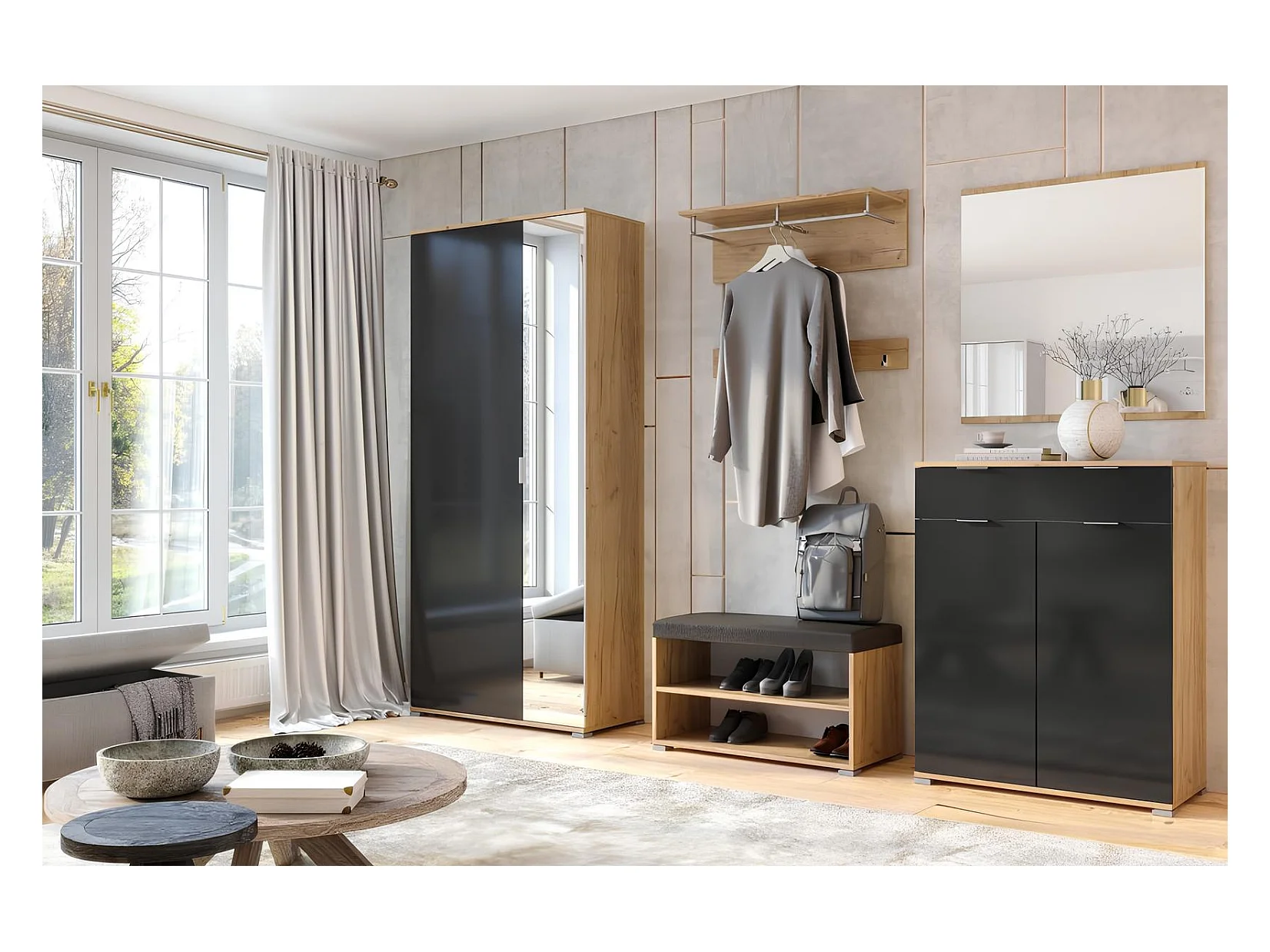 Ensemble d'entrée vestiaire avec miroir, commode, armoire et banc chaussures LUNE chêne-lave 2,2 m
