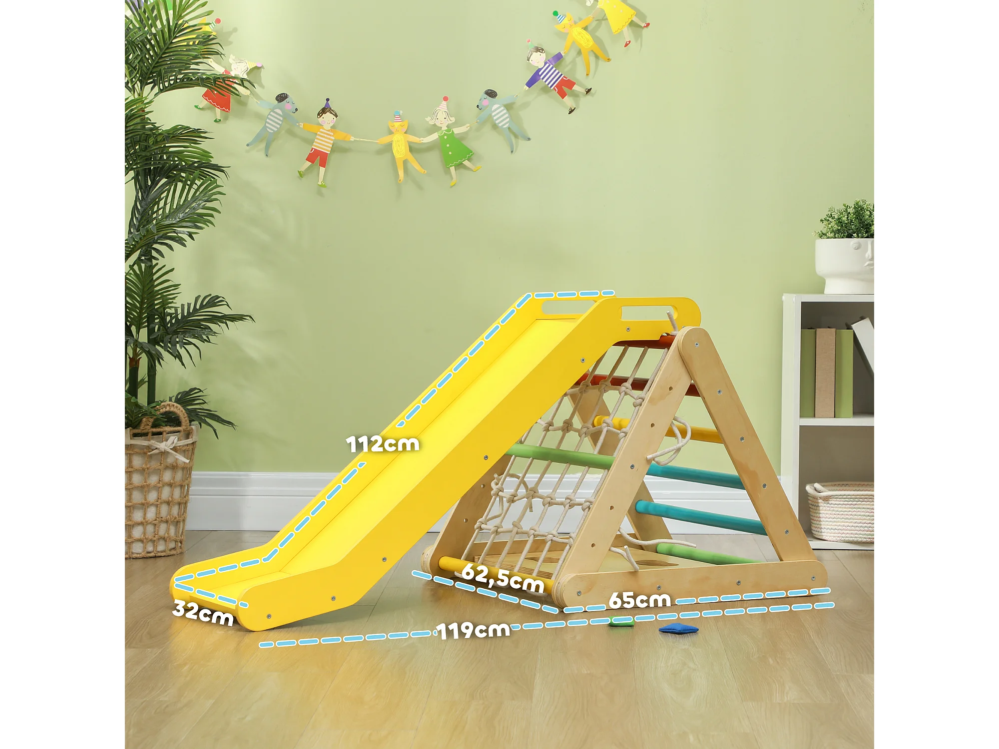 Ensemble d'escalade en bois 5 en 1 - triangle Pikler, toboggan, filet à grimper, rampe, jeu adresse - panneaux bois pin