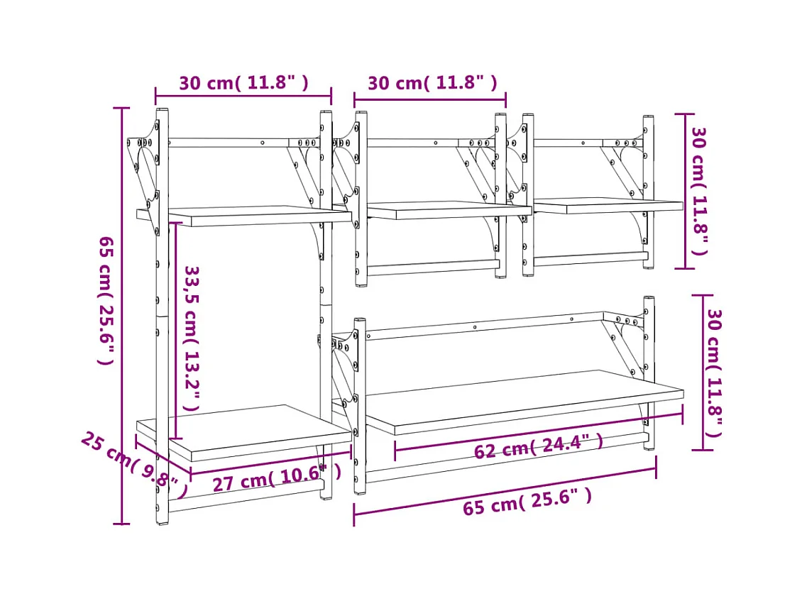 Étagères murales à 2 niveaux avec barres 2 pcs noir 30x25x65 cm