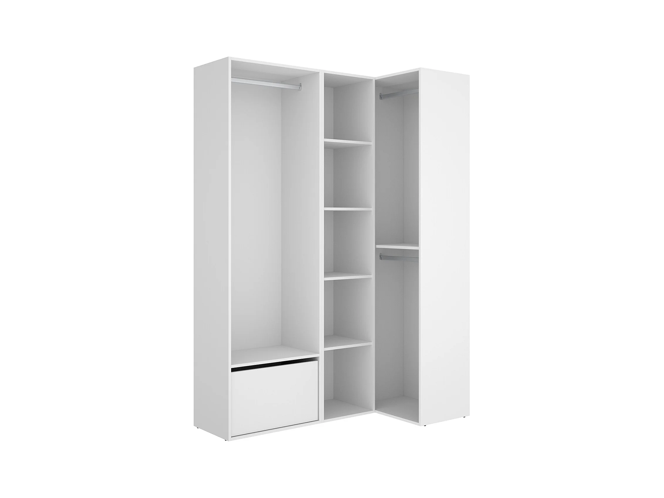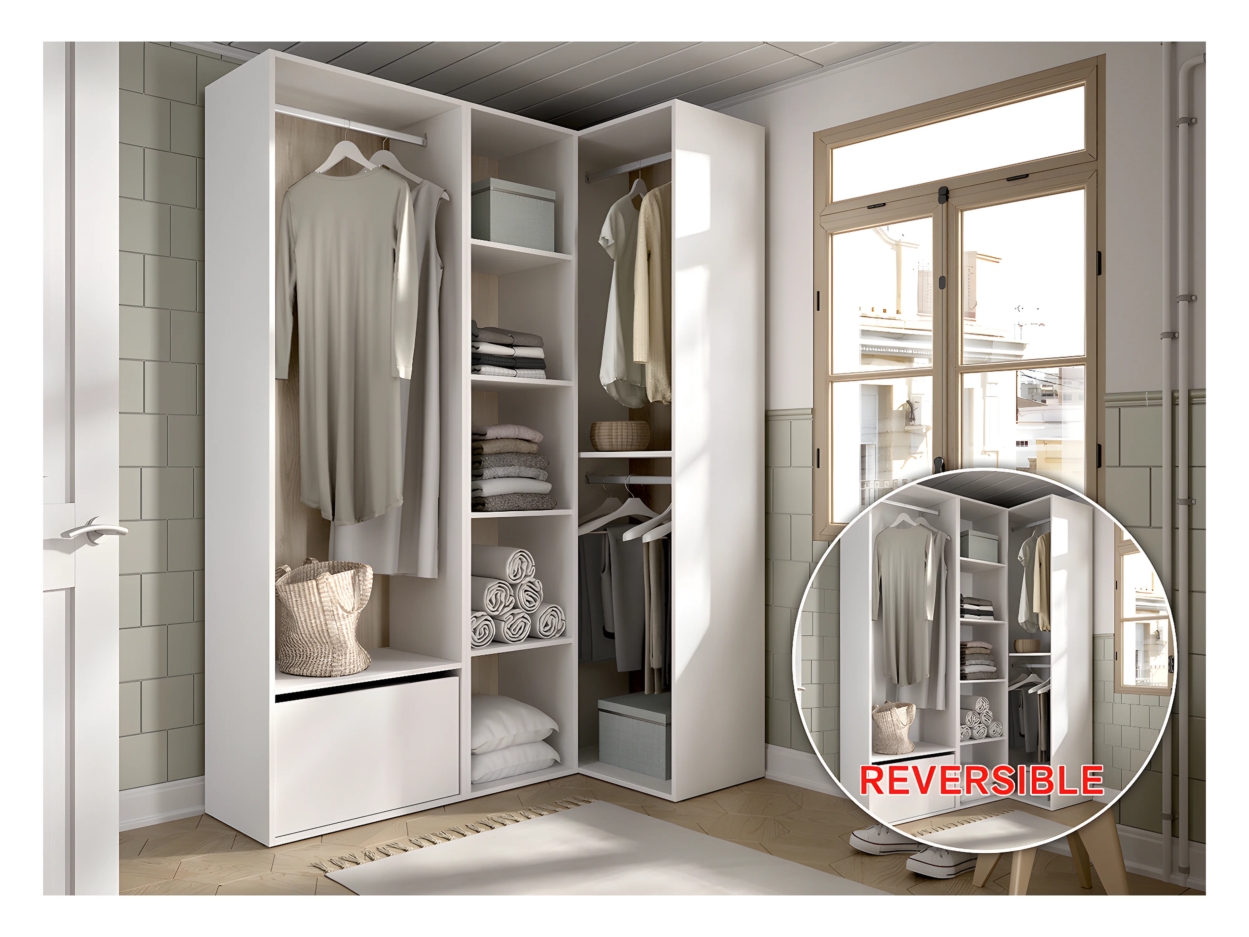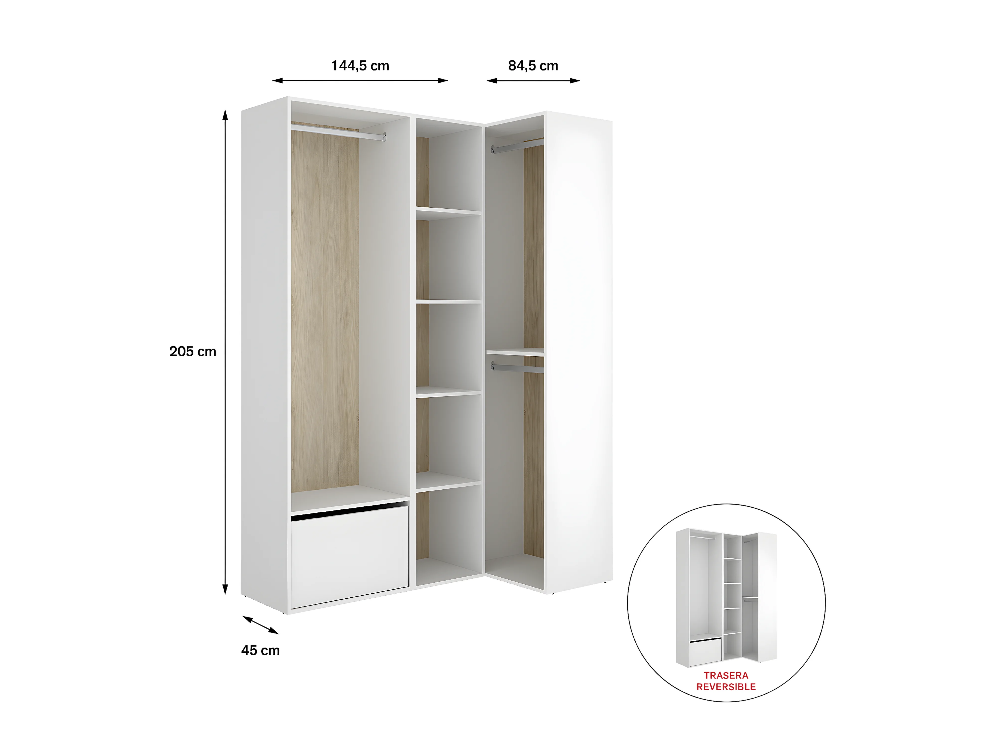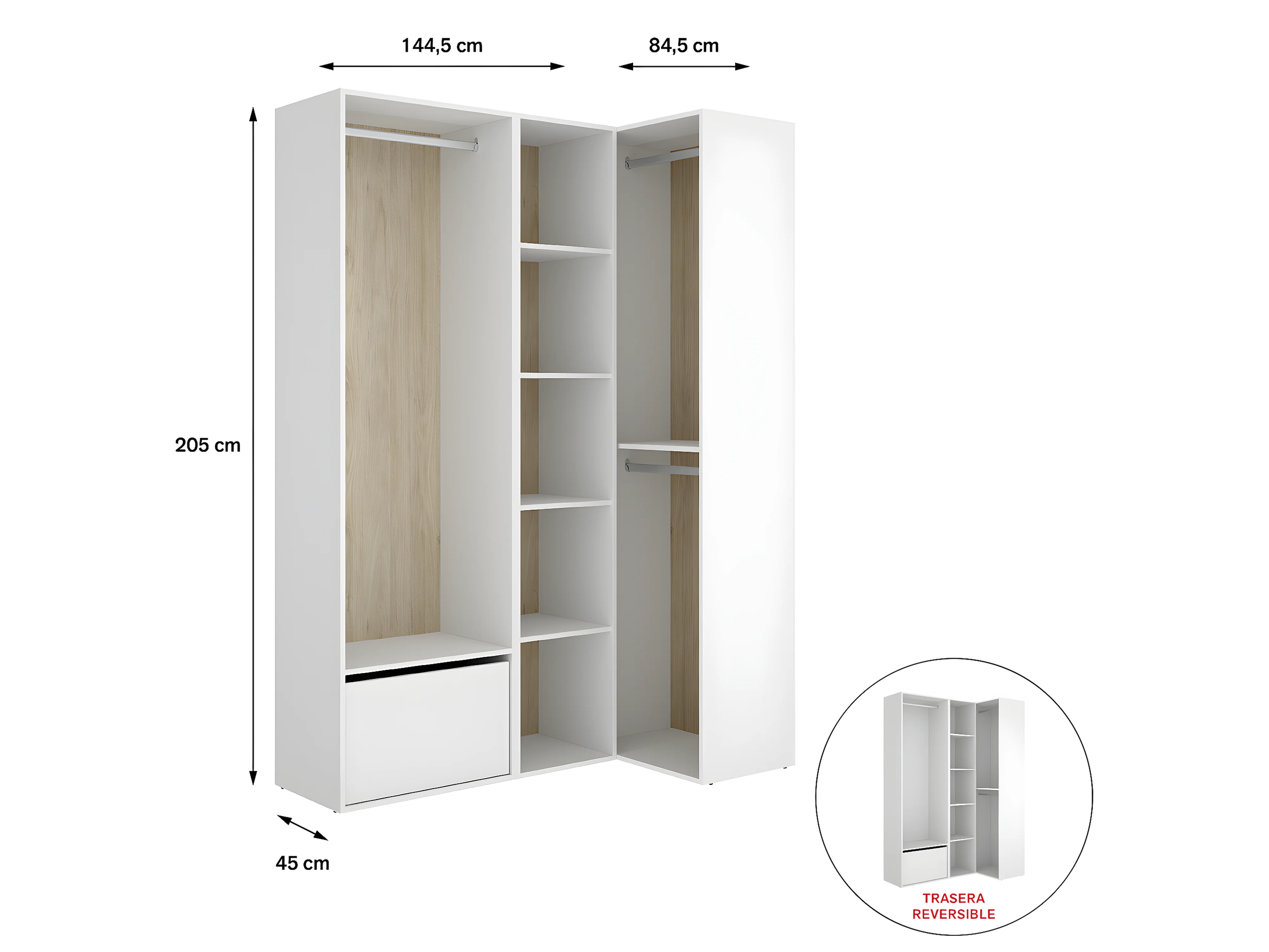 Ensemble dressing d'angle avec portes à chaussures et fond d'arrière réversible coloris chêne naturel, blanc - Longueur 1445 x Profondeur 79 x Hauteur 205 cm