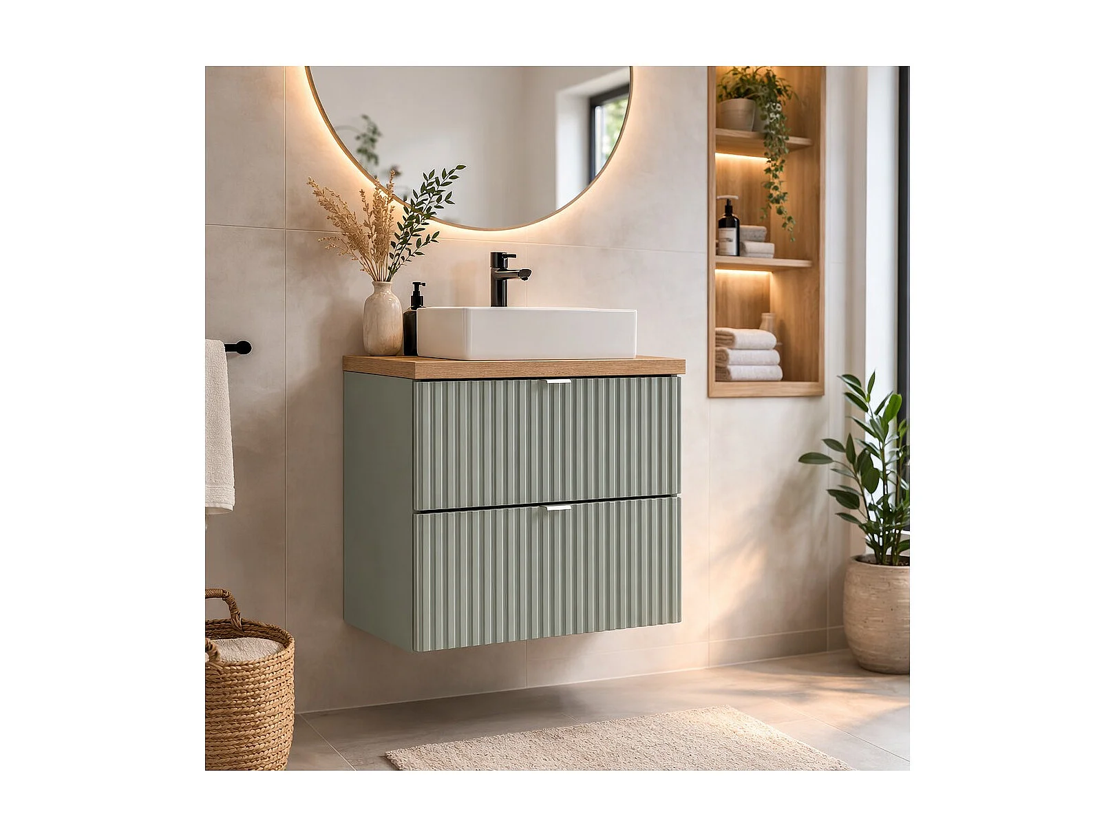 Ensemble ELVINA 50cm : meuble sous vasque à tiroirs vert sauge gris + plan pour vasque + vasque à poser rectangulaire