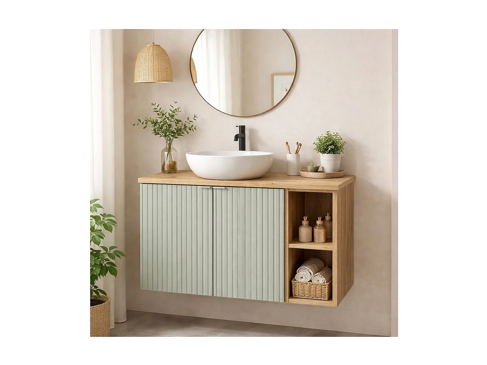 Ensemble ELVINA 80cm : meuble sous vasque à placards vert avec niches visibles + plan pour vasque aspect bois foncé