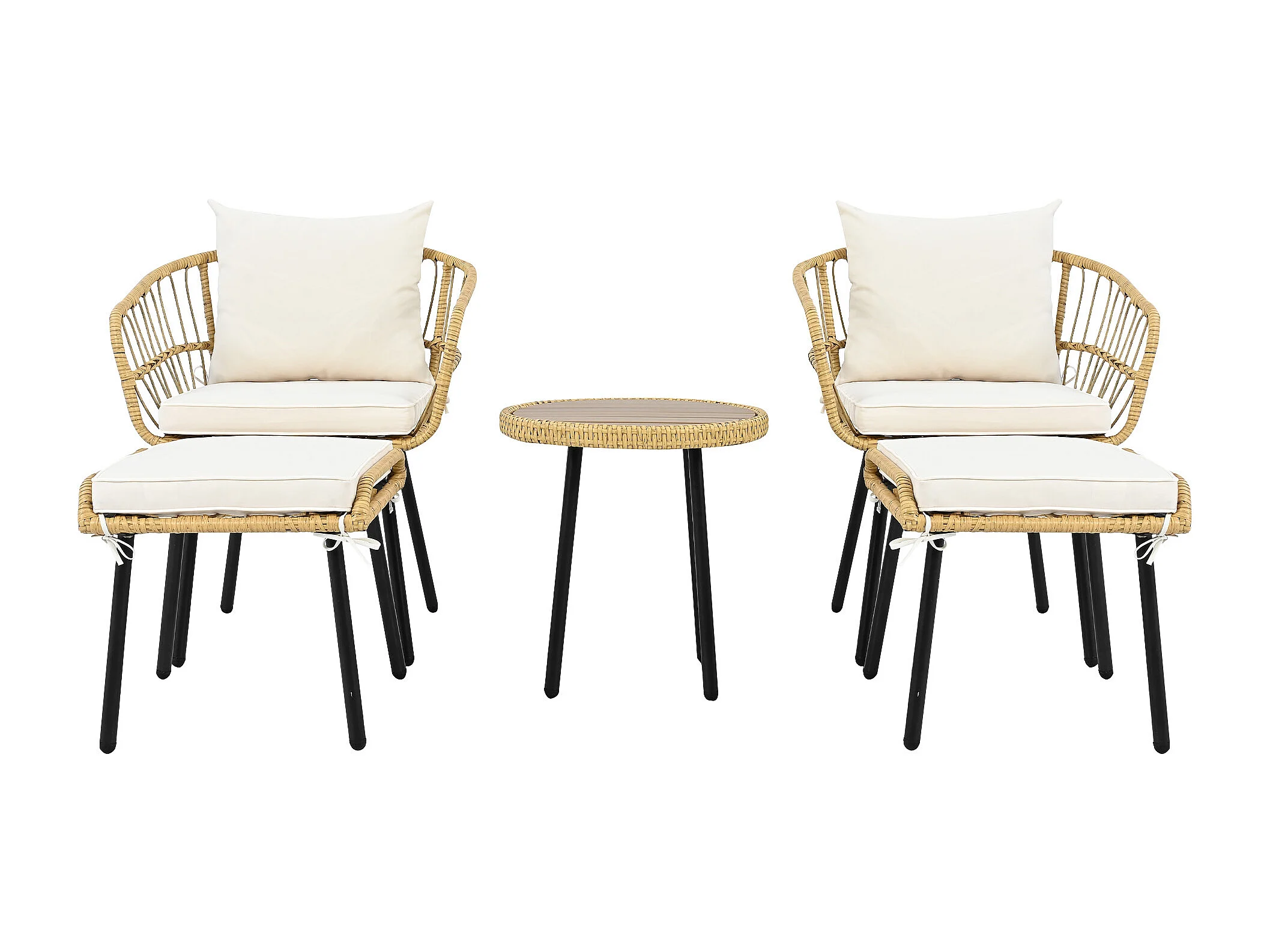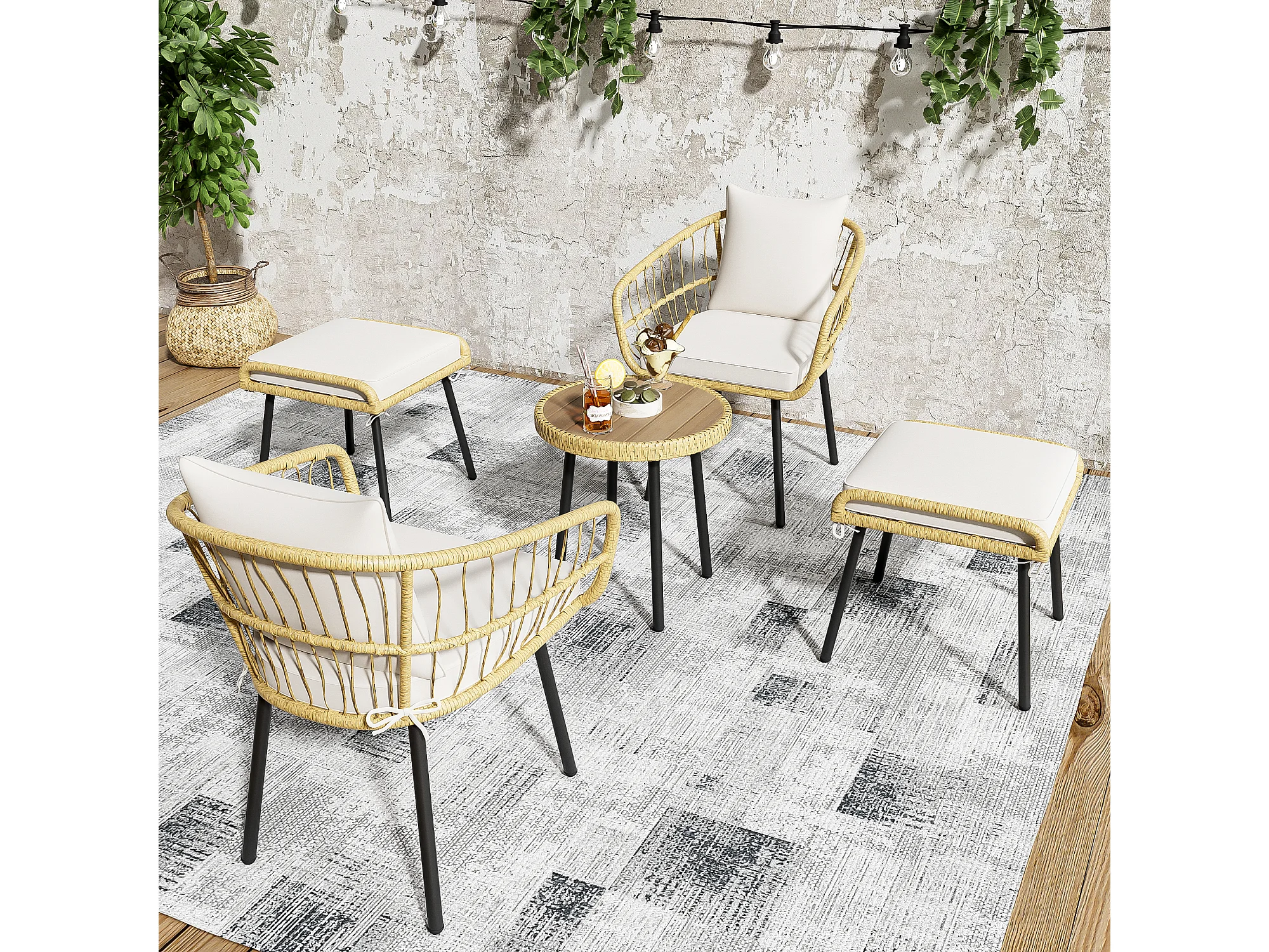 Ensemble Garden Relax 5 pièces, composé de 1 table de salle à manger, 2 chaises, 2 tabourets, meubles, rotin, naturel