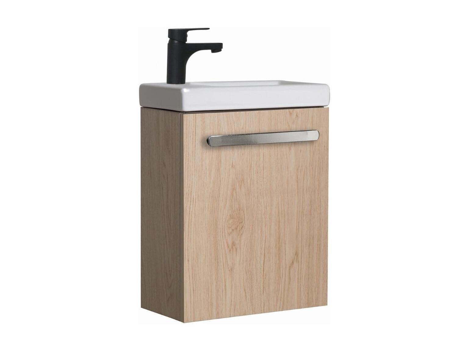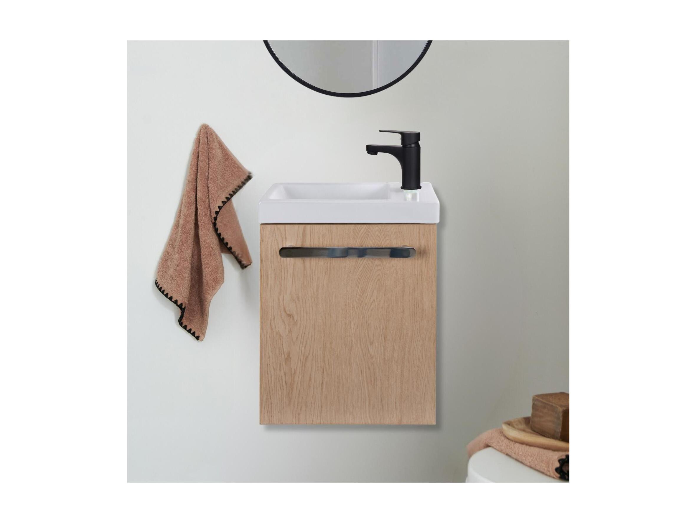 Mob In vous présente l'ensemble lave-mains NEVADA accompagné d'un robinet noir. Il est fabriqué en panneaux de particules mélaminés (PPM) et possède un espace de rangement équipé d'une étagère ainsi que d'une porte réversible avec une poignée en métal. Sa vasque est en résine de synthèse.