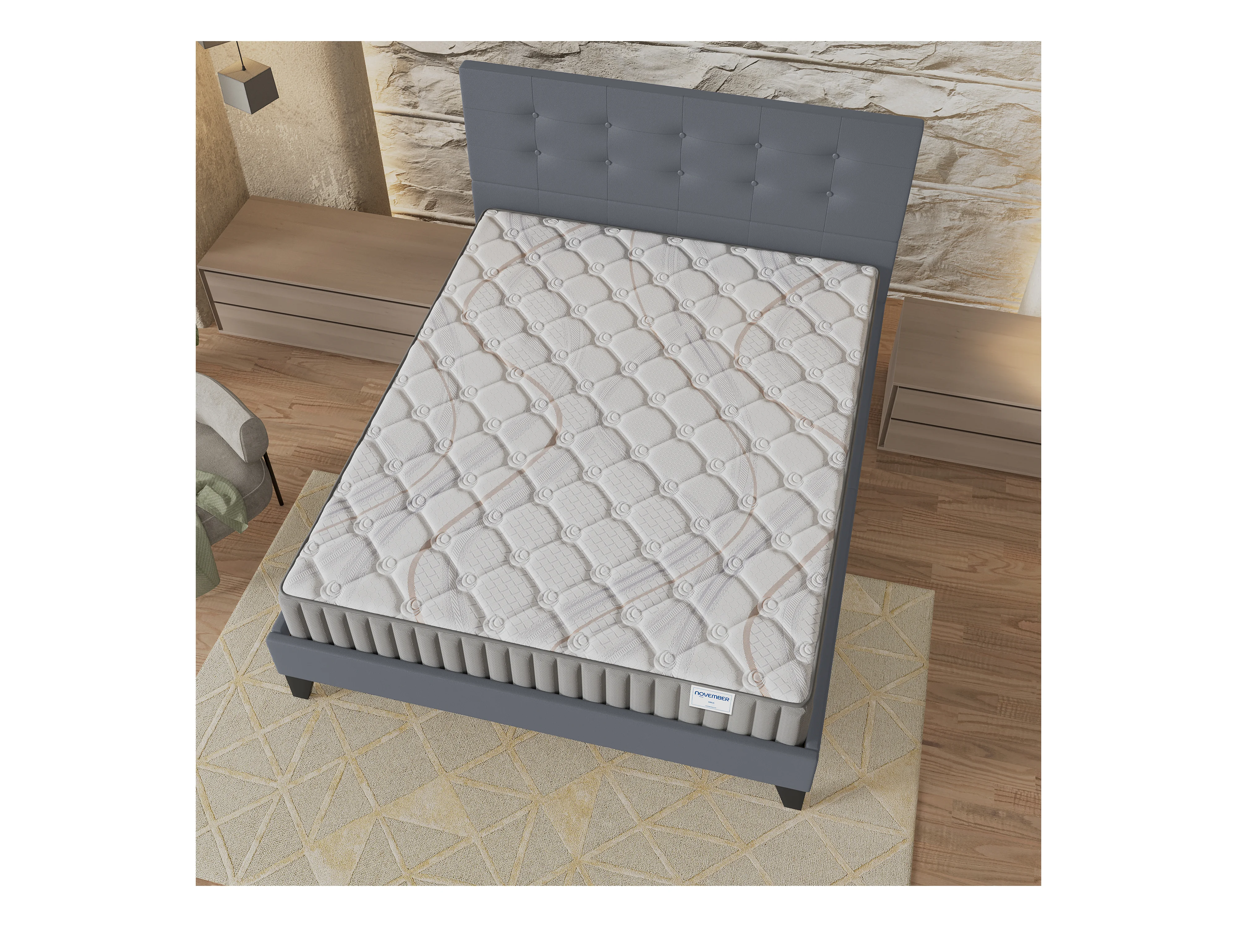 Ensemble matelas + lit 120x190 cm, matelas mousse accueil latex ép.16cm, lit à tête de lit capitonnée similicuir gris