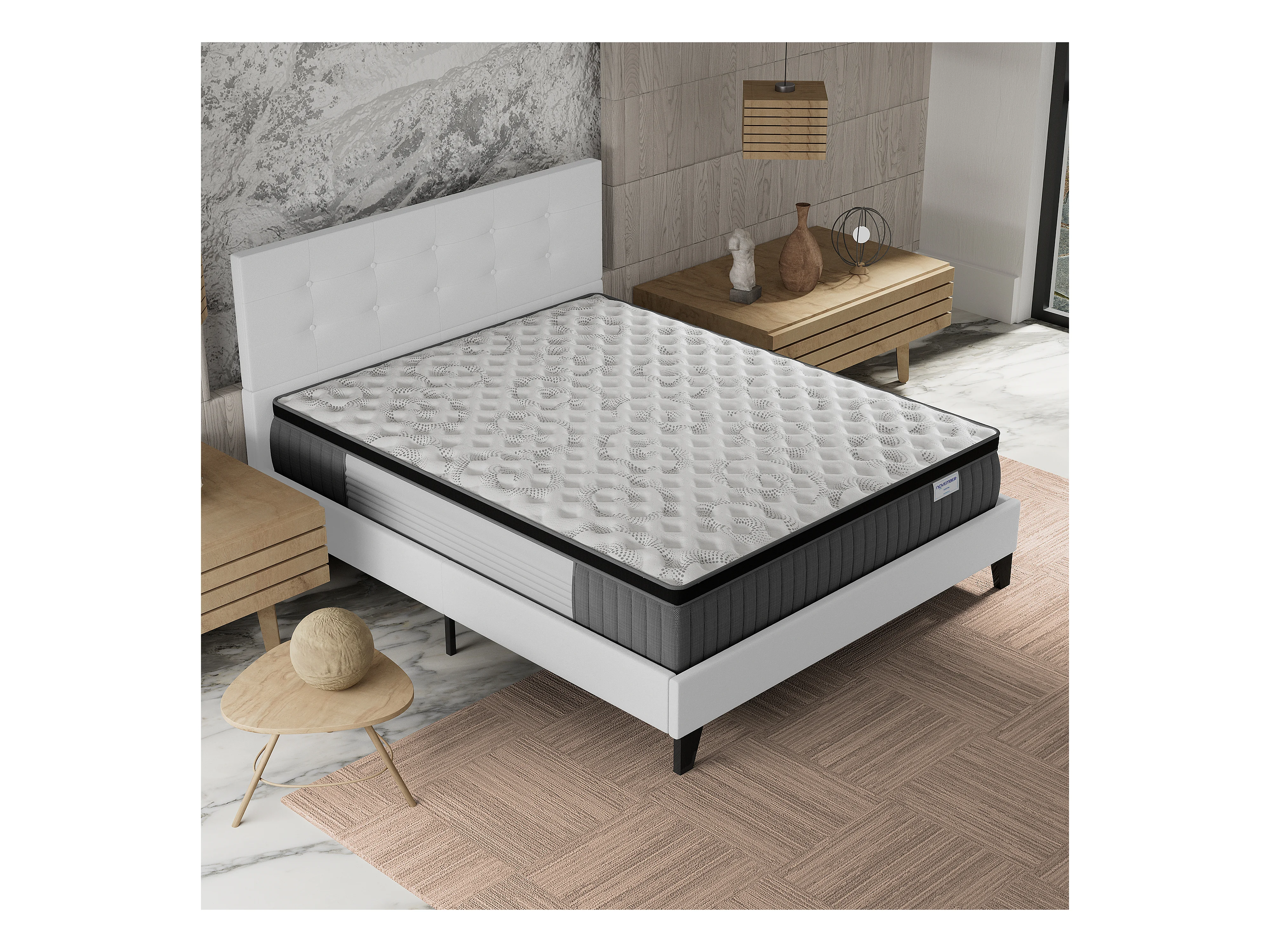Ensemble matelas + lit 140x200 cm, matelas 30cm ressorts ensachés + mémoire de forme, lit à tête de lit capitonnée similicuir blanc