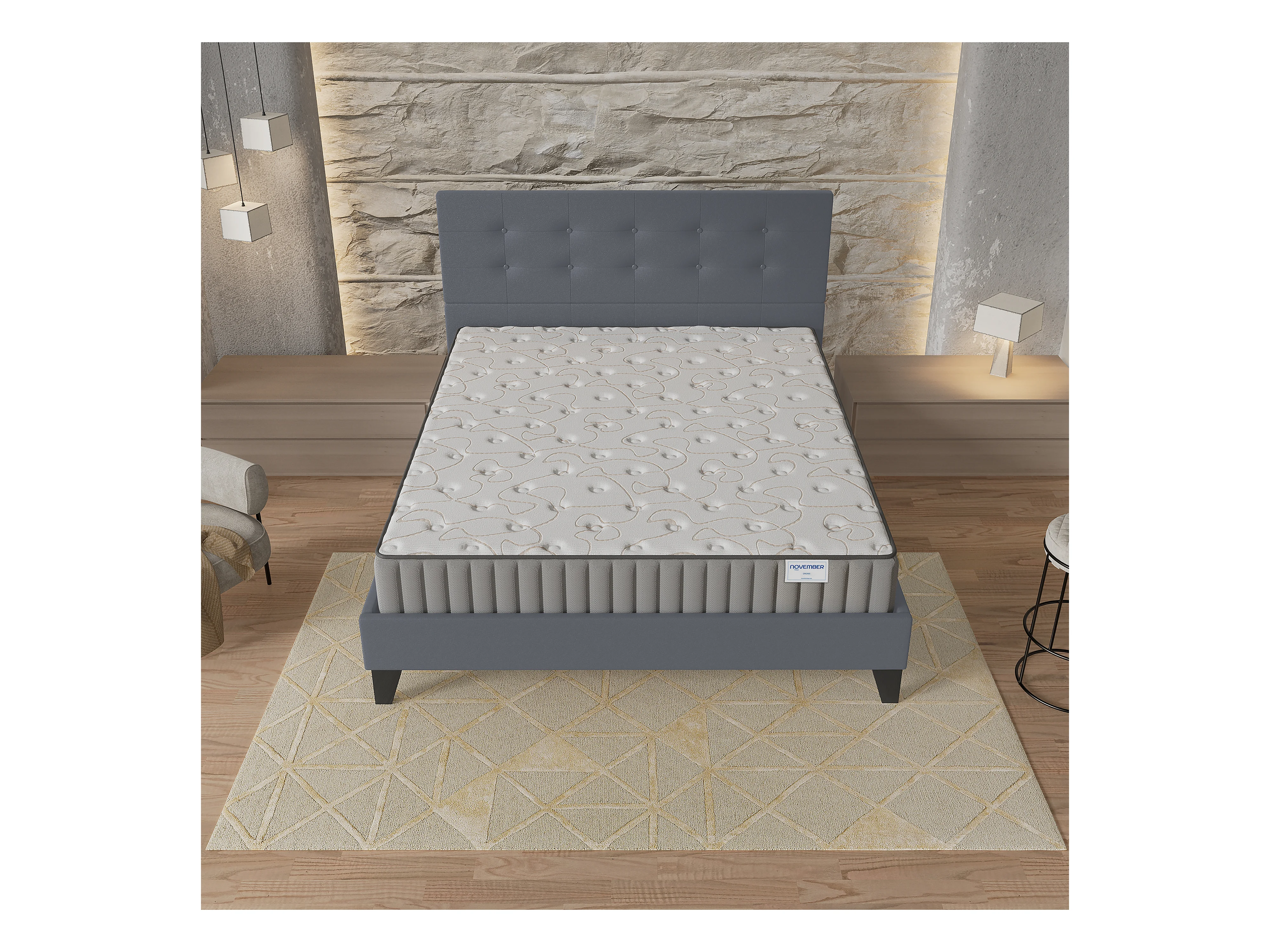 Ensemble matelas + lit 140x200 cm, matelas 16cm mousse + mémoire de forme, lit à tête de lit capitonnée similicuir gris