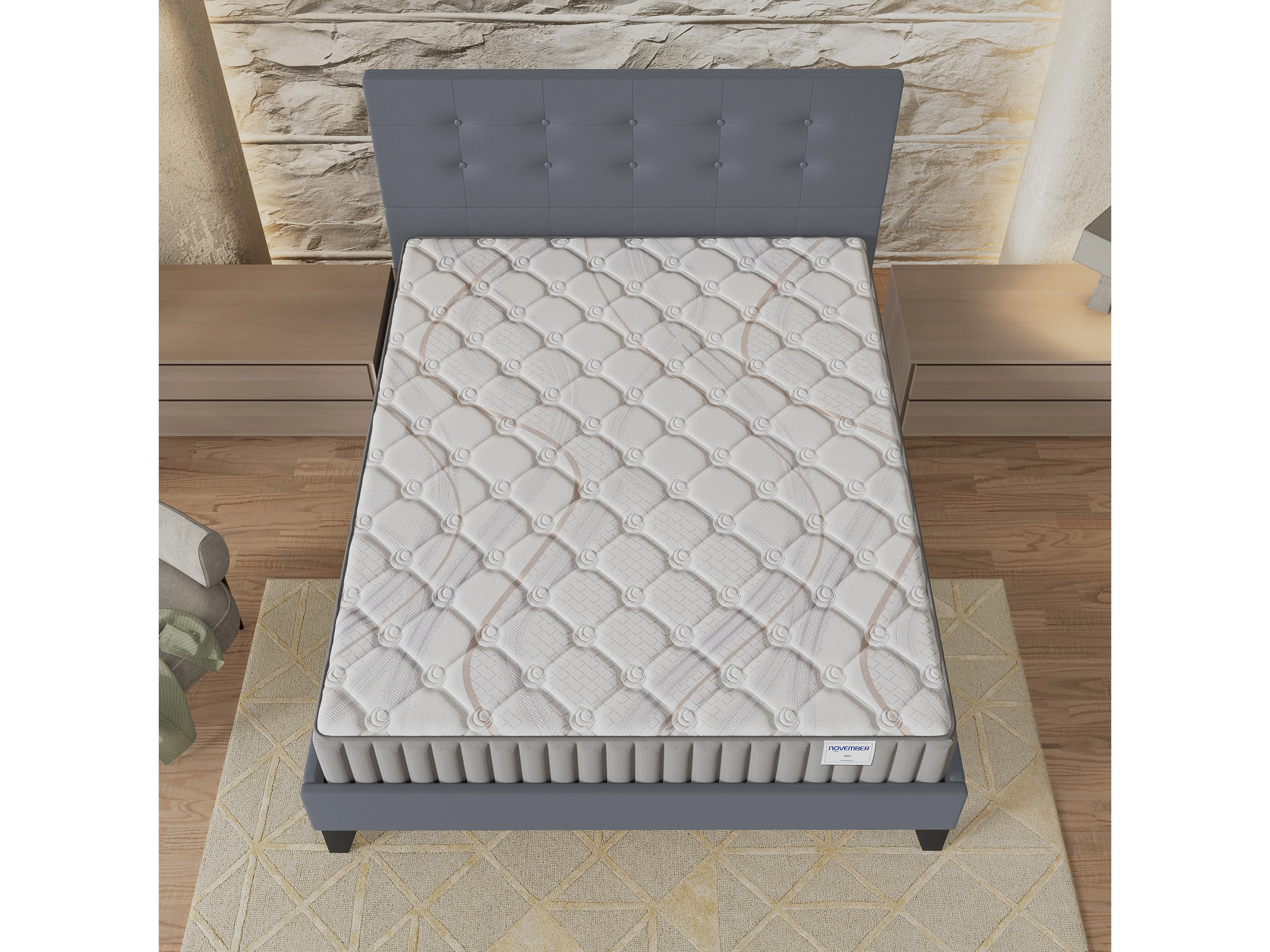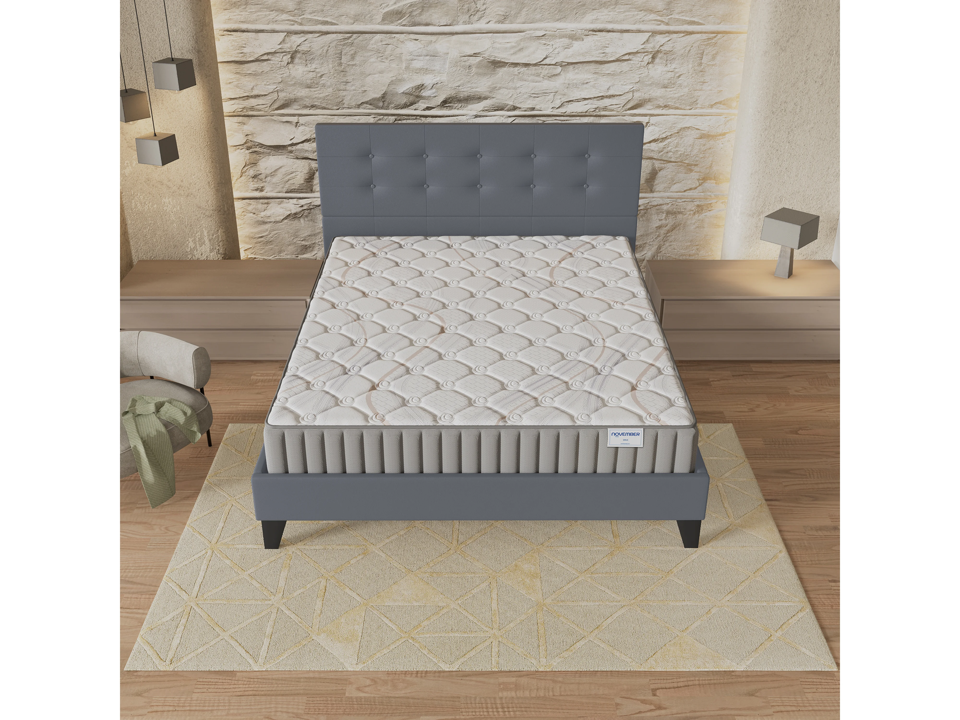 Ensemble matelas + lit 140x200 cm, matelas mousse accueil latex ép.16cm, lit à tête de lit capitonnée similicuir gris