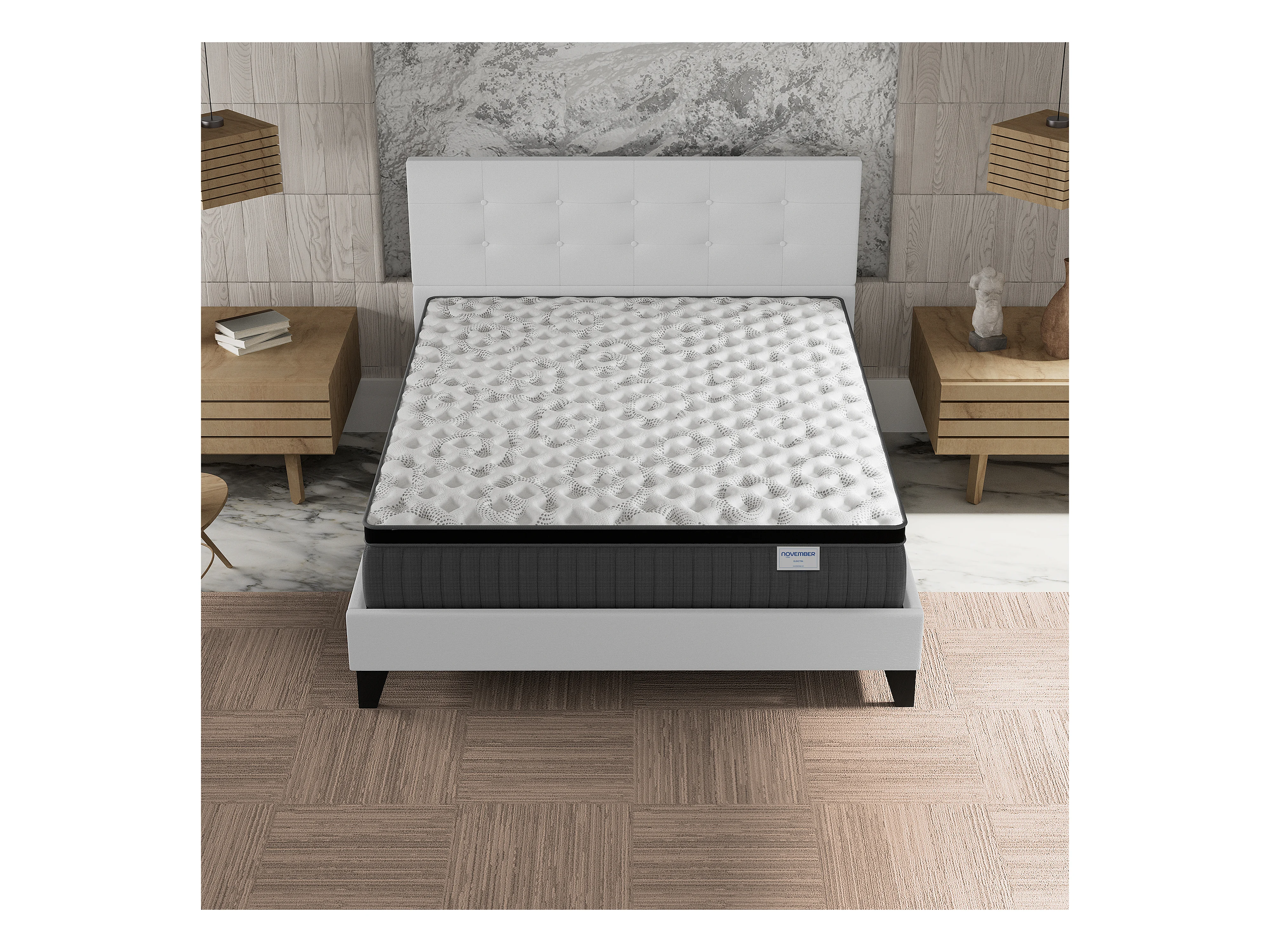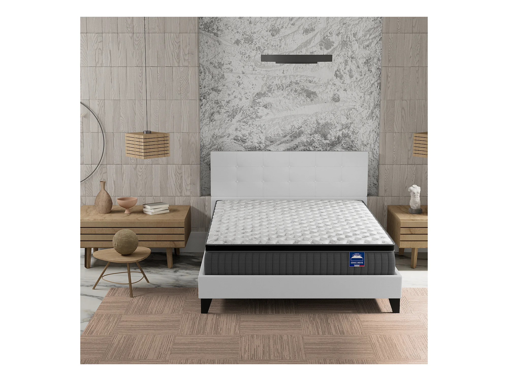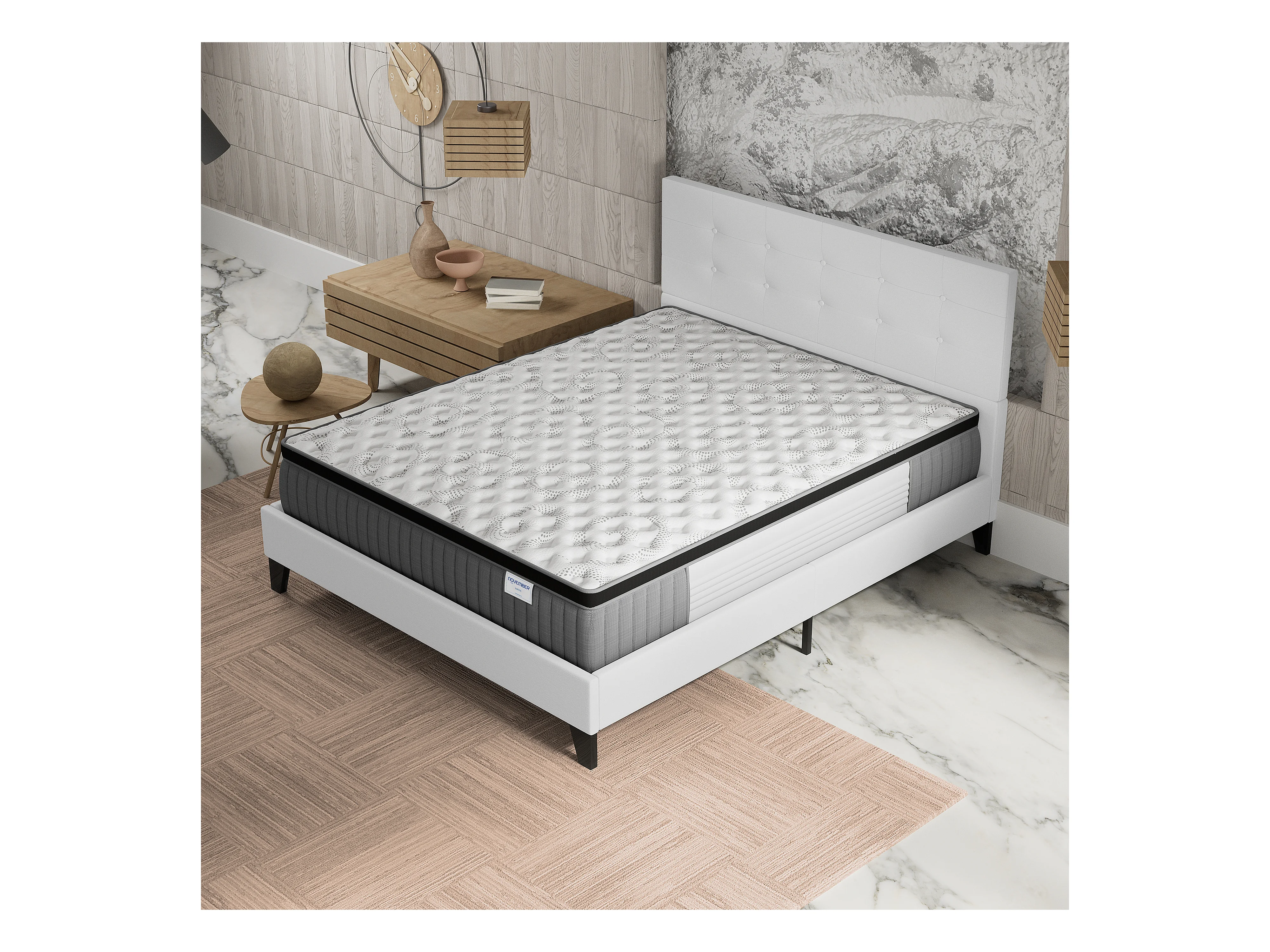 Ensemble matelas + lit 160x200 cm, matelas 30cm ressorts ensachés + mémoire de forme, lit à tête de lit capitonnée similicuir blanc