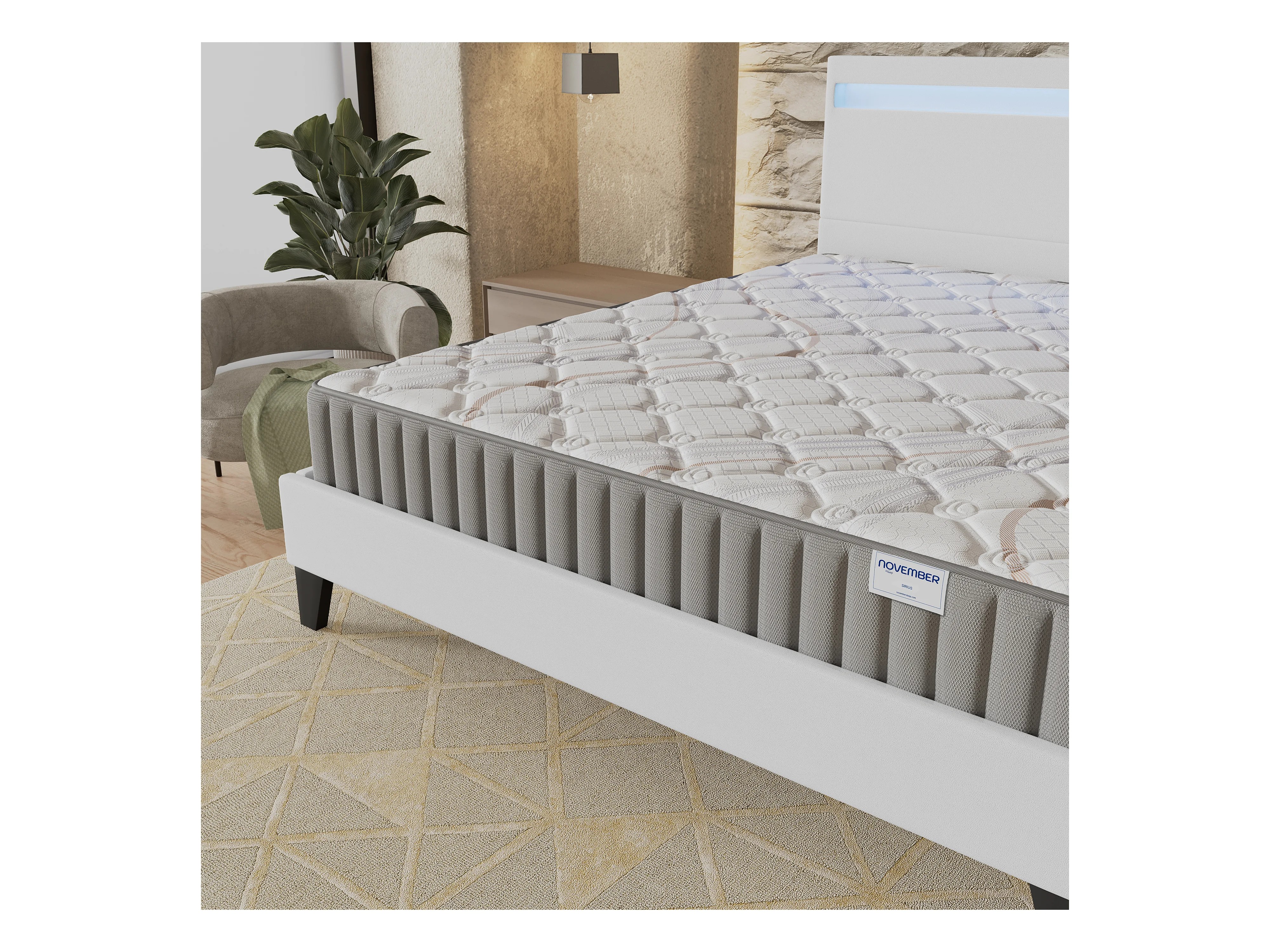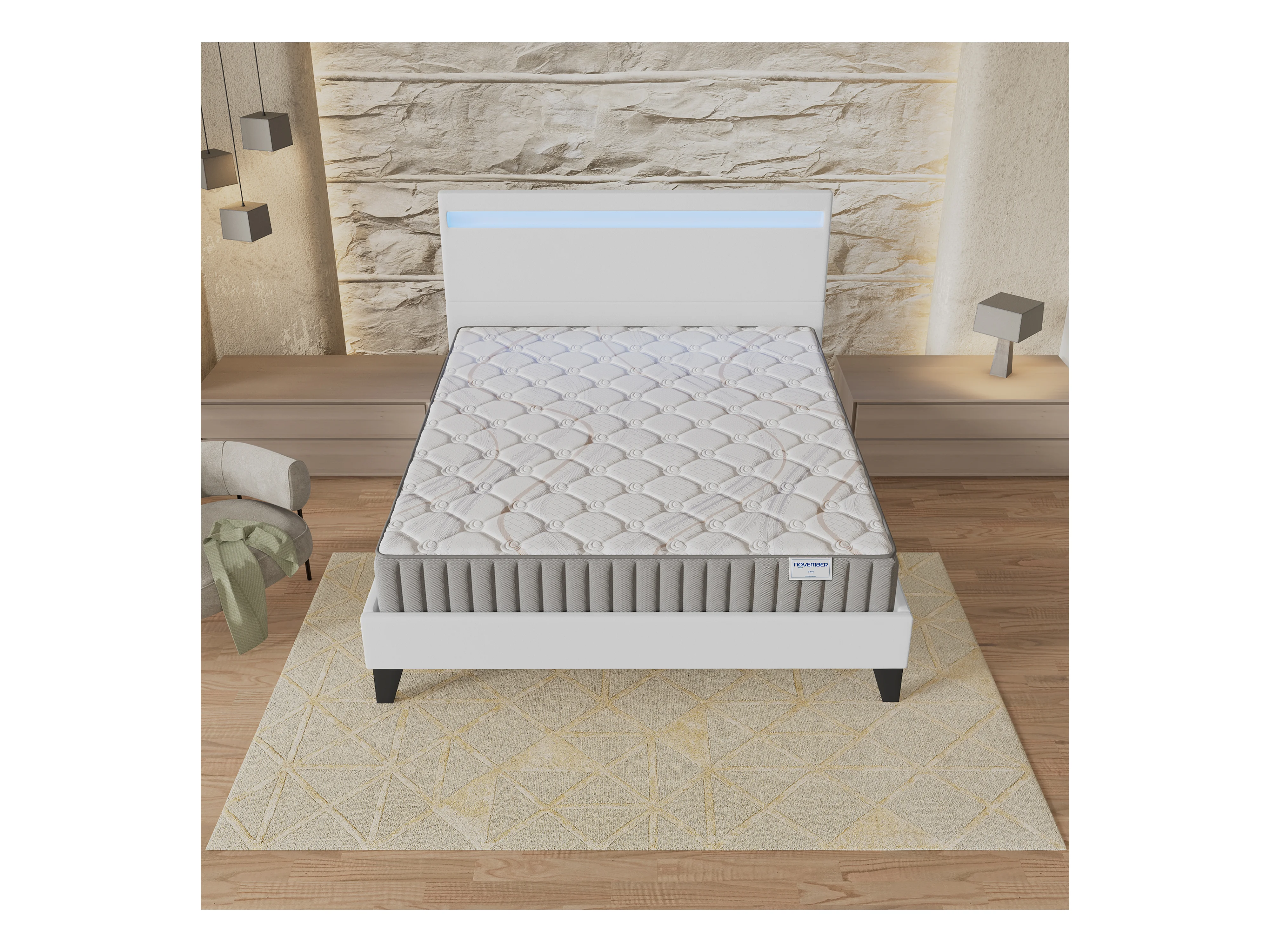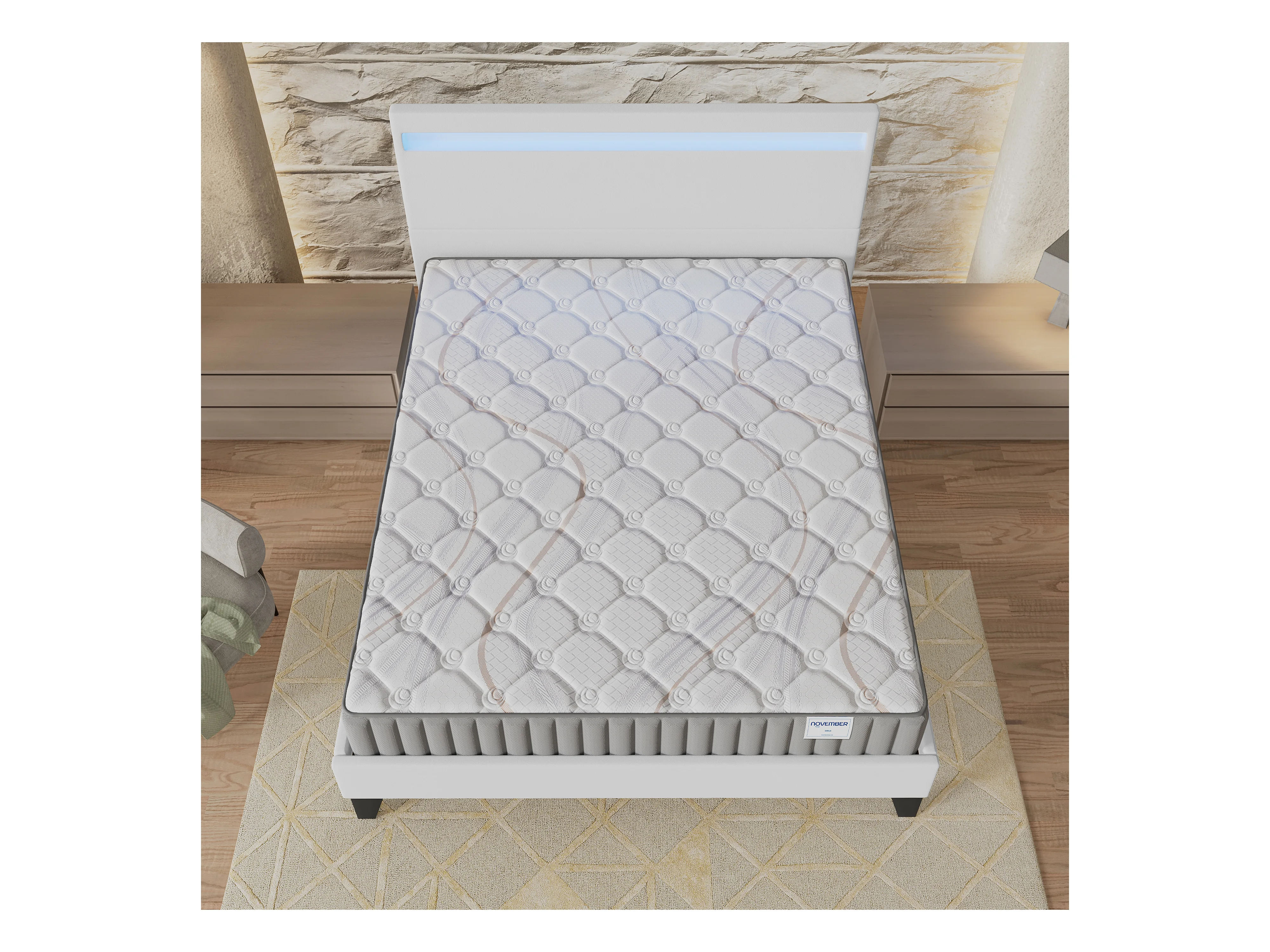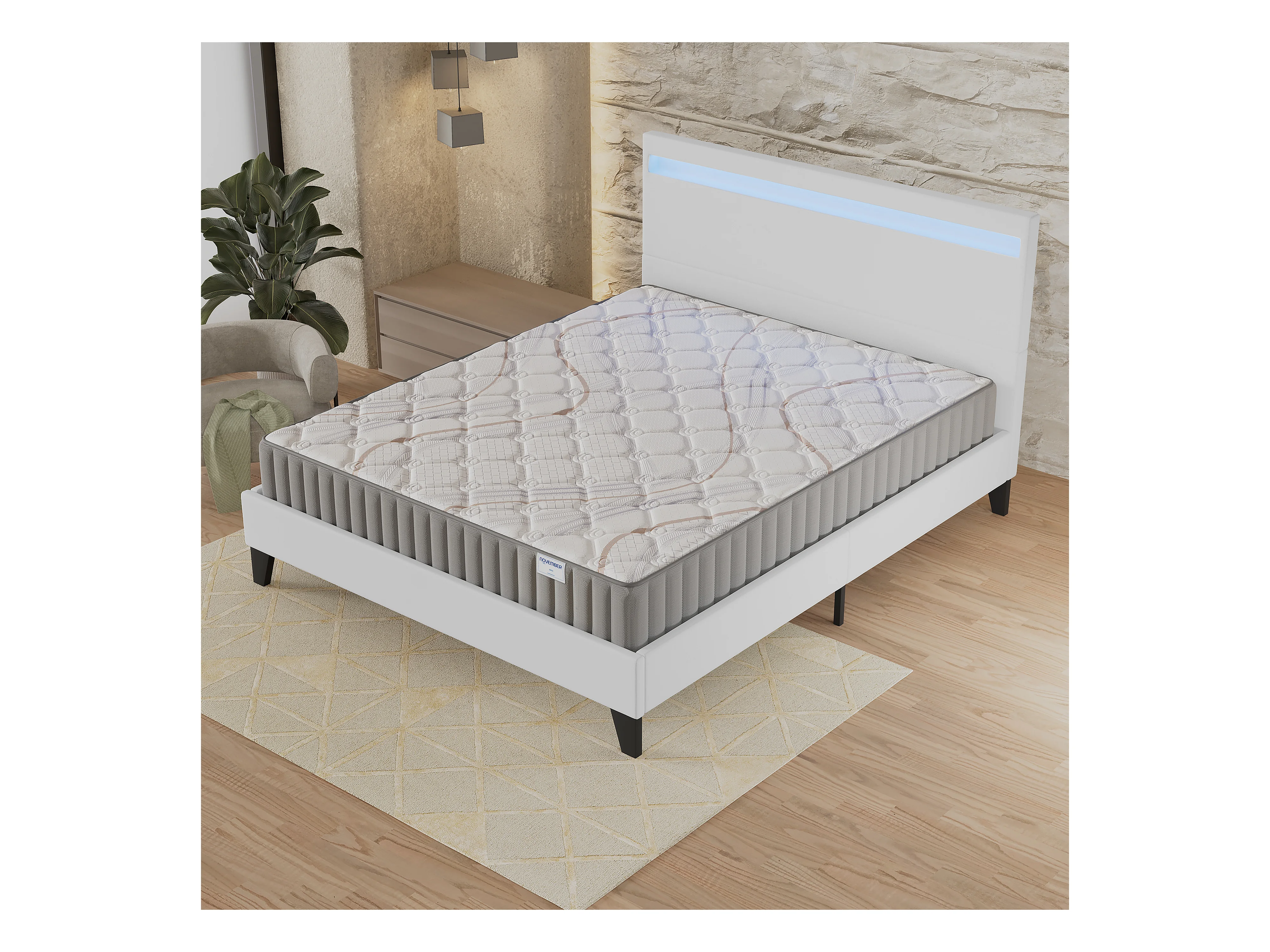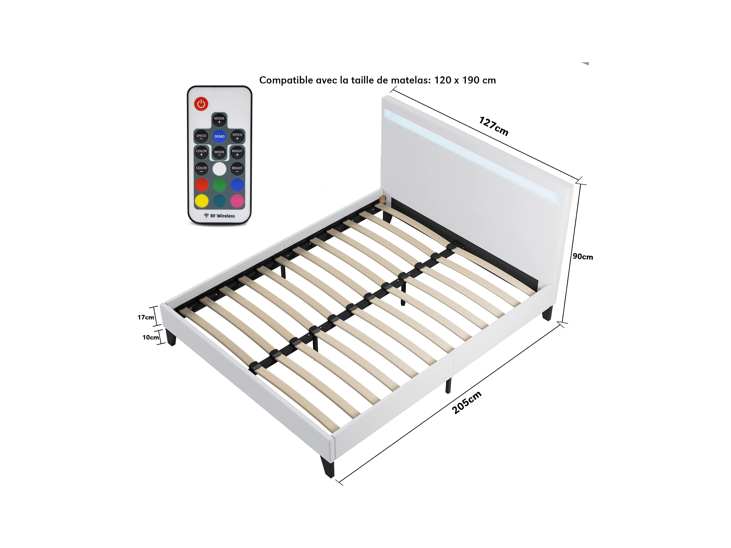 Ensemble Matelas + lit 120x190 cm, Matelas 16cm mousse, accueil latex, lit à tête de lit LED similicuir blanc