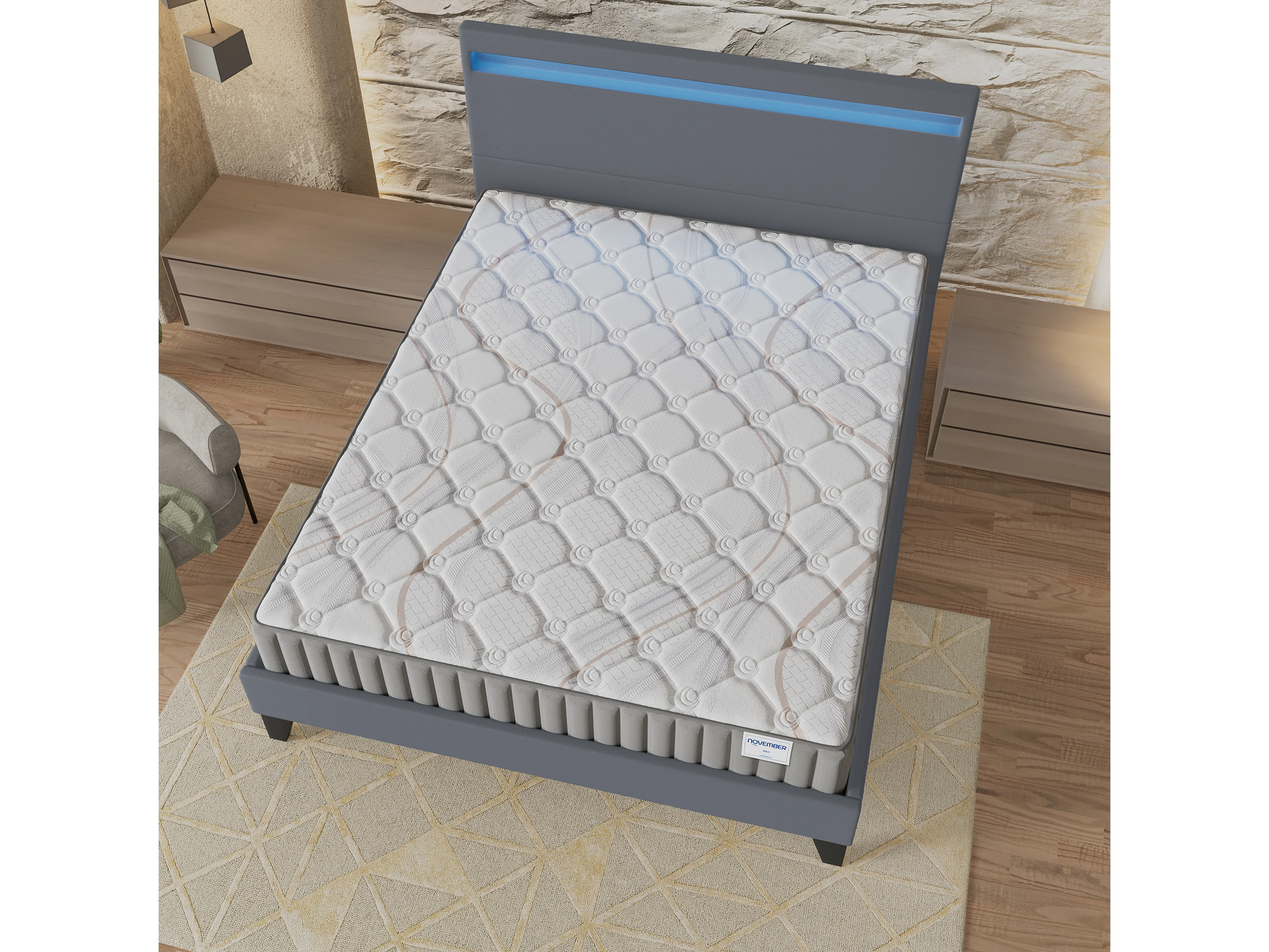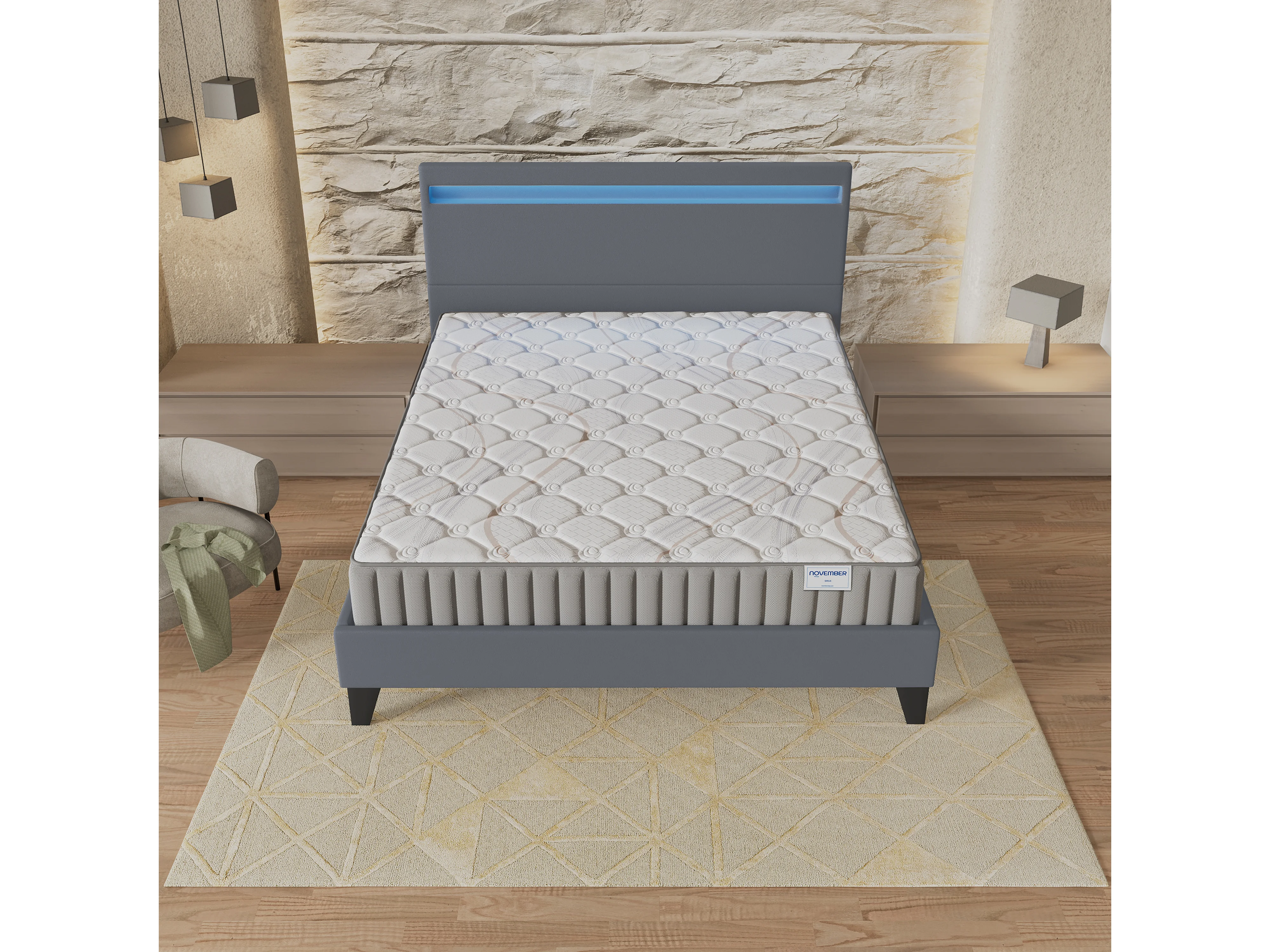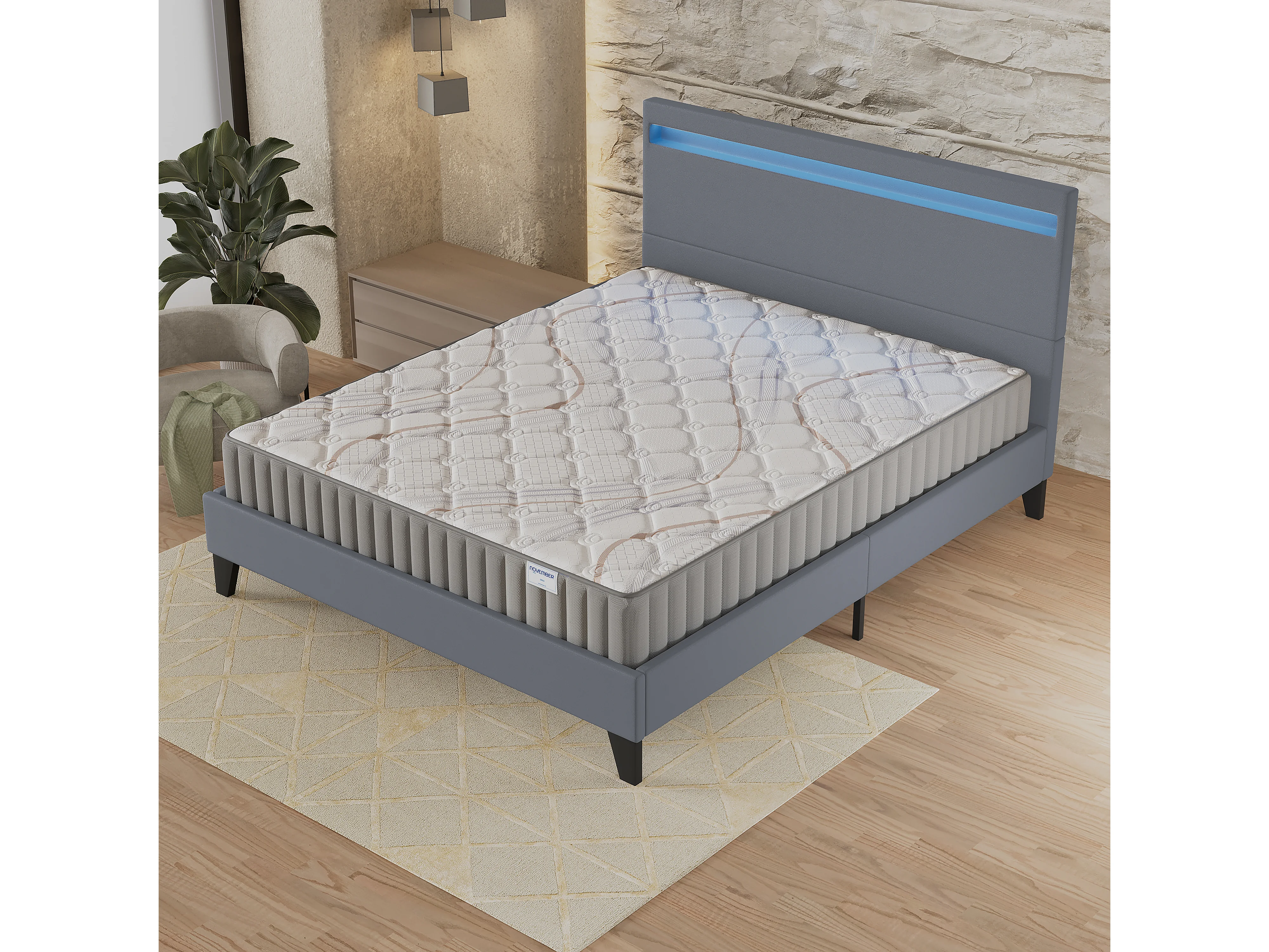 Ensemble Matelas + lit 140x190 cm, Matelas 16cm mousse, accueil latex, lit à tête de lit LED similicuir gris