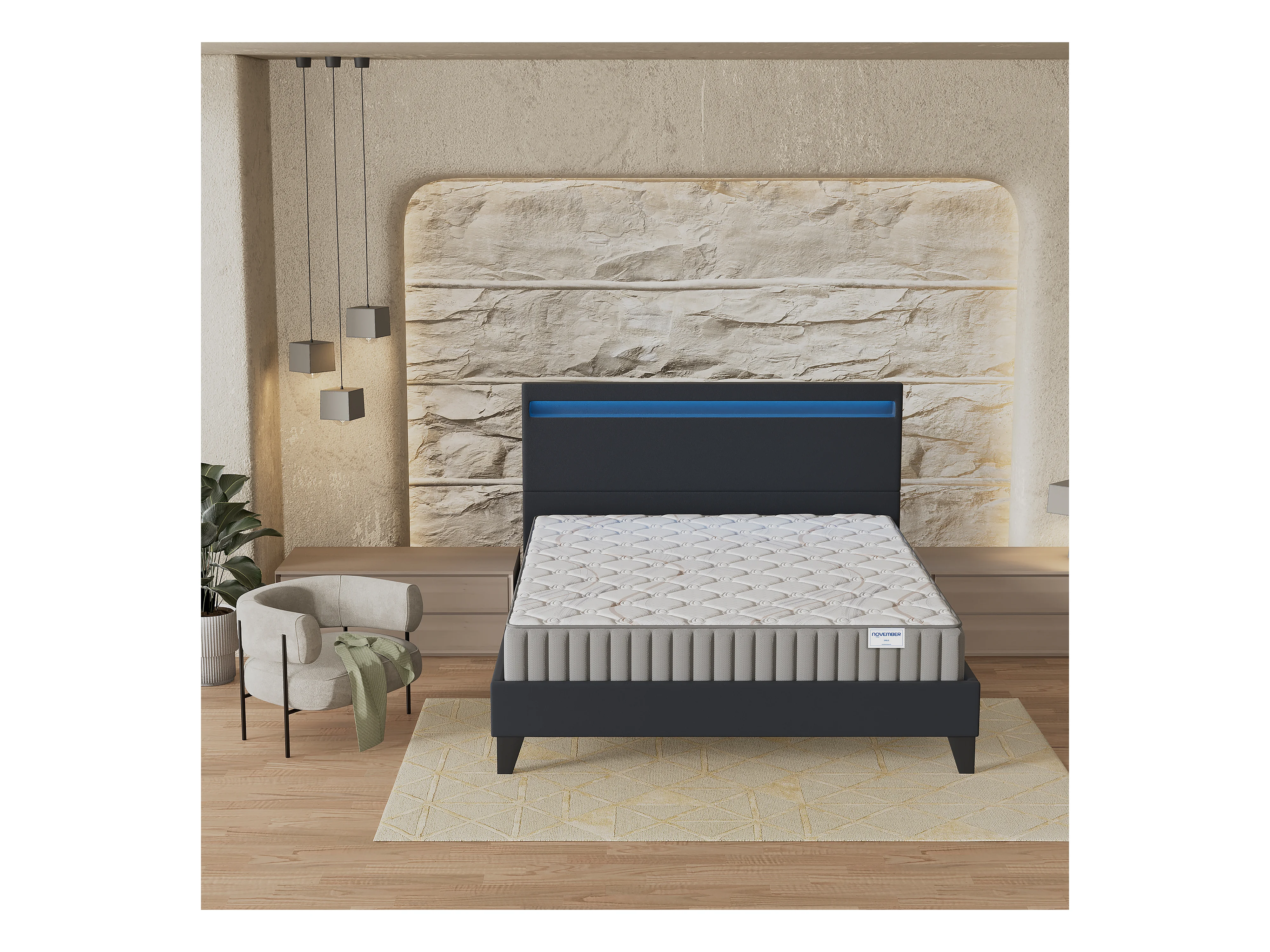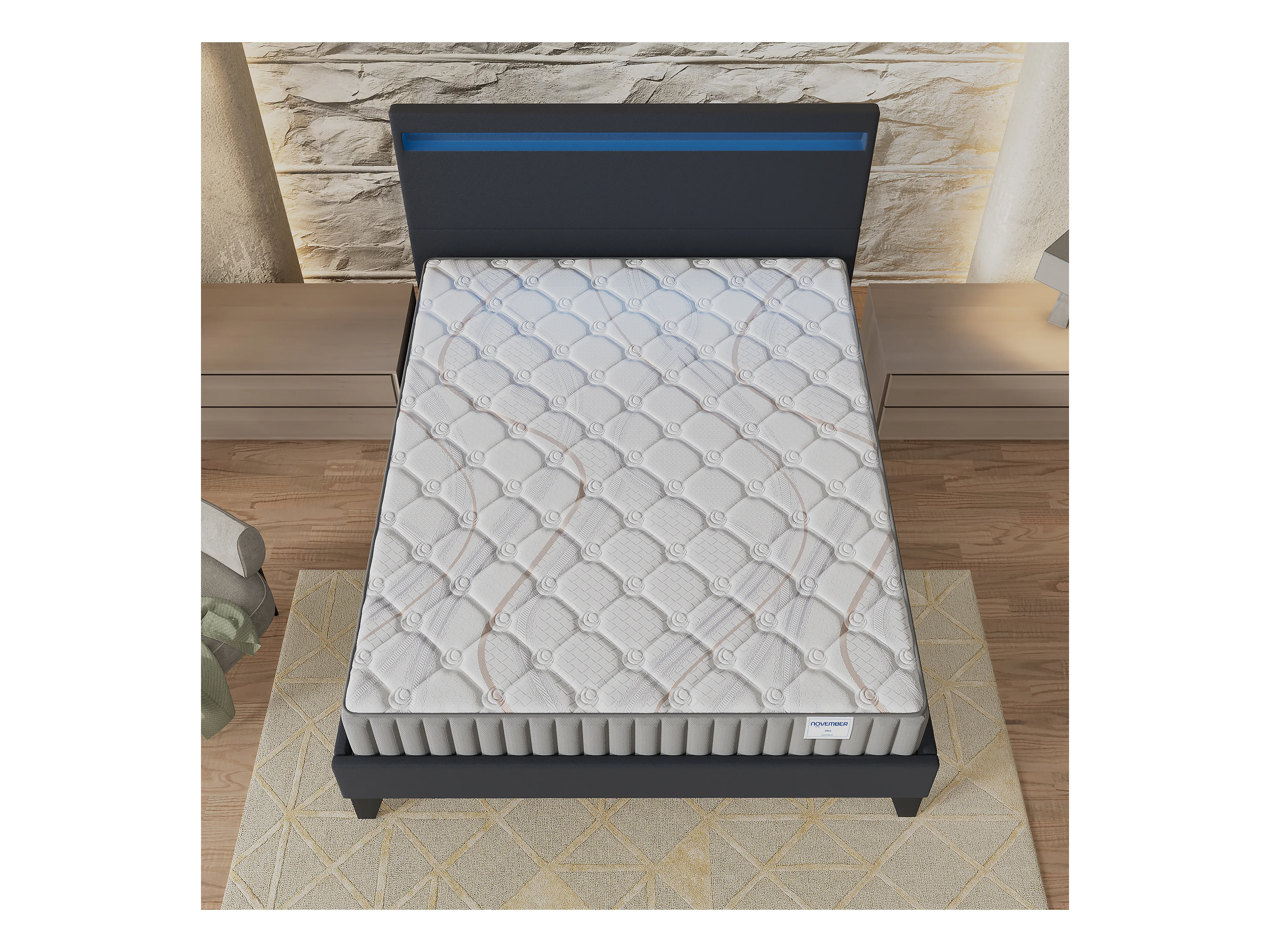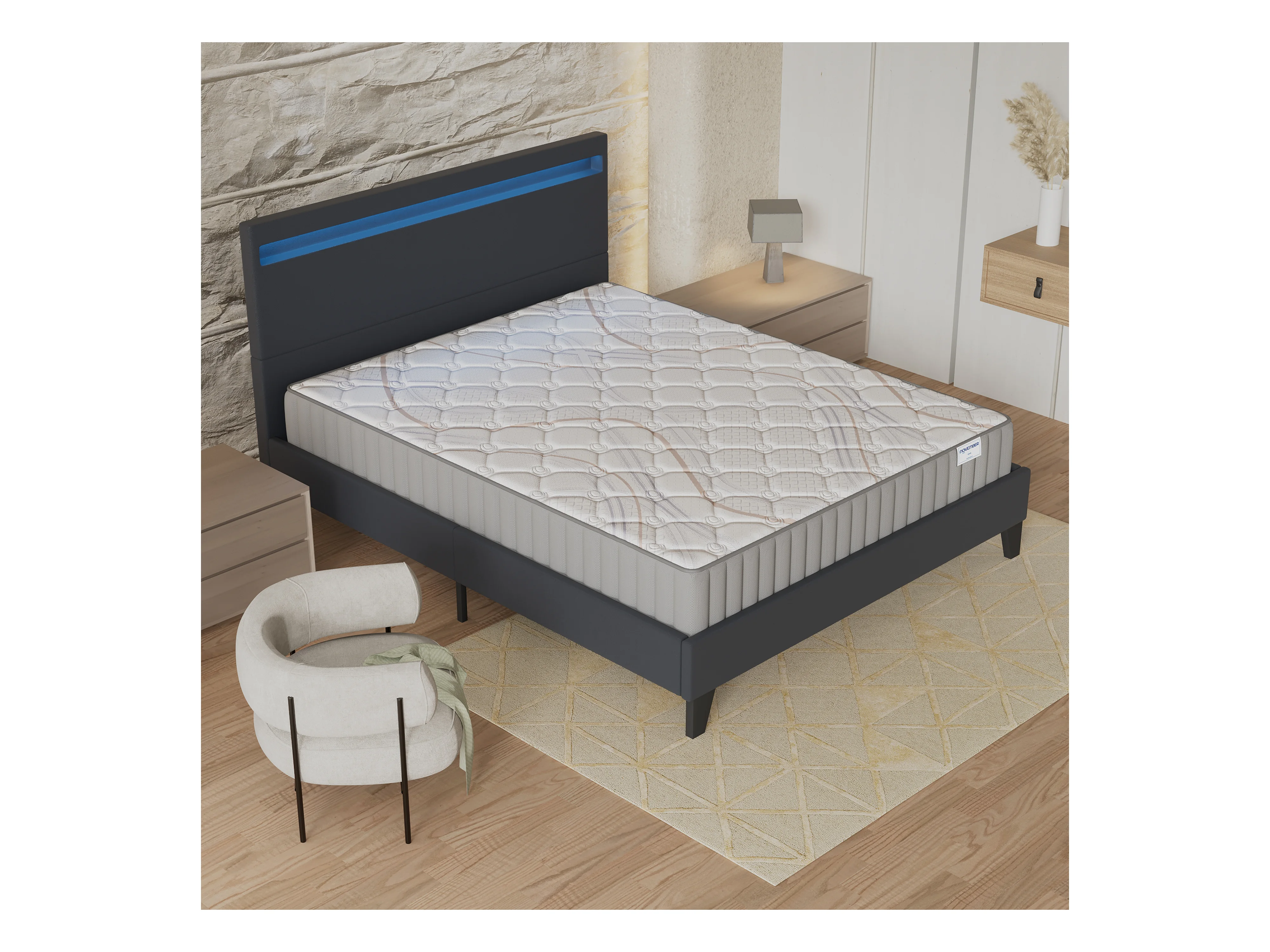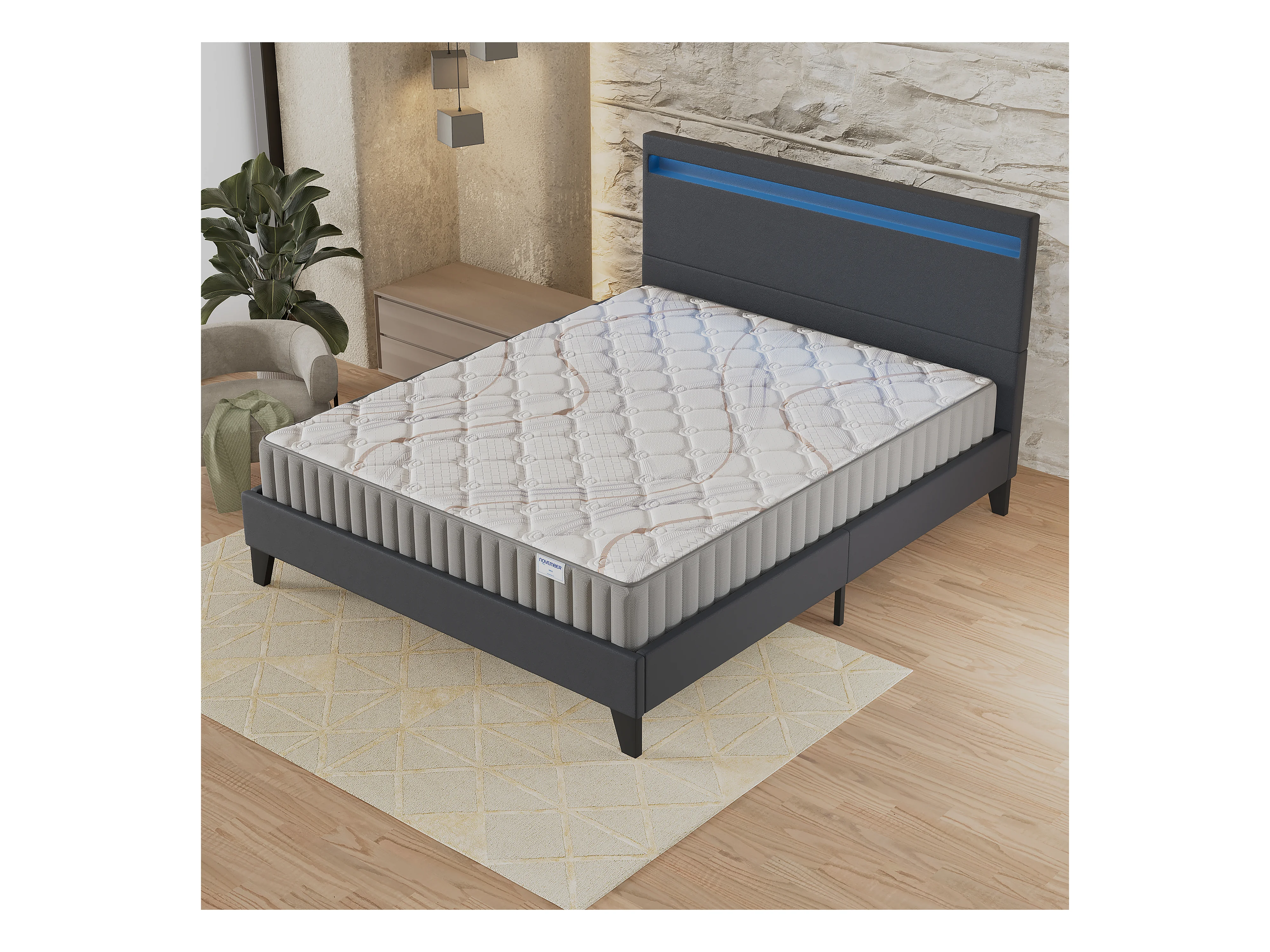Ensemble Matelas + lit 140x190 cm, Matelas 16cm mousse, accueil latex, lit à tête de lit LED similicuir noir