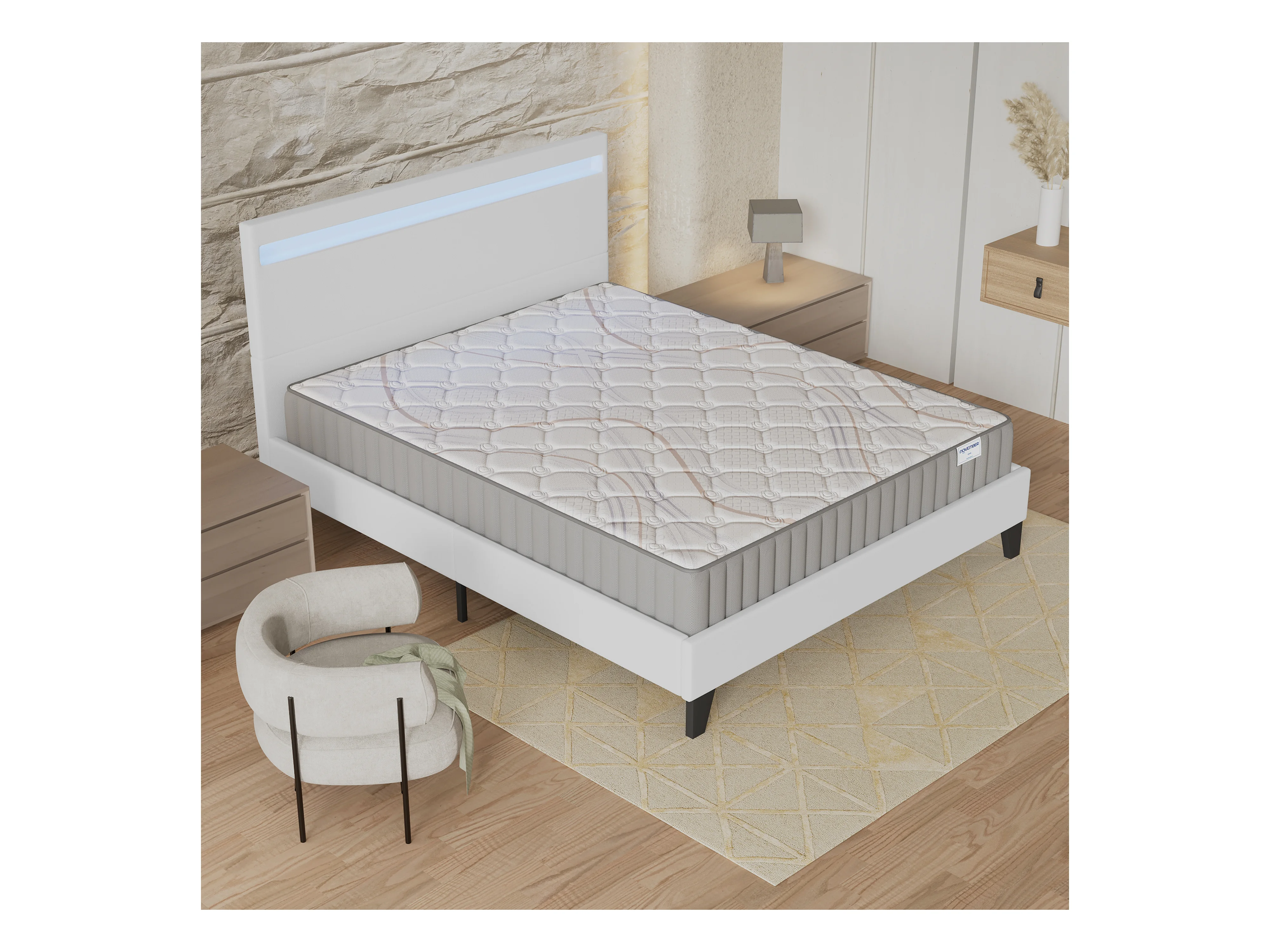 Ensemble Matelas + lit 140x200 cm, Matelas 16cm mousse, accueil latex, lit à tête de lit LED similicuir blanc