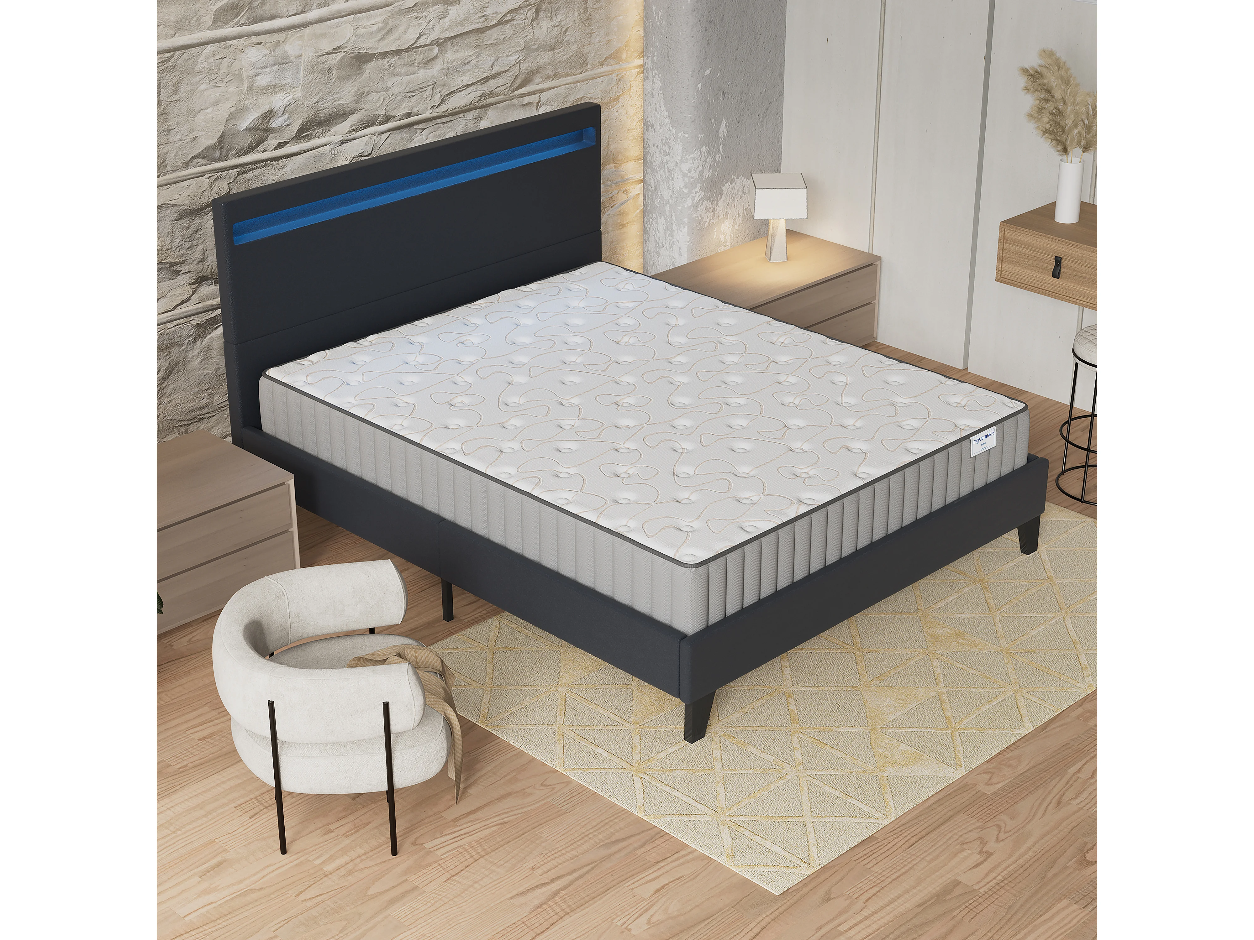 Ensemble Matelas + lit 160x200 cm, Matelas 22cm mousse, accueil mémoire de forme, lit à tête de lit LED similicuir noir