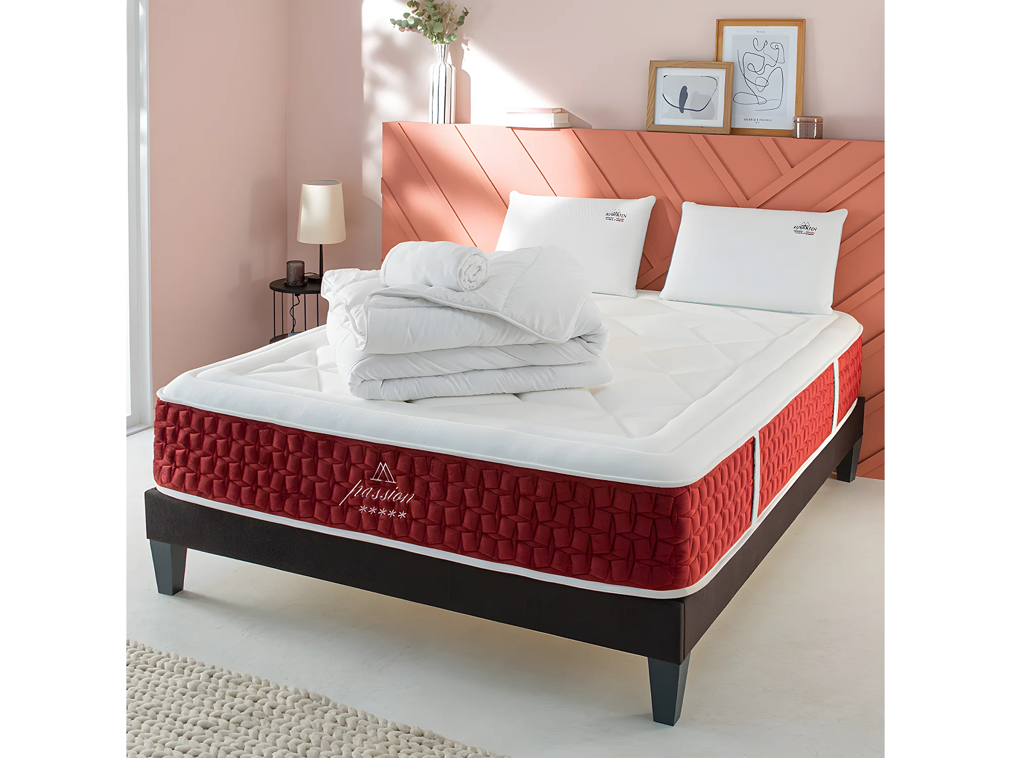 Ensemble Matelas Passion Ressorts ensachés Accueil mémoire + sommier gris gris + accessoires-140x200