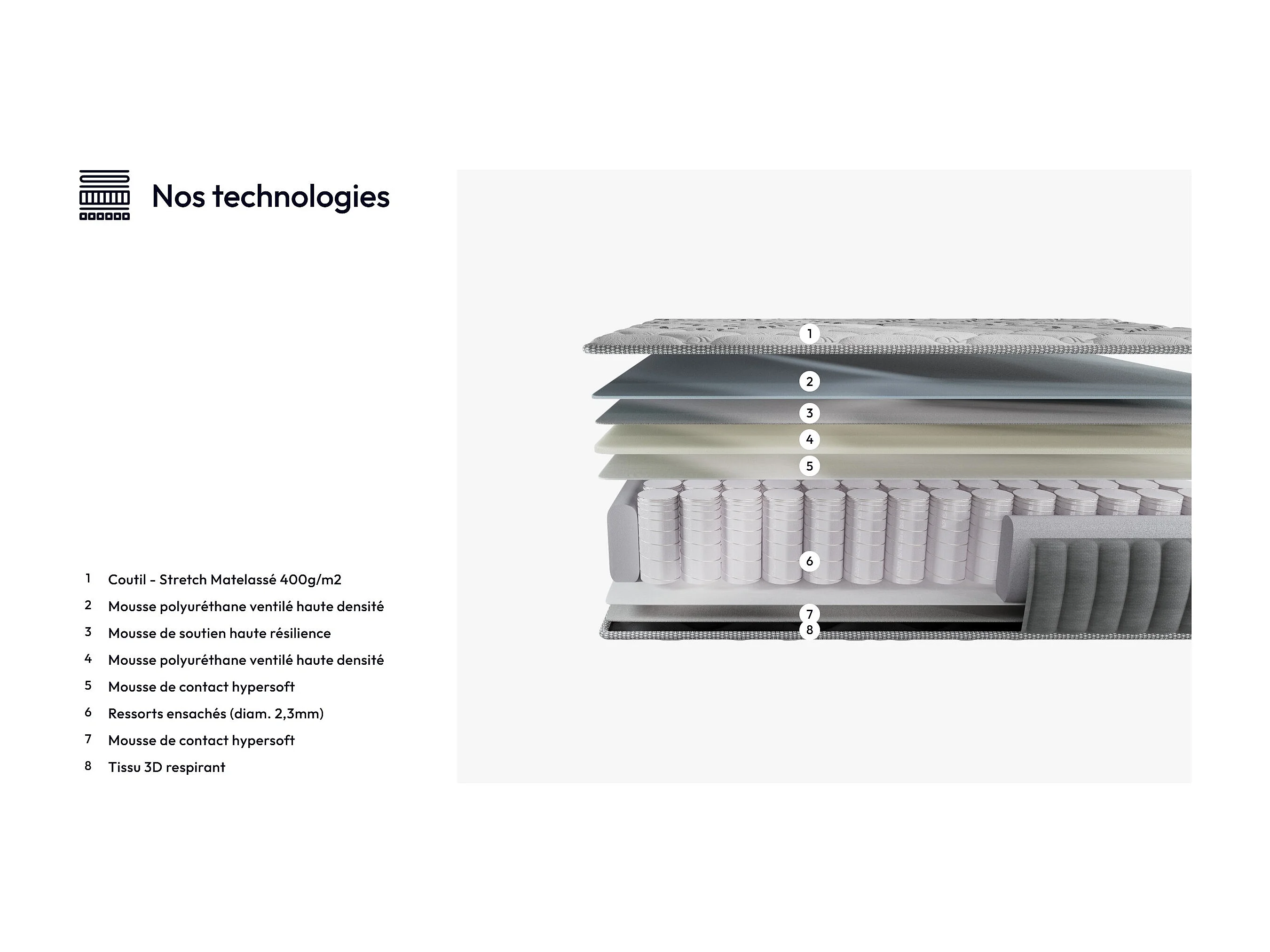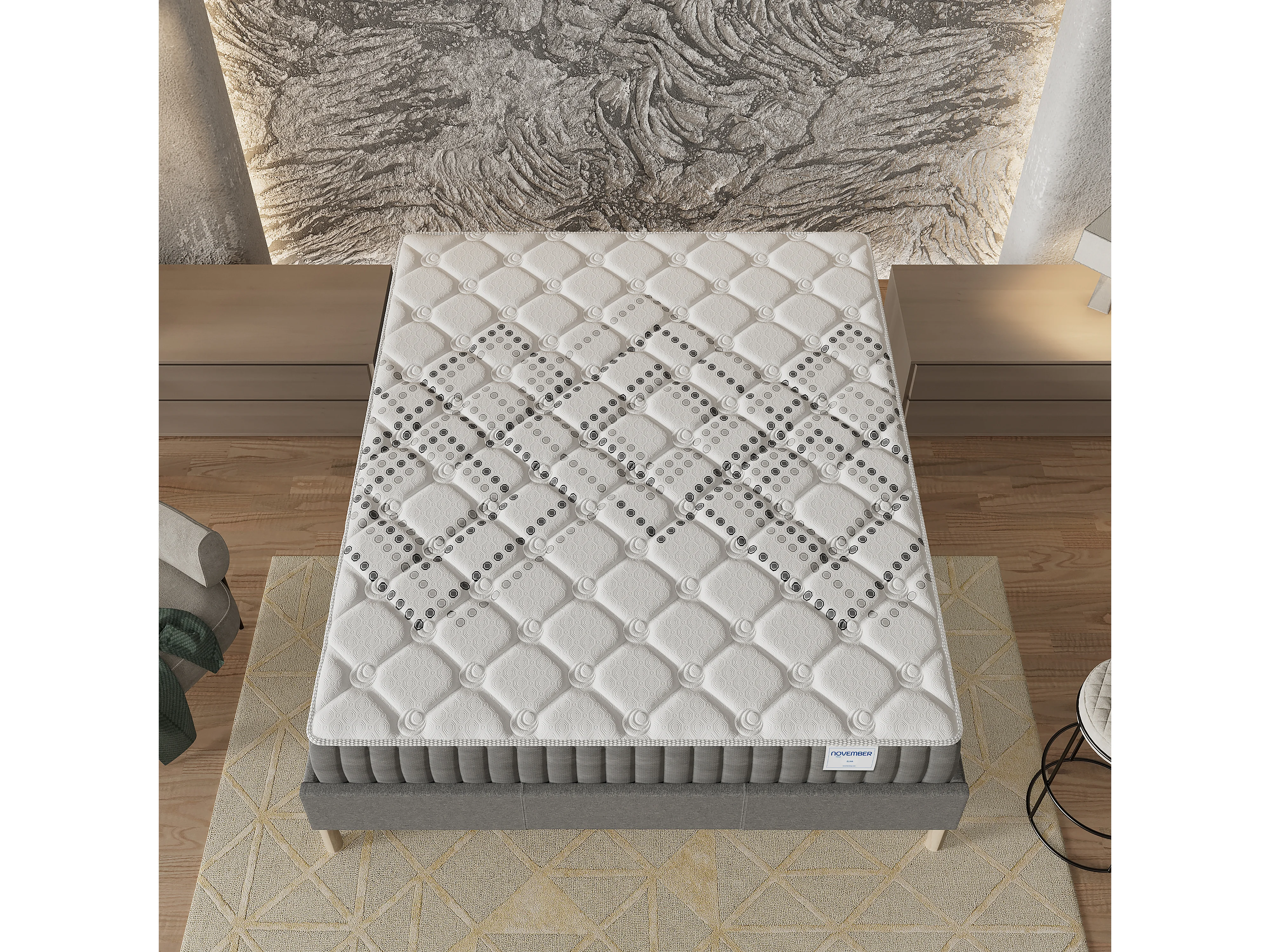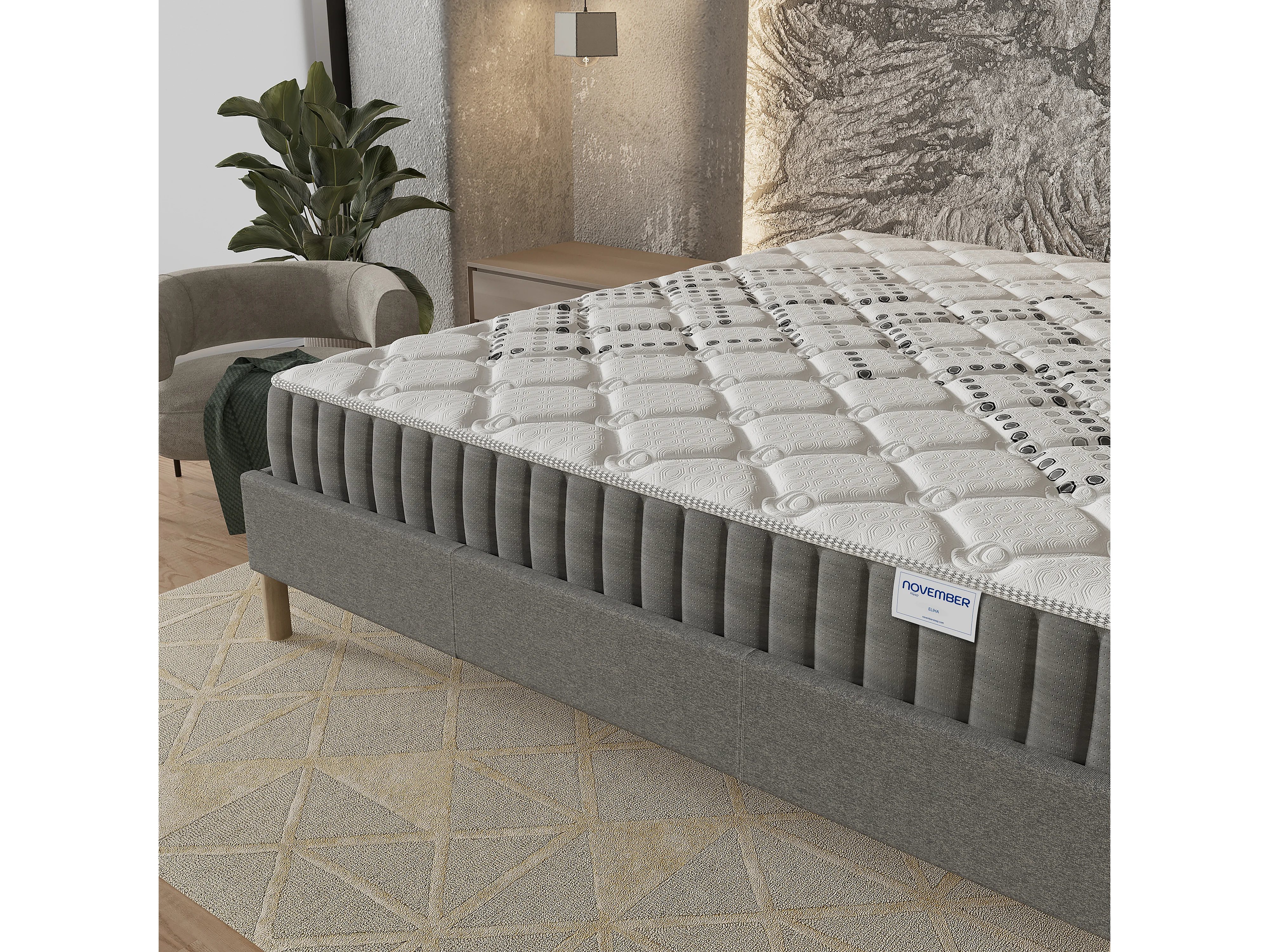Ensemble Matelas + lit 90x190 cm, Matelas 20cm ressorts ensachés, accueil mousse, lit à lattes en bois, tissu gris