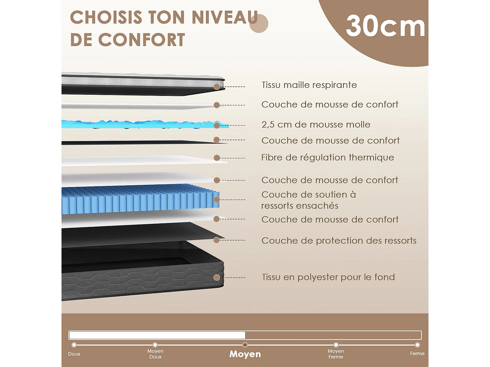 Ensemble matelas + sommier 90x190 cm, épaisseur du matelas 30 cm