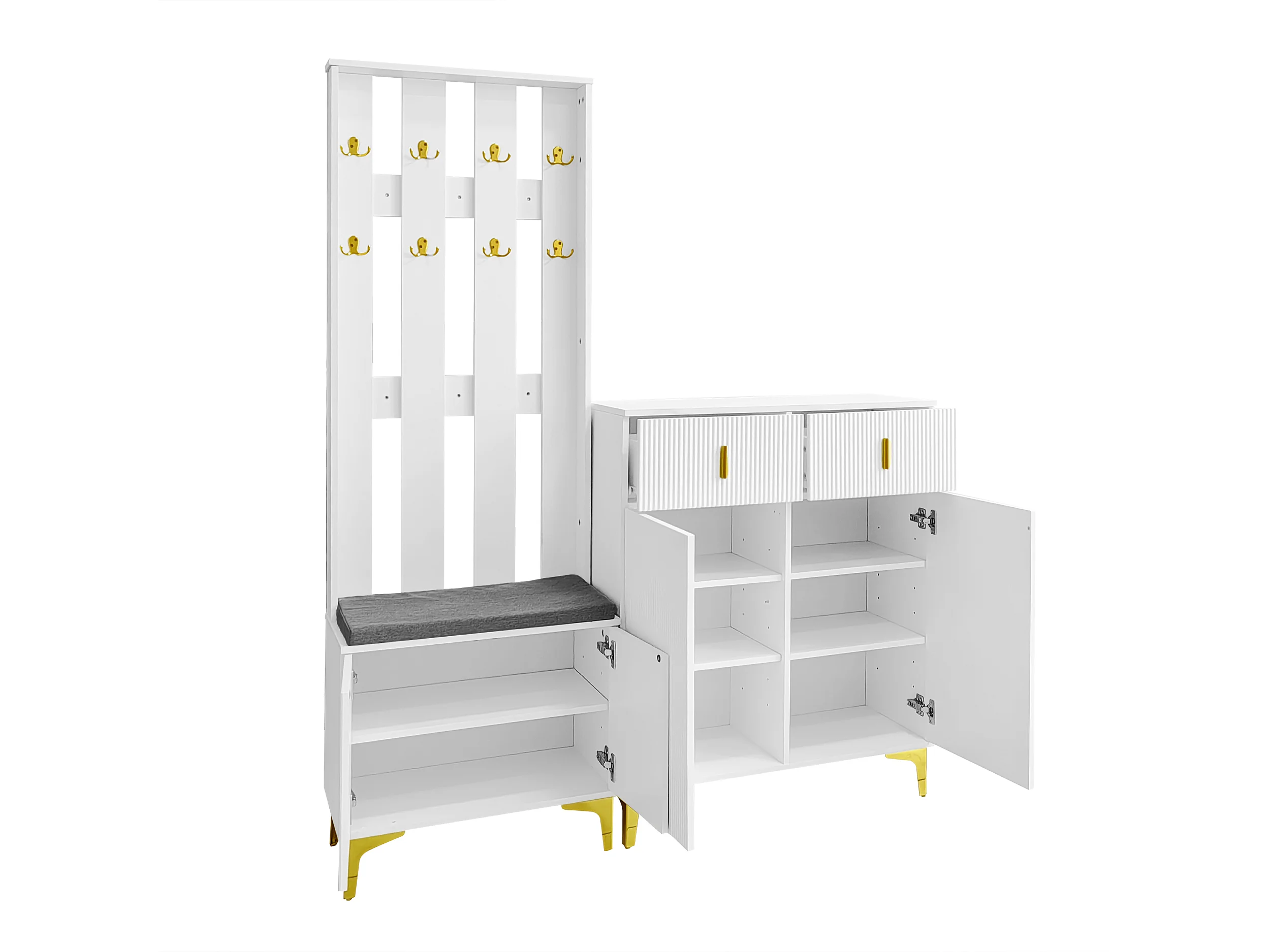 Ensemble meuble à chaussures et vestiaire - 4 portes, 2 tiroirs , banc et crochets - Blanc et doré