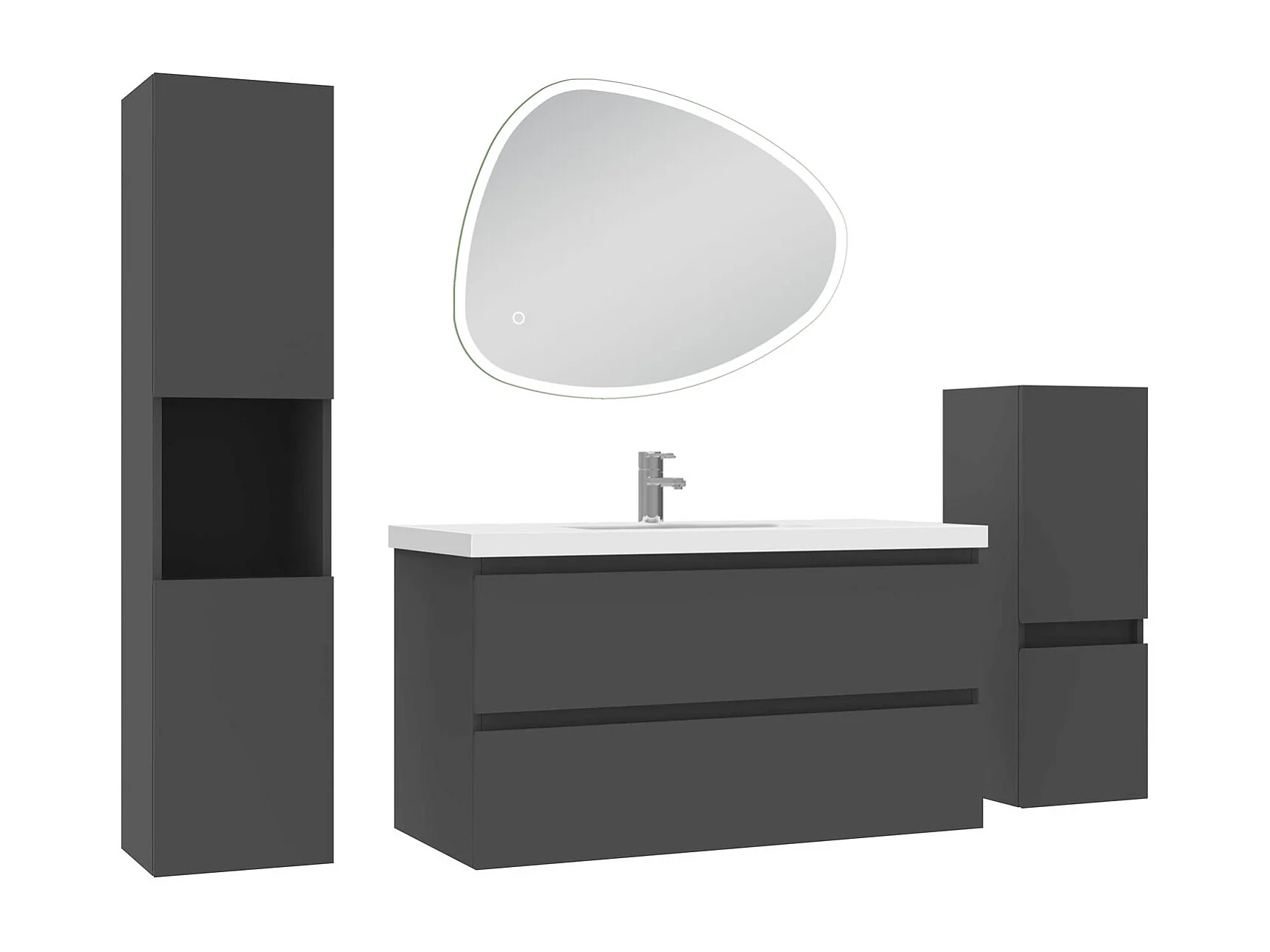 Ensemble meuble anthracite et lavabo L.100cm 2 tiroirs + colonne haute + colonne basse + miroir antibuée Asymétrique à LED 80x65cm-suspendu