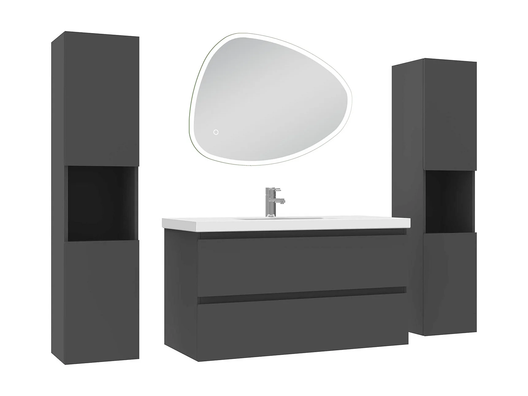 Ensemble meuble anthracite et lavabo L.100cm 2 tiroirs + colonne x 2 haute + miroir antibuée Asymétrique à LED 80x65cm-suspendu