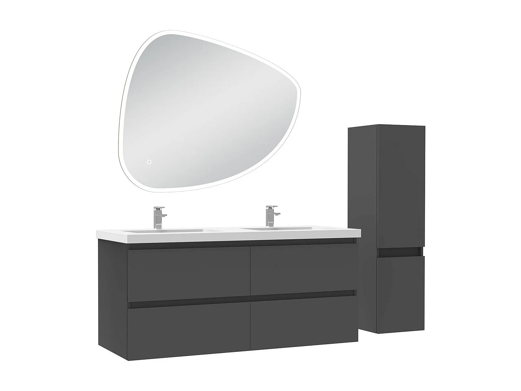 Ensemble meuble anthracite et vasque L.120cm 4 tiroirs + colonne + miroir antibuée Asymétrique à led 100x80cm-suspendu