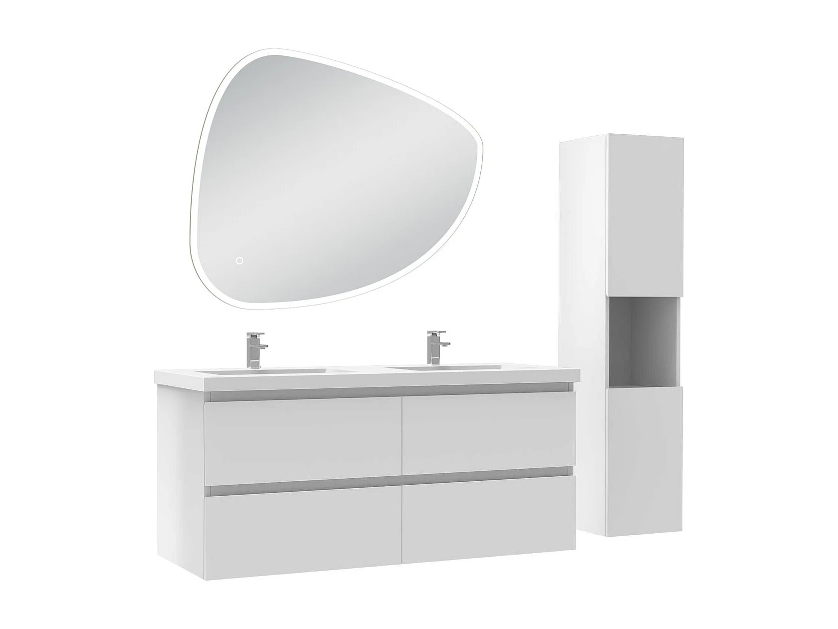 Ensemble meuble blanc et lavabo L.120cm 4 tiroirs + colonne haute + miroir antibuée Asymétrique à LED 100x80cm-suspendu