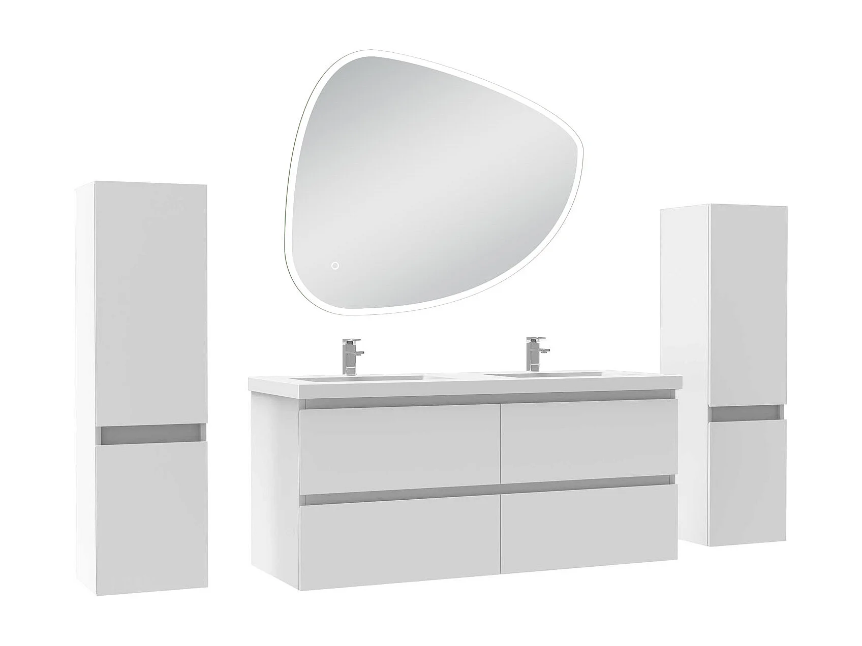 Ensemble meuble blanc et lavabo L.120cm 4 tiroirs + colonne x 2 + miroir antibuée Asymétrique à LED 100x80cm-suspendu