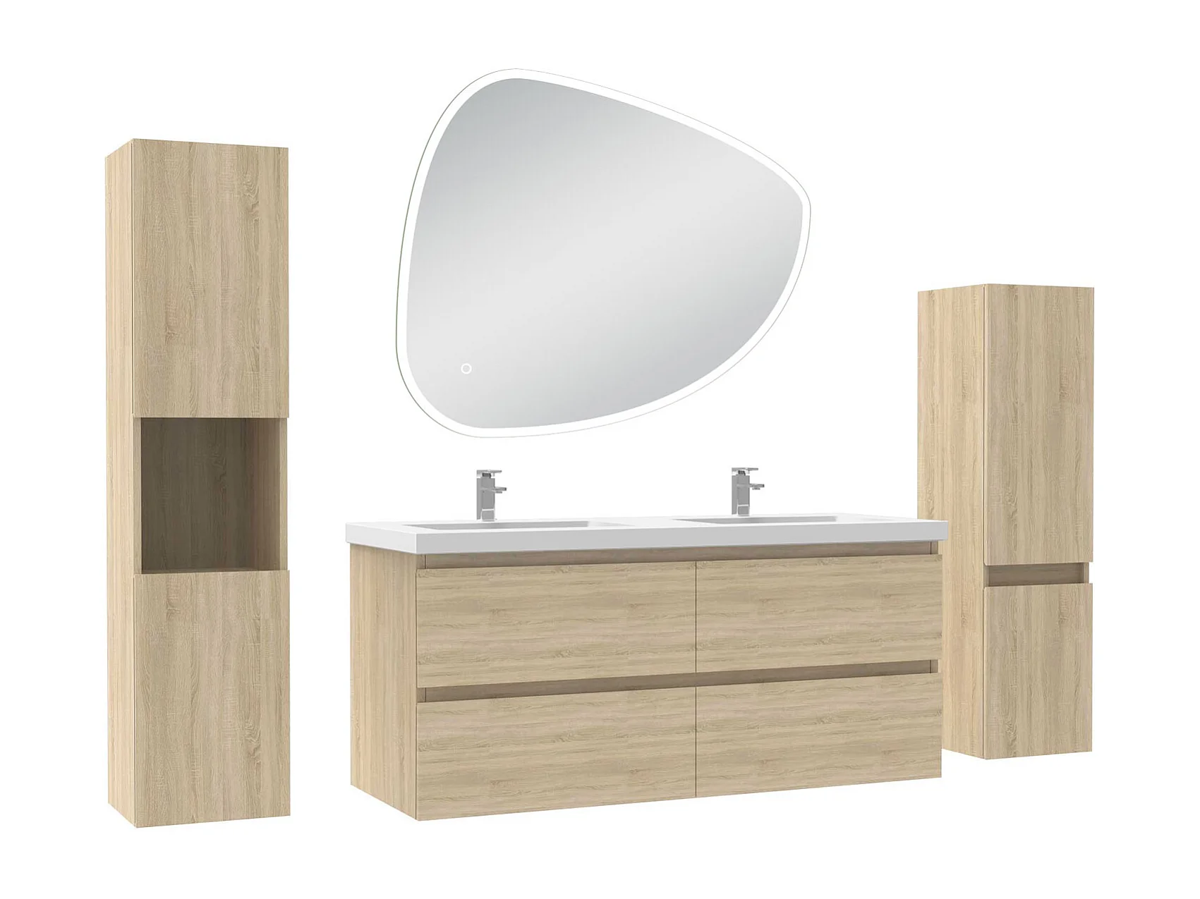 Ensemble meuble chêne et vasque L.120cm 4 tiroirs + colonne haute x 2 + miroir antibuée Asymétrique à led 100x80cm-suspendu