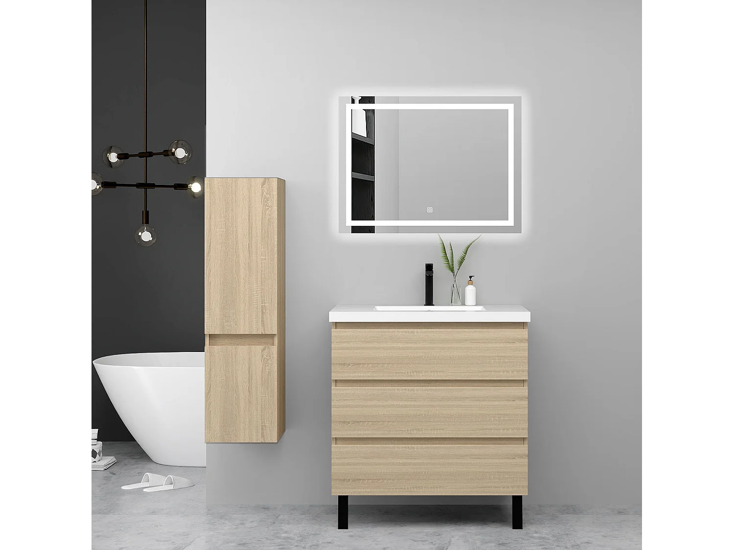 Ensemble meuble chêne et vasque L.80cm 3 tiroirs + colonne haute + miroir LED