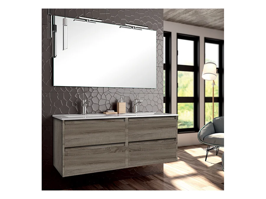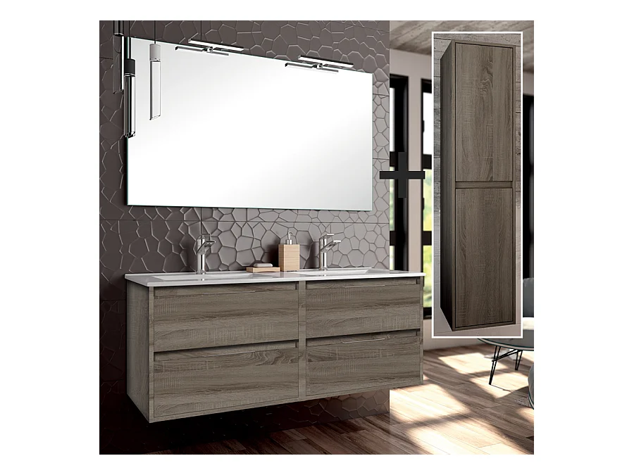 Ensemble meuble de salle de bain 120cm double vasque + colonne de rangement IRIS - britannia (chêne foncé)