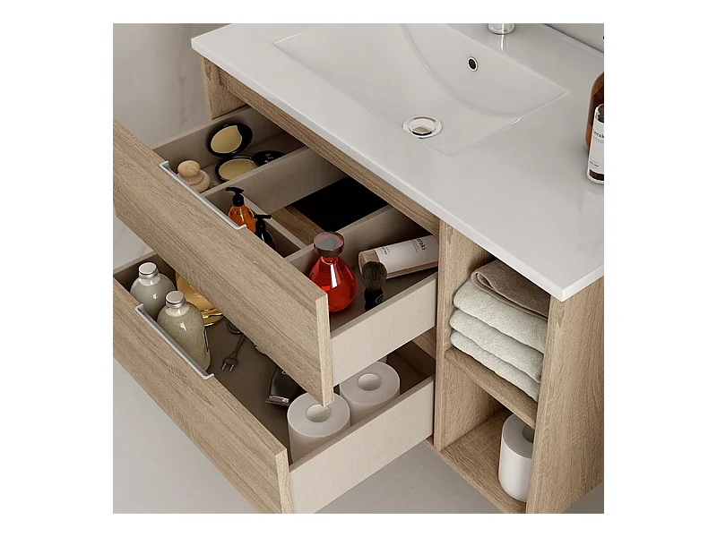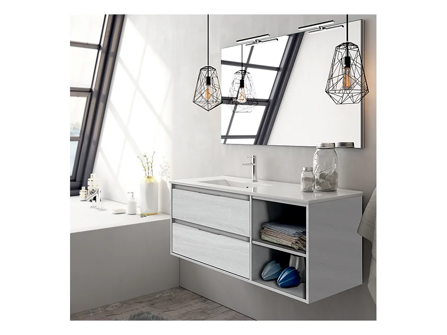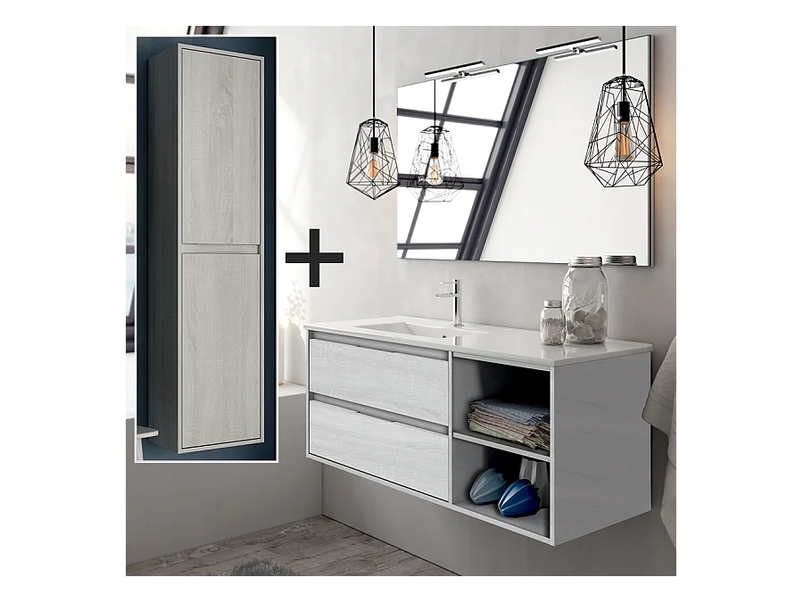 Ensemble meuble de salle de bain 120cm vasque déportée + colonne de rangement OLYMPE - hibernian (bois blanchi)