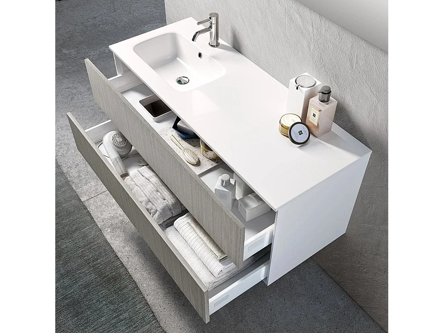 Ensemble meuble de salle de bain 2 tiroirs laqué blanc et beige et miroir à LED Goa L 120cm