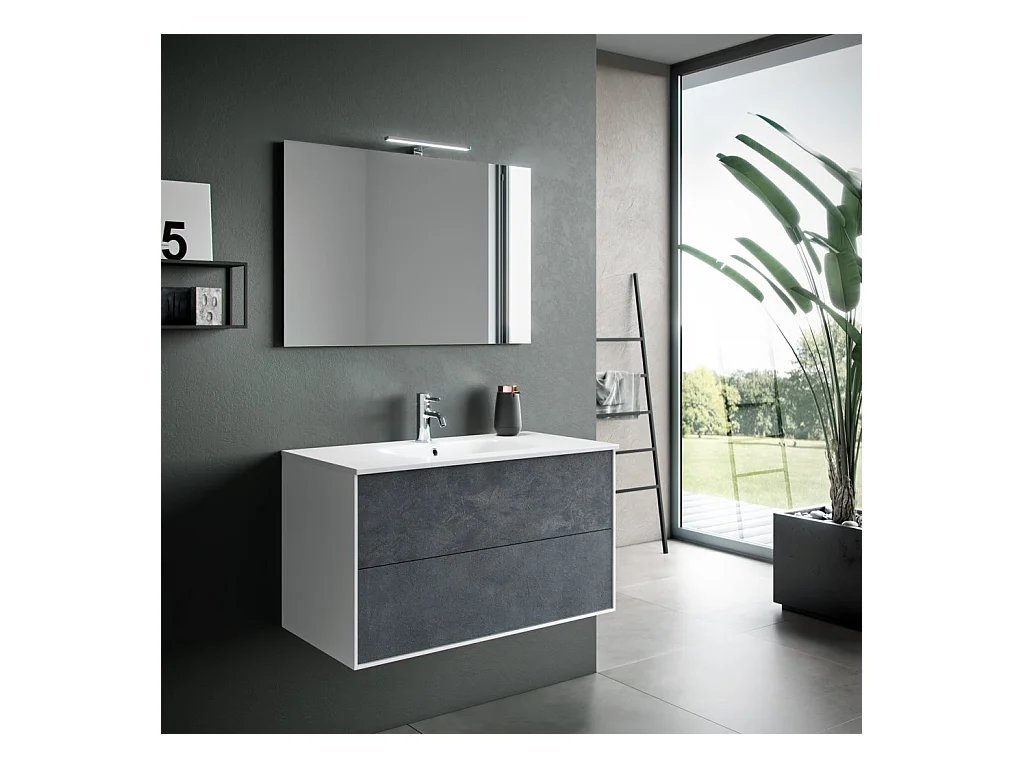 Ensemble meuble de salle de bain 2 tiroirs laqué blanc et bleu effet pierre et miroir à LED Oga L 100cm