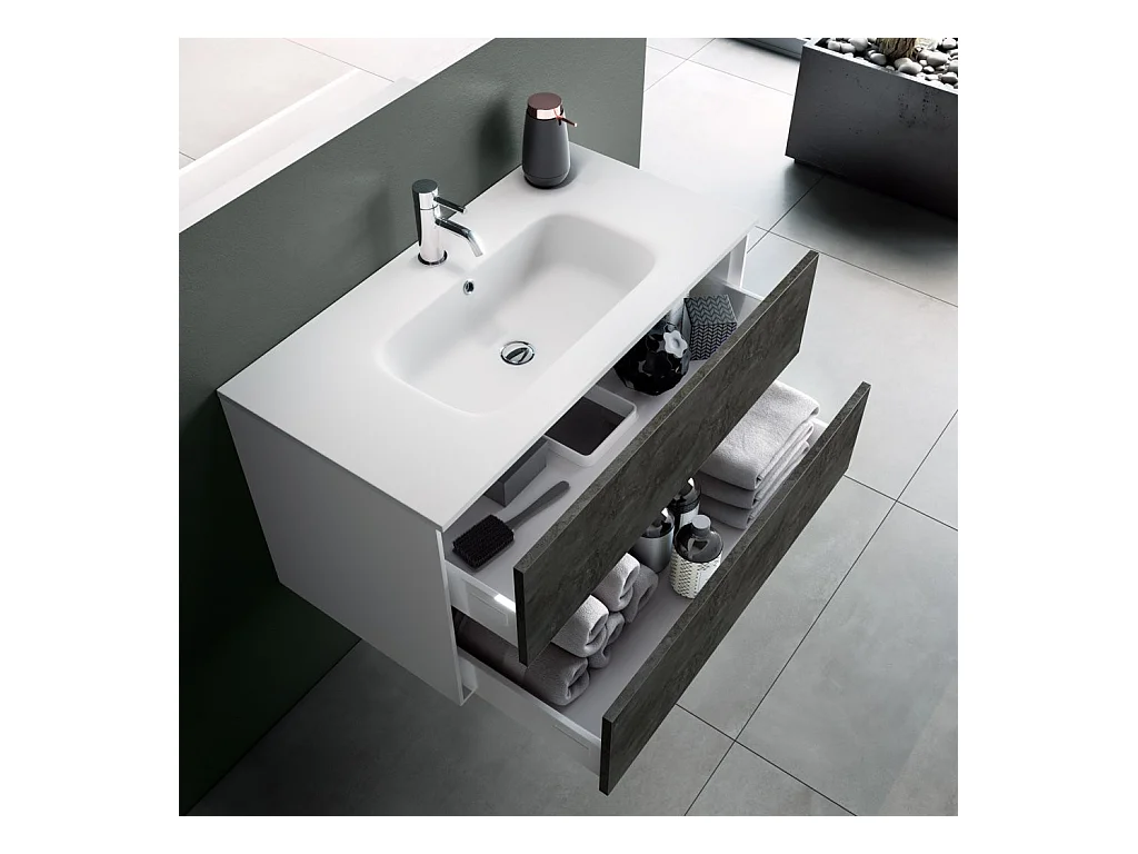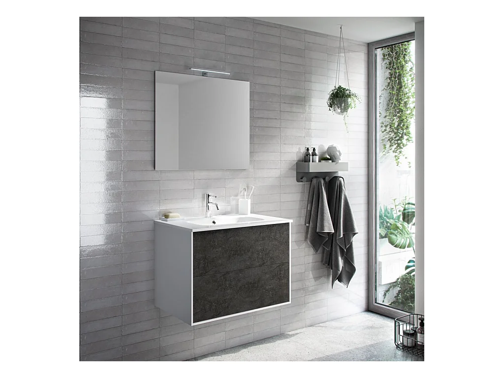 Ensemble meuble de salle de bain 2 tiroirs laqué blanc et gris oxyde et miroir à LED Oga L 80cm