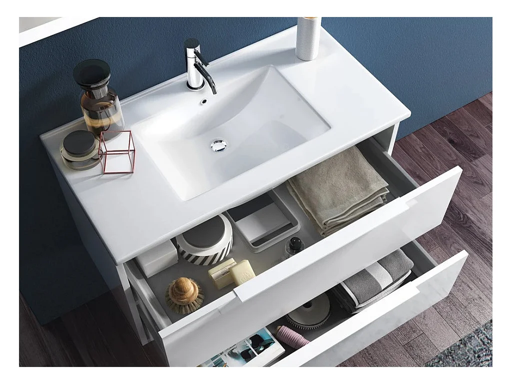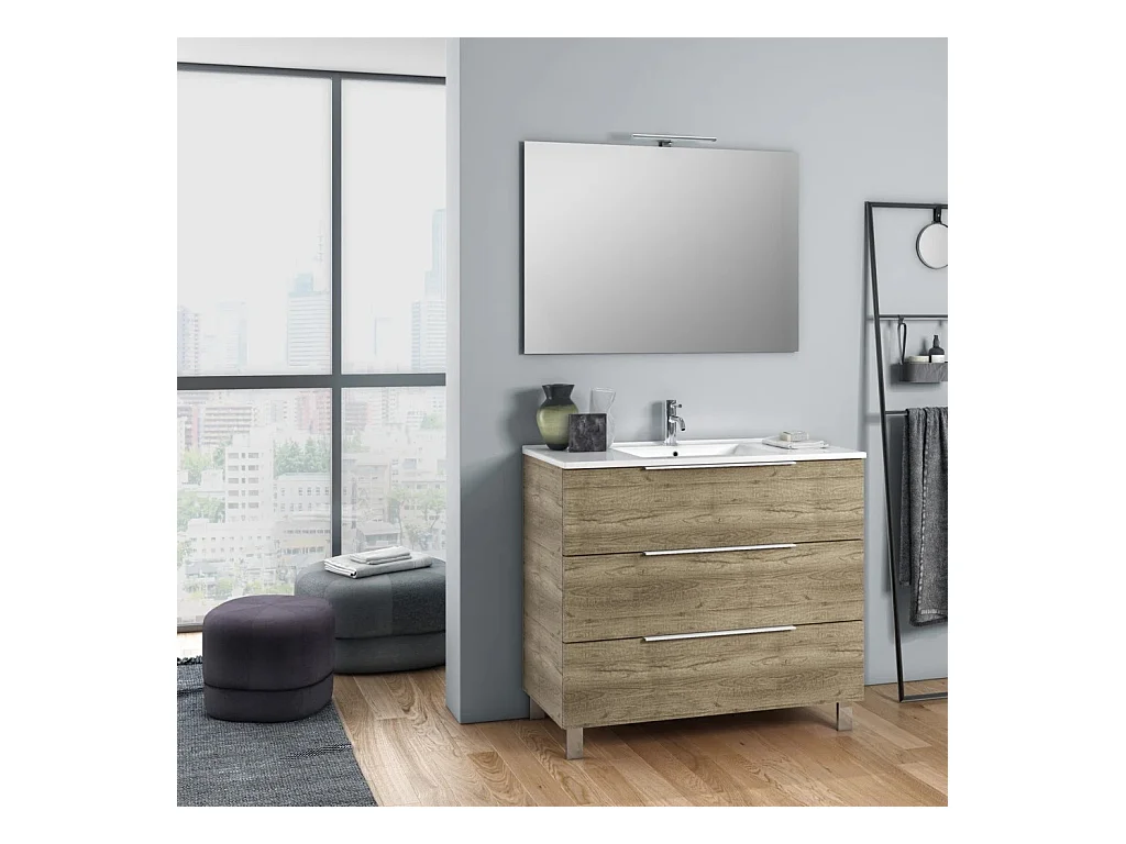 Ensemble meuble de salle de bain 3 tiroirs bois chêne clair et miroir lumineux Malo L 100cm